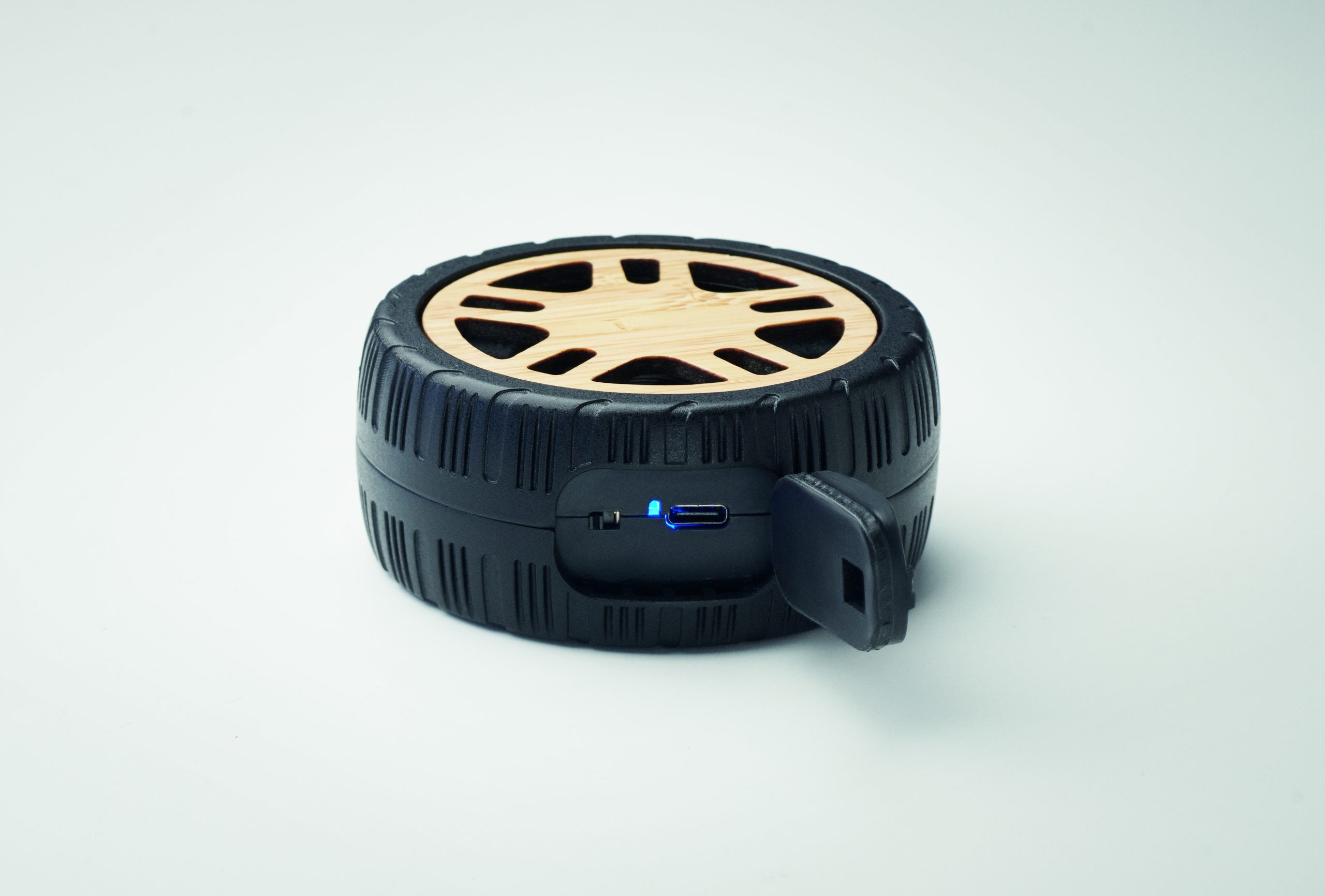 Bezprzewodowy głośnik 5.3 o mocy 3 W w kształcie koła samochodowego z recyklingowanego ABS z bambusowymi detalami i bawełnianym uchwytem. Akumulator 400 mAh.
