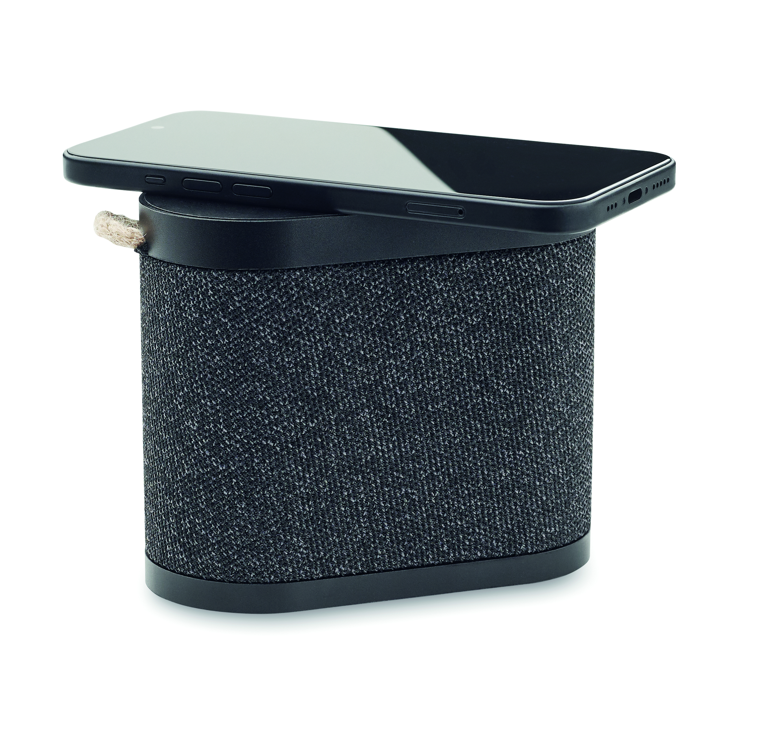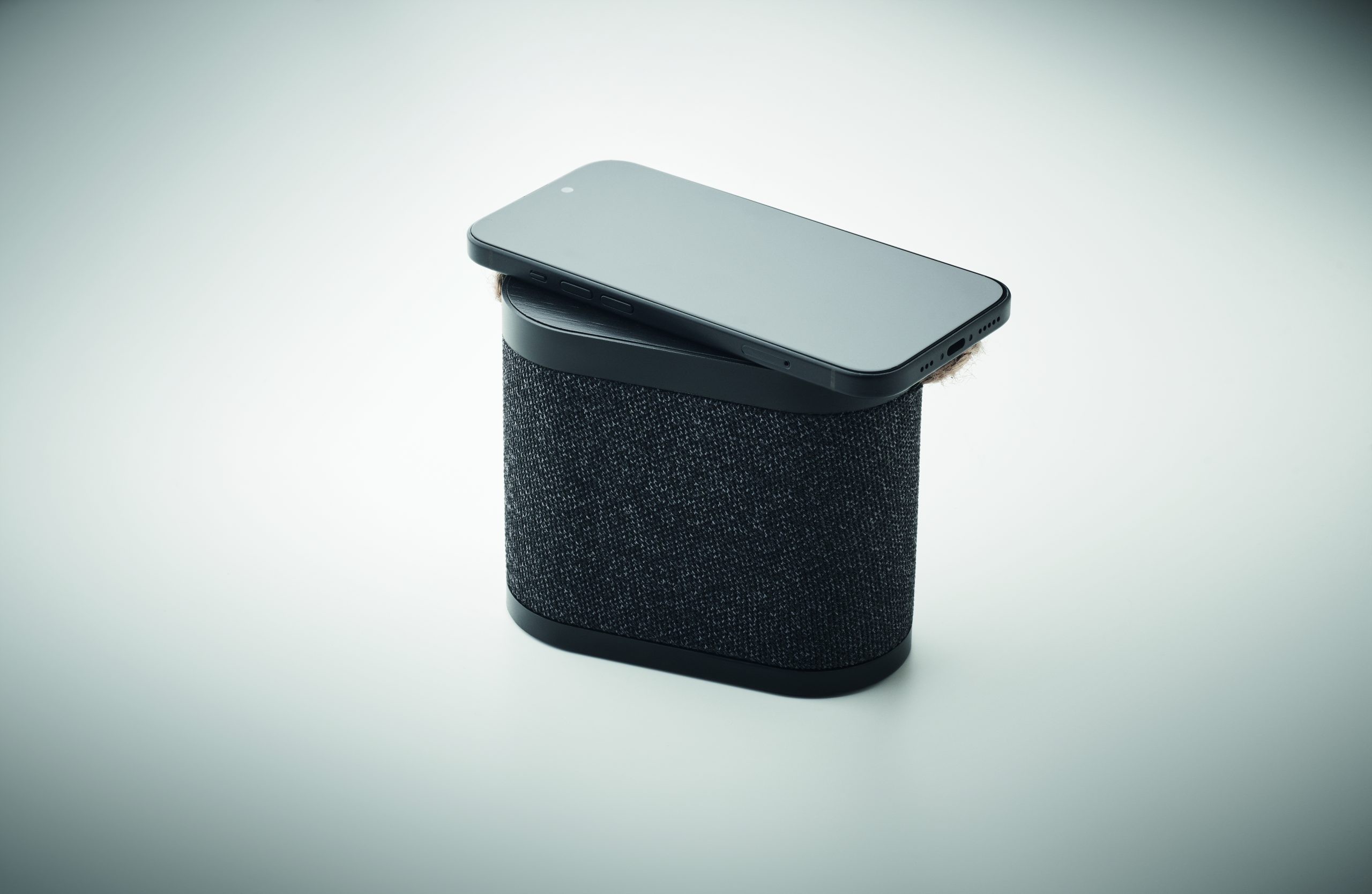 5.3 głośnik bezprzewodowy z ABS z wykończeniem z tkaniny poliestrowej RPET i bambusową ładowarką bezprzewodową 15 W, z uchwytem z juty. 1 akumulator litowo-jonowy 1200 mAh. Dane wyjściowe: 5W, 4 Ohm i 5V. Czas odtwarzania ok. 4 godz.