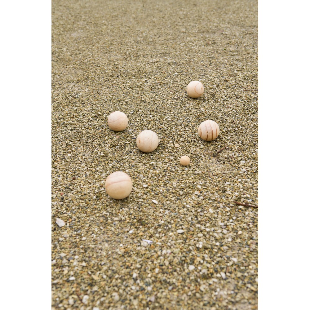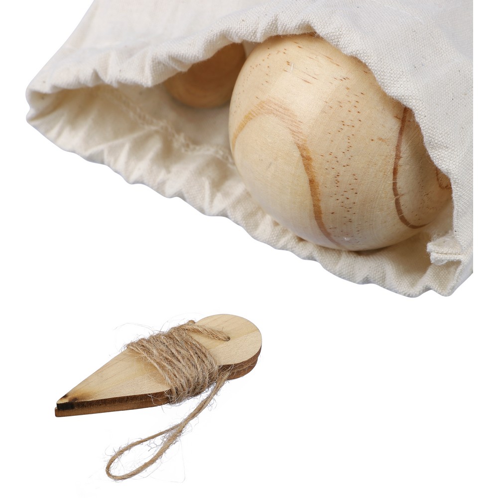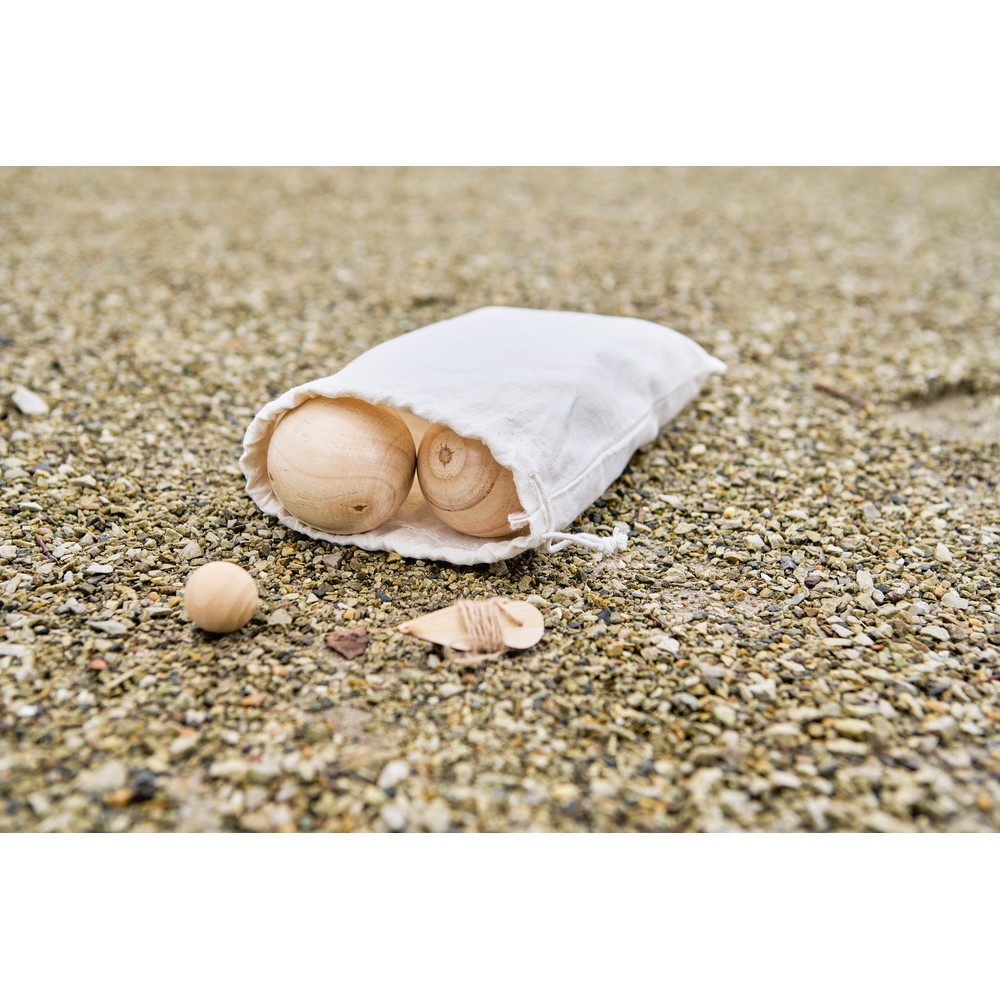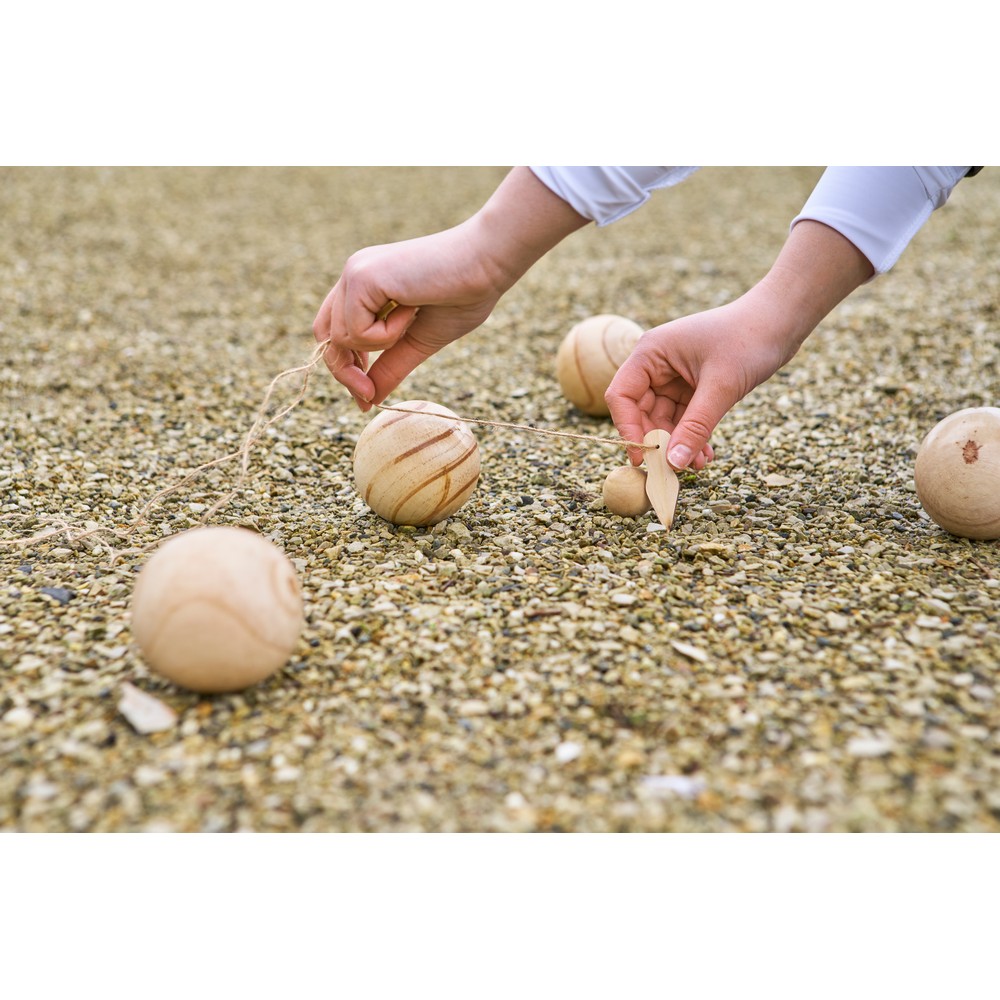 Gra zręcznościowa, zawierająca 6 kulek (po 7 cm każda) oraz 1 mniejszą kulkę (2 cm), w komplecie znajduje się również lina, całość jest zapakowana w bawełniany worek ze ściągaczem, odpowiednia dla 4-6 graczy, rozwija zręczność, produkt wykonany z drewna