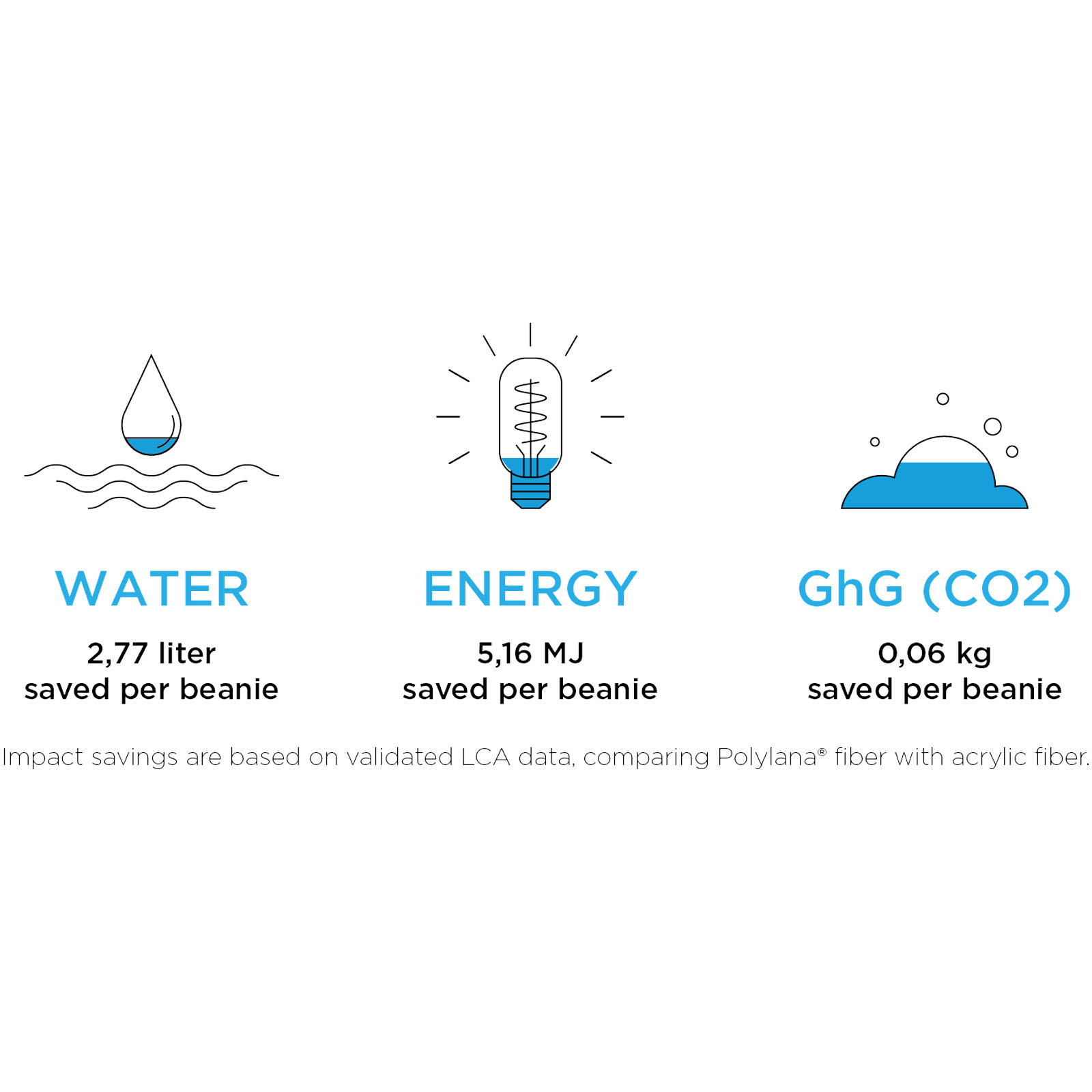 Czapka Hale jest wykonana z włókna Polylana® – niskoemisyjnej alternatywy dla 100% włókien akrylowych i wełnianych – oszczędzając wodę, energię i redukując emisję CO2 podczas procesu produkcji i barwienia. W porównaniu z włóknem akrylowym, każda czapka Hale pozwala zaoszczędzić 2,77 litra wody, 5,16 MJ energii i 0,06 kg GhG (CO2). Oszczędności są oparte na zweryfikowanych danych oceny cyklu życia (LCA). Wykonana z dzianiny ściągaczowej 1×1 z włóknem Polylana® i akrylem o gęstości 12. Idealny wybór dla tych, którzy cenią modę, a jednocześnie dbają o środowisko.