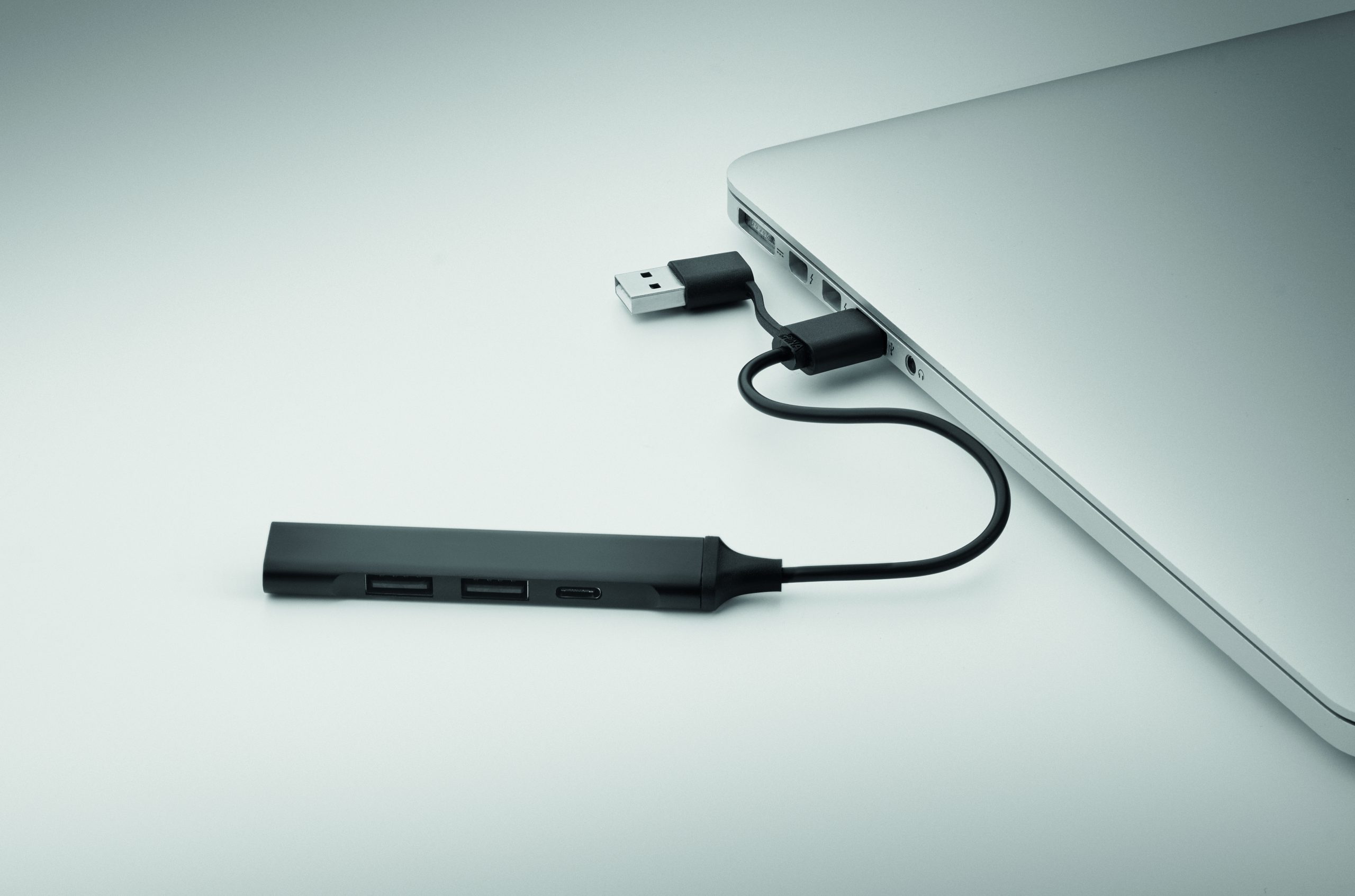 4-portowy hub USB z aluminium pochodzącego z recyklingu. 3 USB-A + 1 Type-C. Wejście: 2 w 1 Type-C i Type-A. Długość kabla: 19 cm.