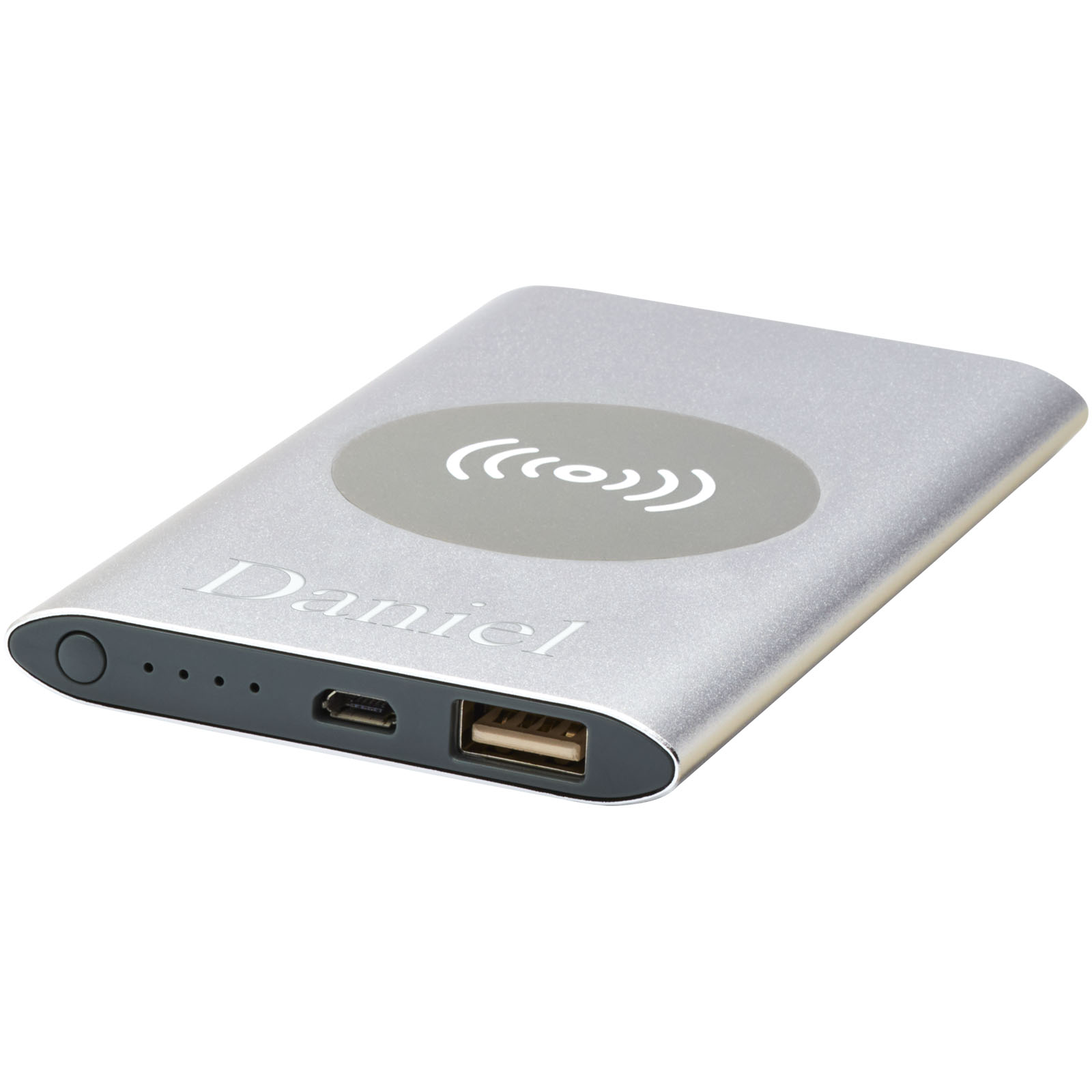 Powerbank o pojemności 4000 mAh z aluminiową obudową. Obsługuje bezprzewodowe ładowanie o mocy 5 W, a także ma wyjście micro USB umożliwiające ładowanie za pomocą kabla. Dzięki litowo-polimerowej baterii o pojemności 4000 mAh może w pełni naładować smartfona. Wskaźnik zasilania, który pokazuje poziom energii przez cały czas. Wbudowany port micro USB: Wyjście 5 V / 2 A: 5V/2A. Bezprzewodowa moc wyjściowa: W zestawie wolny od PVC kabel ładujący z tworzywa TPE. Dostarczane w ozdobnym pudełku upominkowym.