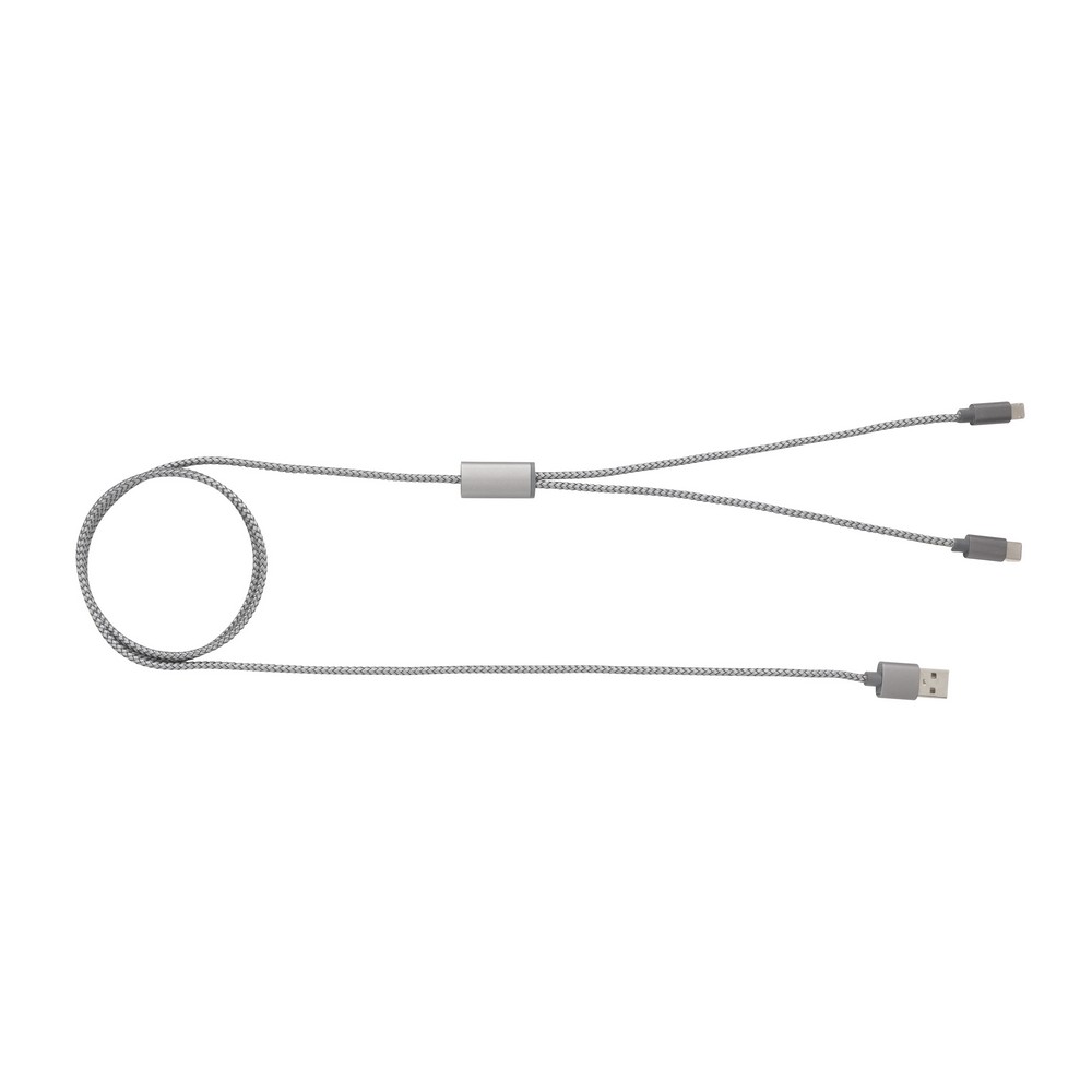 Pleciony kabel do ładowania 3 w 1 z 3 końcówkami: USB, typu C i 2 w 1 (micro USB oraz kompatybilną z urządzeniami iOS), wykonany z plecionego nylonu, długość 120 cm, ślad węglowy produktu: 0,24 kg CO2