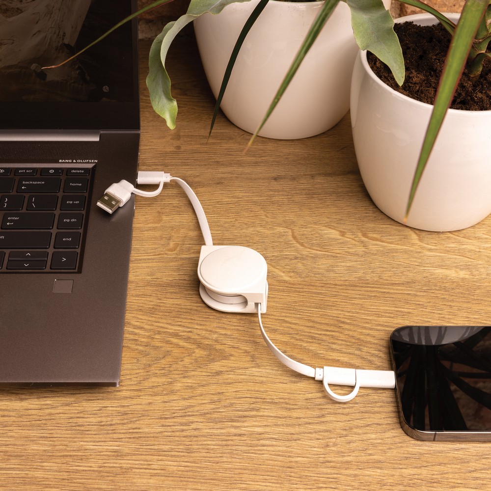 Zwijany kabel do ładowania z 4 końcówkami: USB, 2 x typu C i 2 w 1 (micro USB oraz kompatybilną z urządzeniami iOS), obudowa wykonana z ABS pochodzącego z recyklingu, posiadają certyfikat RCS (Recycled Claim Standard), który jest stosowany gdy produkt jest wykonany częściowo lub w całości z materiałów pochodzących z recyklingu, nie zawiera PVC, ślad węglowy produktu: 0,16 kg CO2