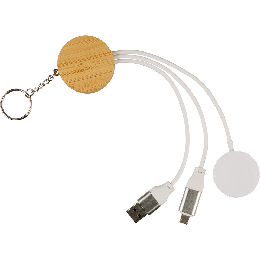 Kabel do ładowania 65W, brelok, ładowarka do smartwatcha, końcówki USB-A, USB-C, kompatybilna z urządzeniami iOS, zapakowany pojedynczo w brązowy kartonik, produkt wykonany z TPE, metalu i bambusa