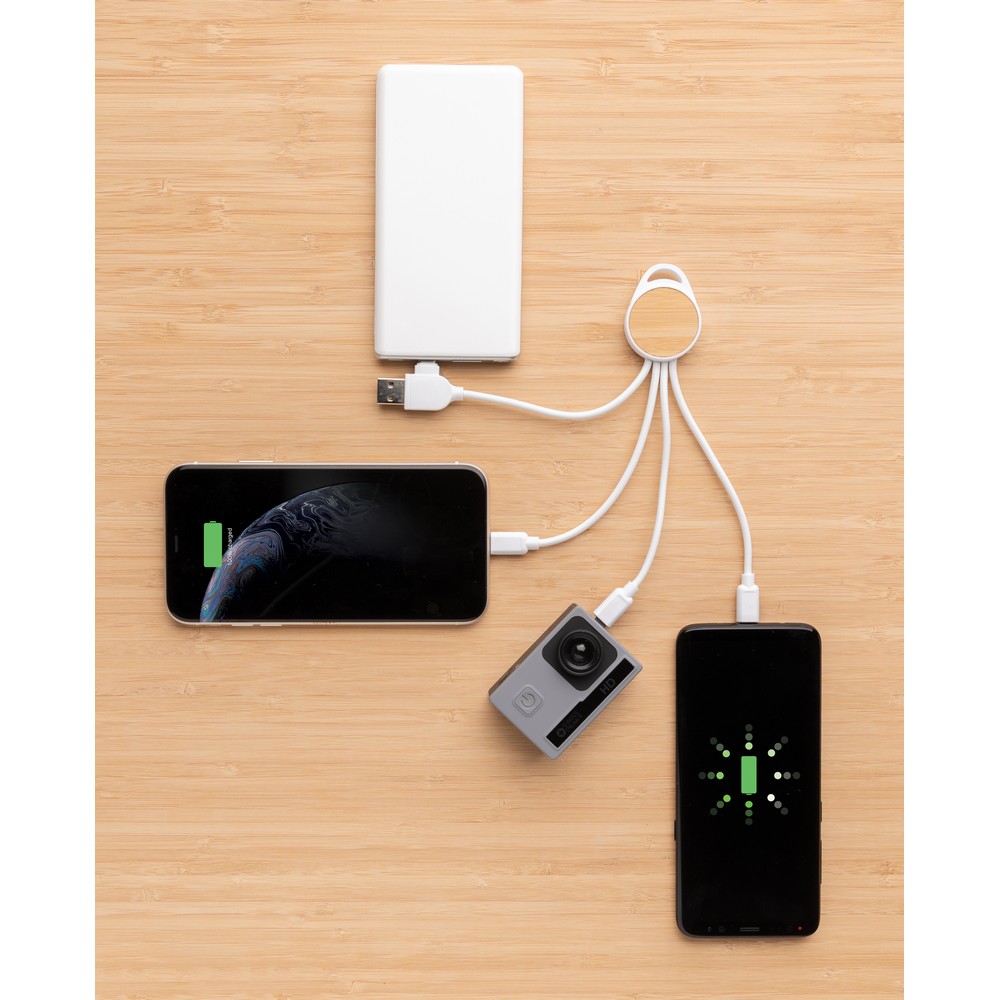 Kabel do ładowania, końcówki: USB, 2 x USB C, micro USB, iOS, obudowa wykonana z bambusa z certyfikatem FSC® i ABS z recyklingu, kabel wykonany z TPE z recyklingu, kabel i obudowa posiadają certyfikaty RCS, długość 20 cm, nie zawiera PVC, ślad węglowy produktu: 0,15 kg CO2