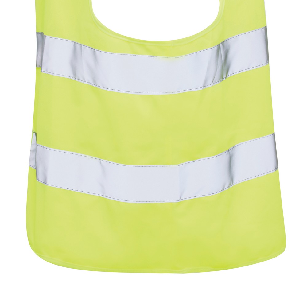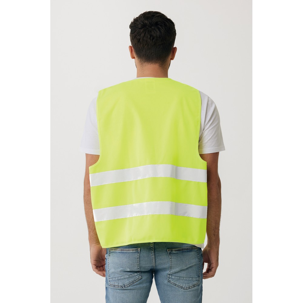 Kamizelka odblaskowa, wykonana z PET z recyklingu, całkowita zawartość materiałów obliczona na podstawie wagi całkowitej przedmiotu: 76%, zgodna z normami EN ISO 20471:2013+A1:2016, UE 2016/425/UE, ślad węglowy produktu: 0,98 kg CO2