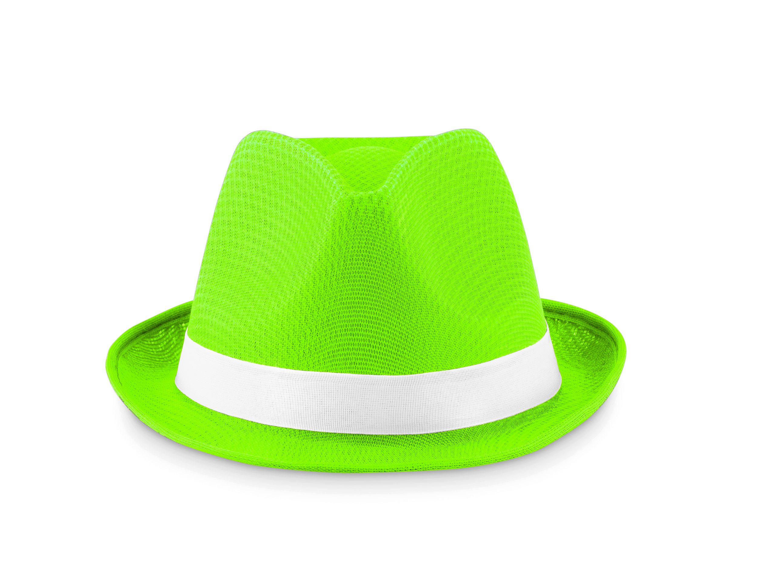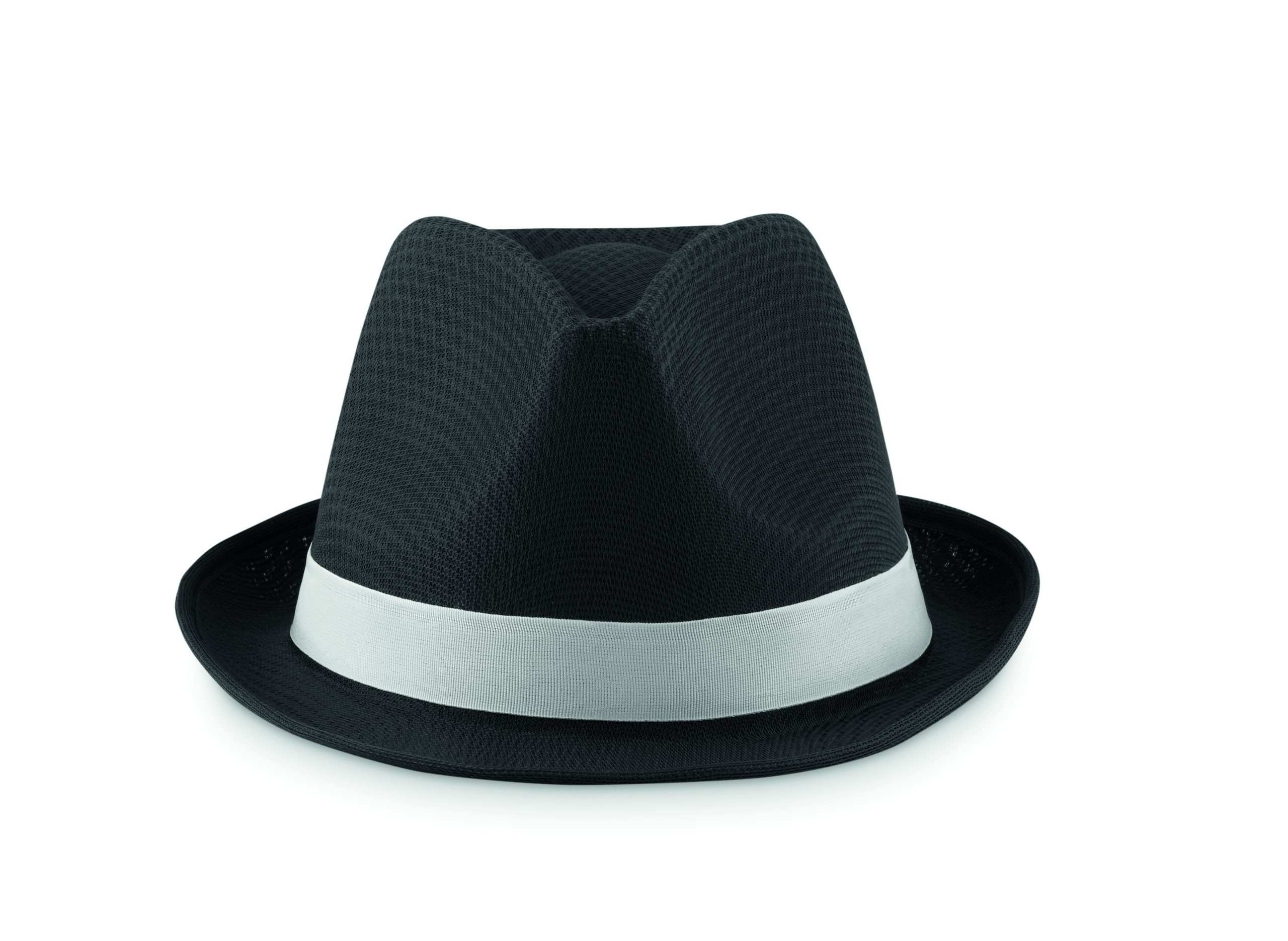 Kolorowy kapelusz z poliestrowej słomki z białą opaską. W przypadku zamówień bez nadruku taśma będzie dostarczona osobno.