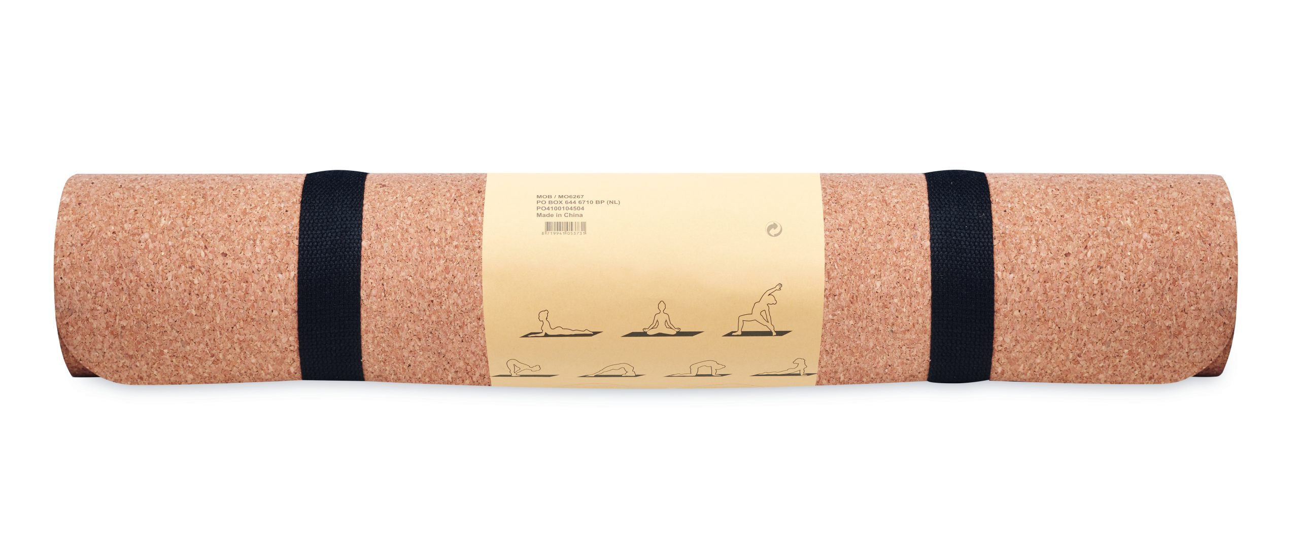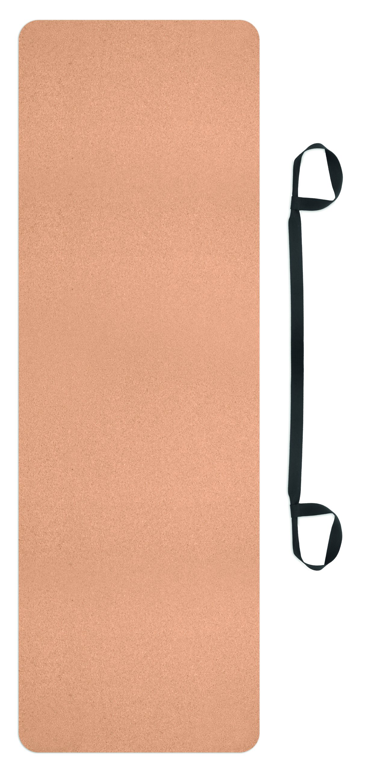 Mata do ćwiczeń jogi wykonana z korka i tworzywa TPE, zapakowana w papierową obwolutę z instrukcją. Grubość 0,4 cm. W komplecie bawełniany uchwyt na linę/taśmę do ćwiczeń. Korek jest materiałem w 100% naturalnym. Ze względu na jego strukturę i porowatość powierzchni ostateczny wygląd nadruku na każdym artykule może się różnić.