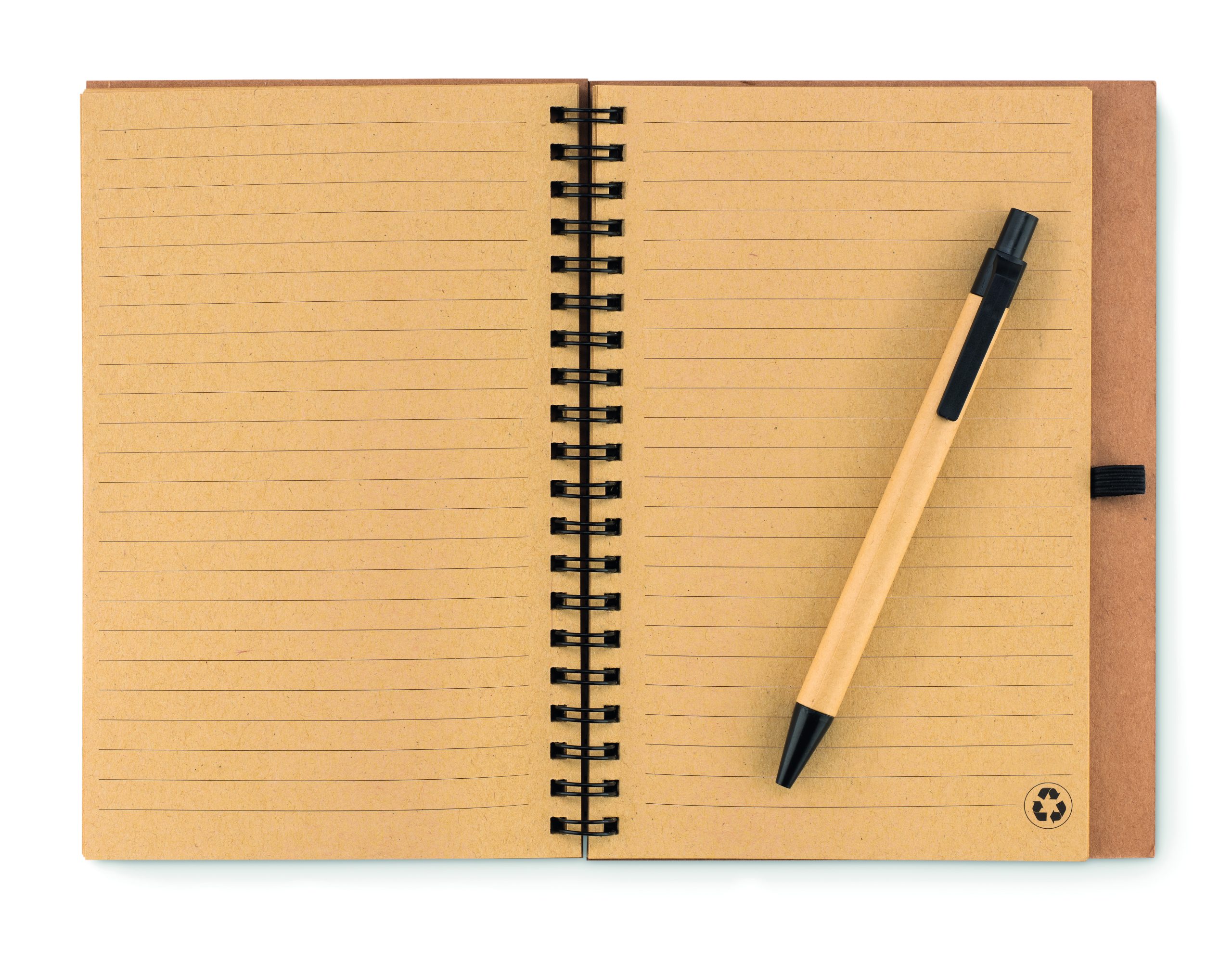 Notatnik korkowy z długopisem. Miękka korkowa okładka. Podwójna spirala. 140 stron w linie z papieru z recyklingu (70 kartek). Dopasowany długopis z przyciskiem, korpus z kartonu pochodzącego z recyklingu i elementy z PLA kukurydzy. Czarny tusz. Elastyczny uchwyt na długopis. Korek jest materiałem w 100% naturalnym. Ze względu na jego strukturę i porowatość powierzchni ostateczny wygląd nadruku na każdym artykule może się różnić.