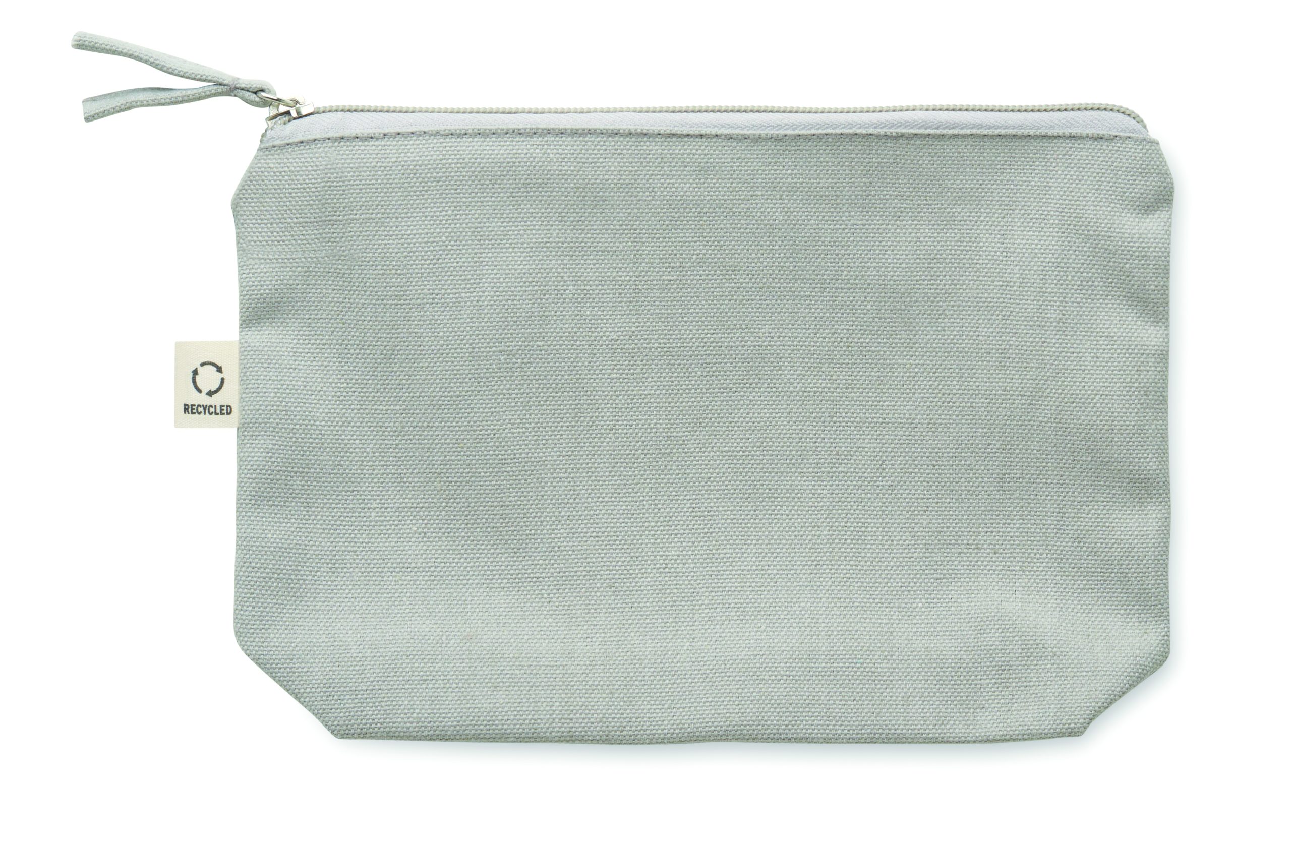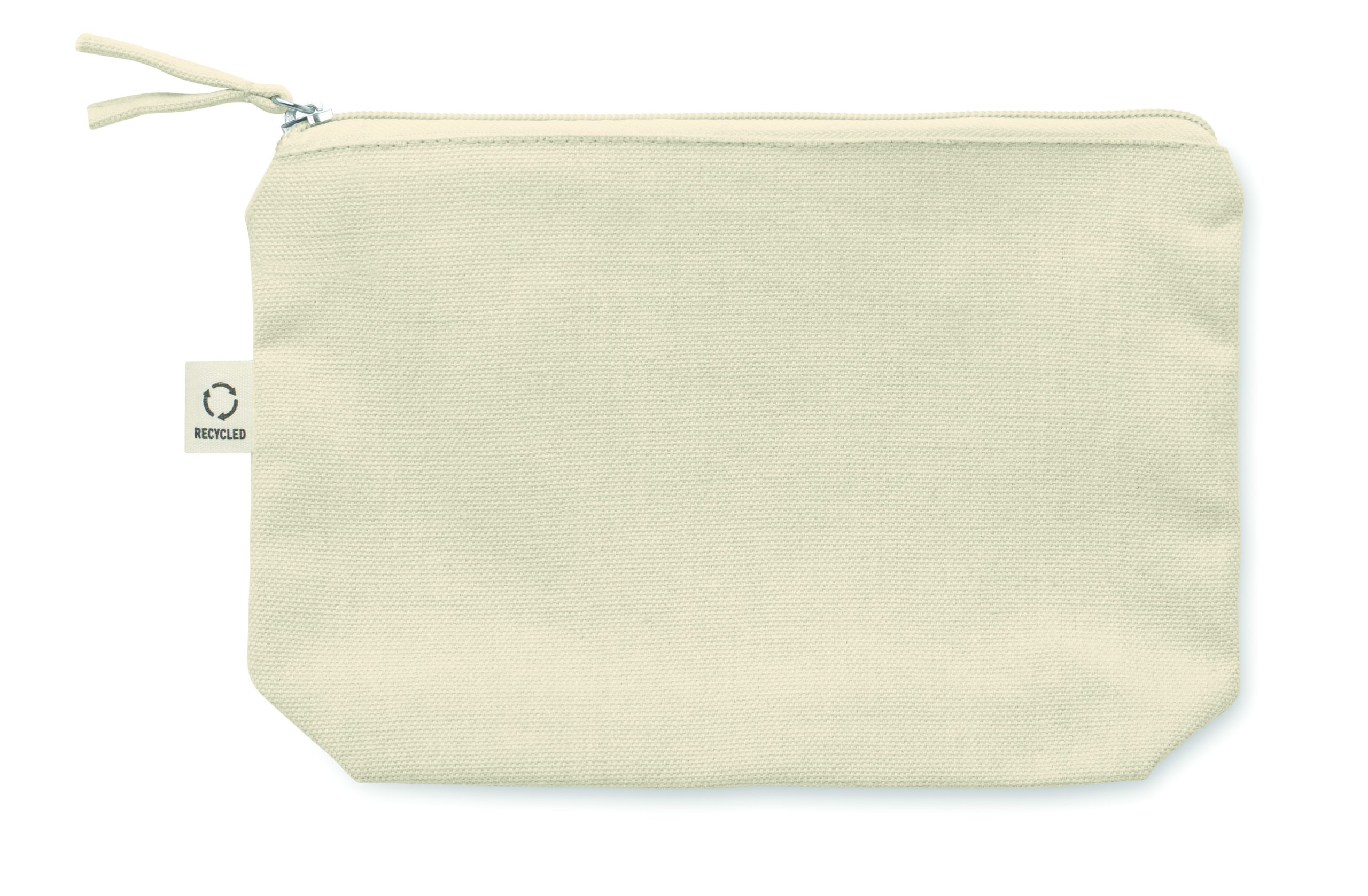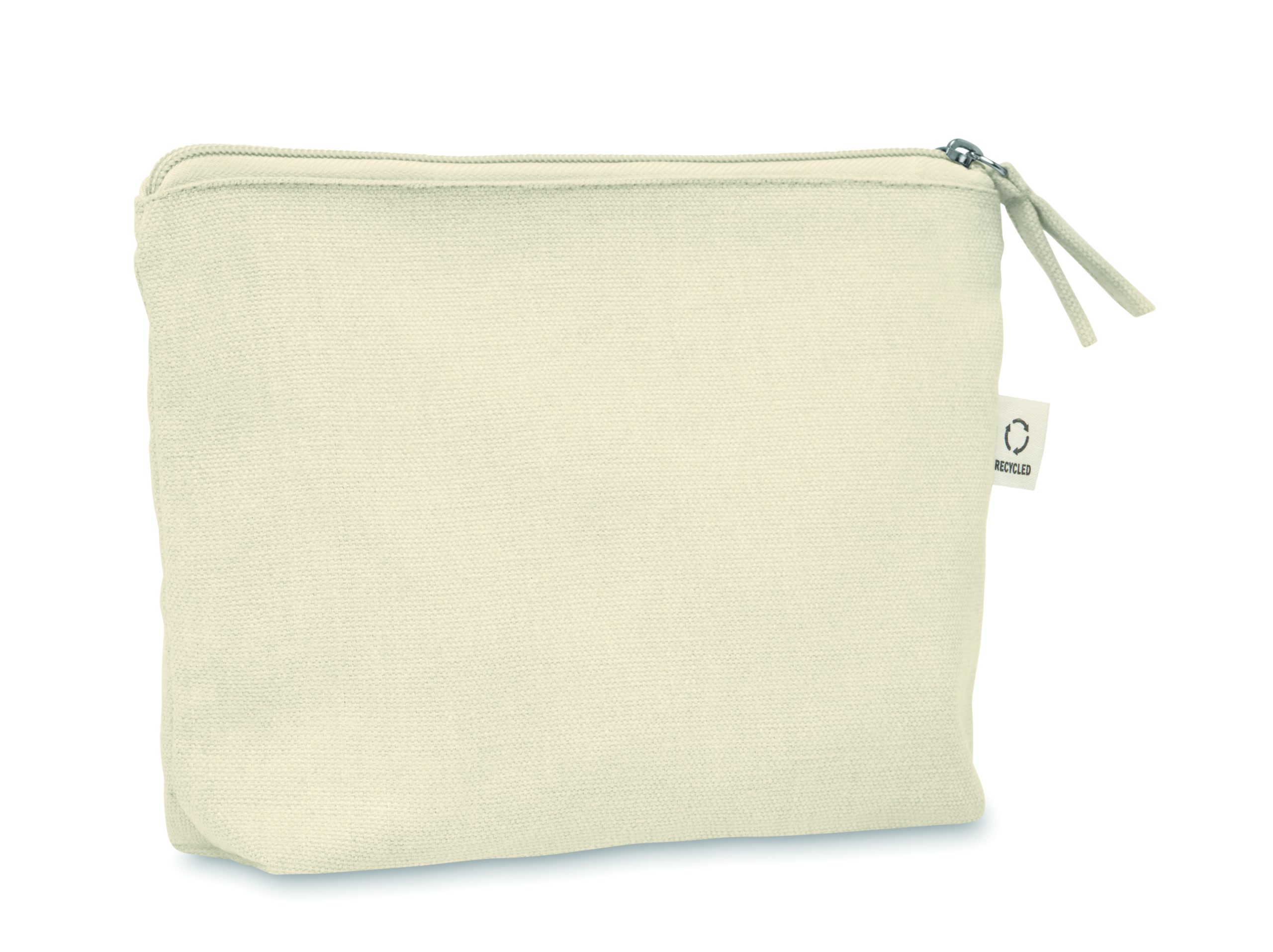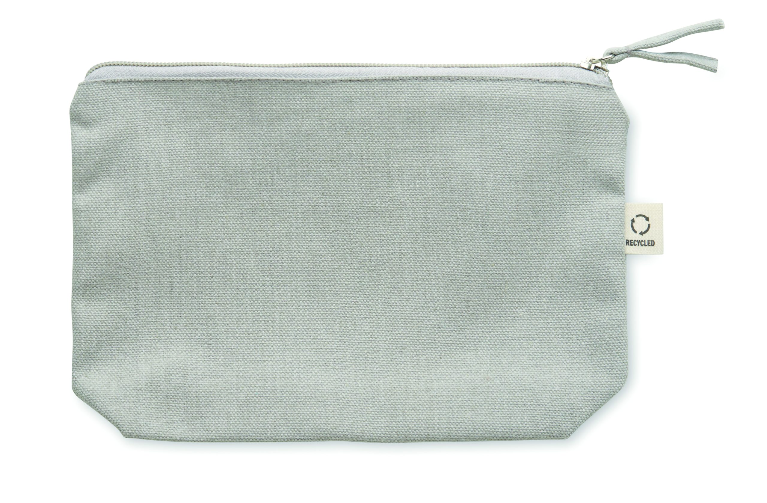 Torebka na kosmetyki lub inne akcesoria z materiału z recyklingu (70% bawełny z recyklingu i 30% poliestru RPET) z dopasowanym zamkiem błyskawicznym. 320 gr/m². Ten produkt może się kurczyć po zadrukowaniu.