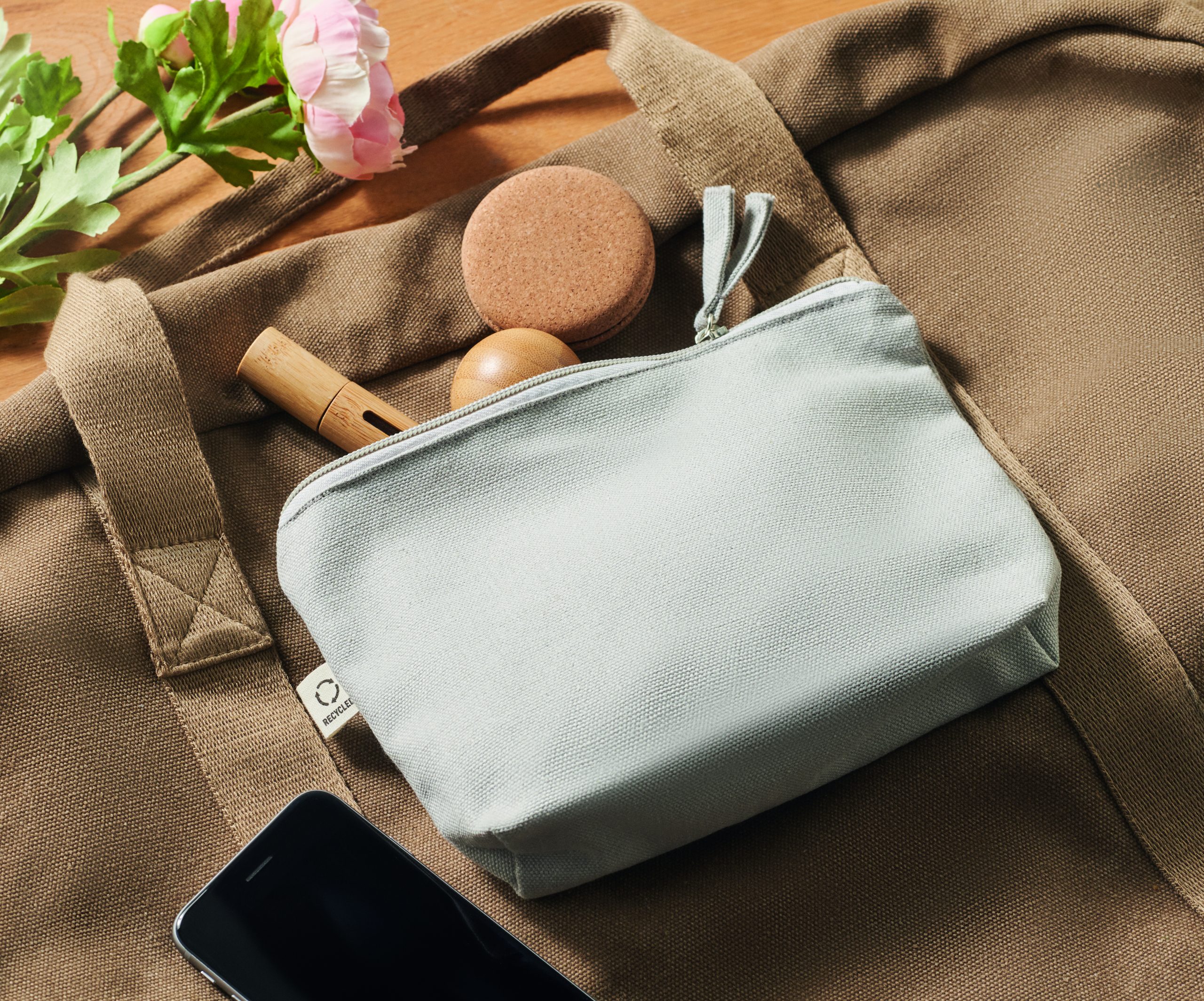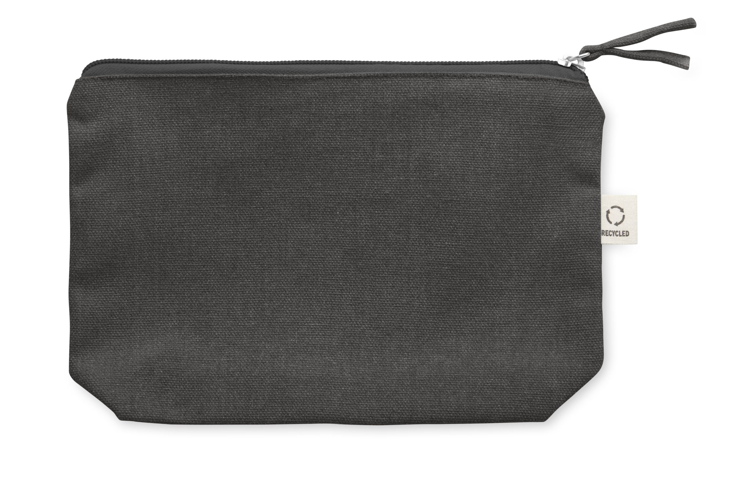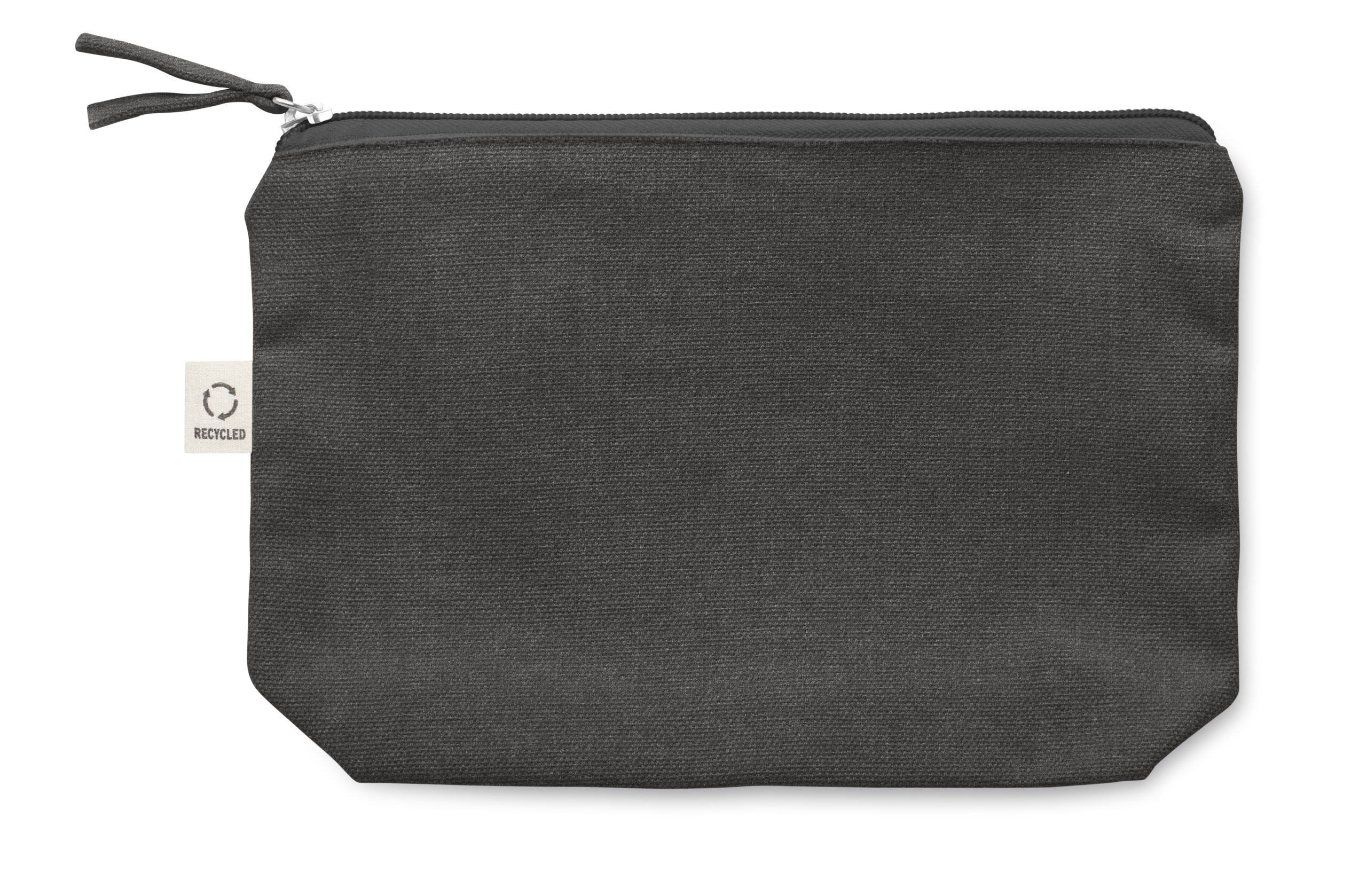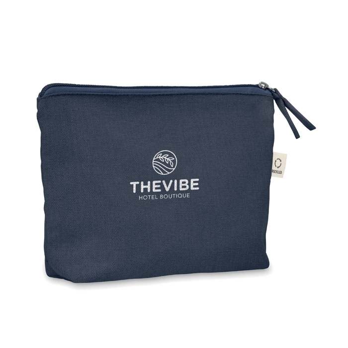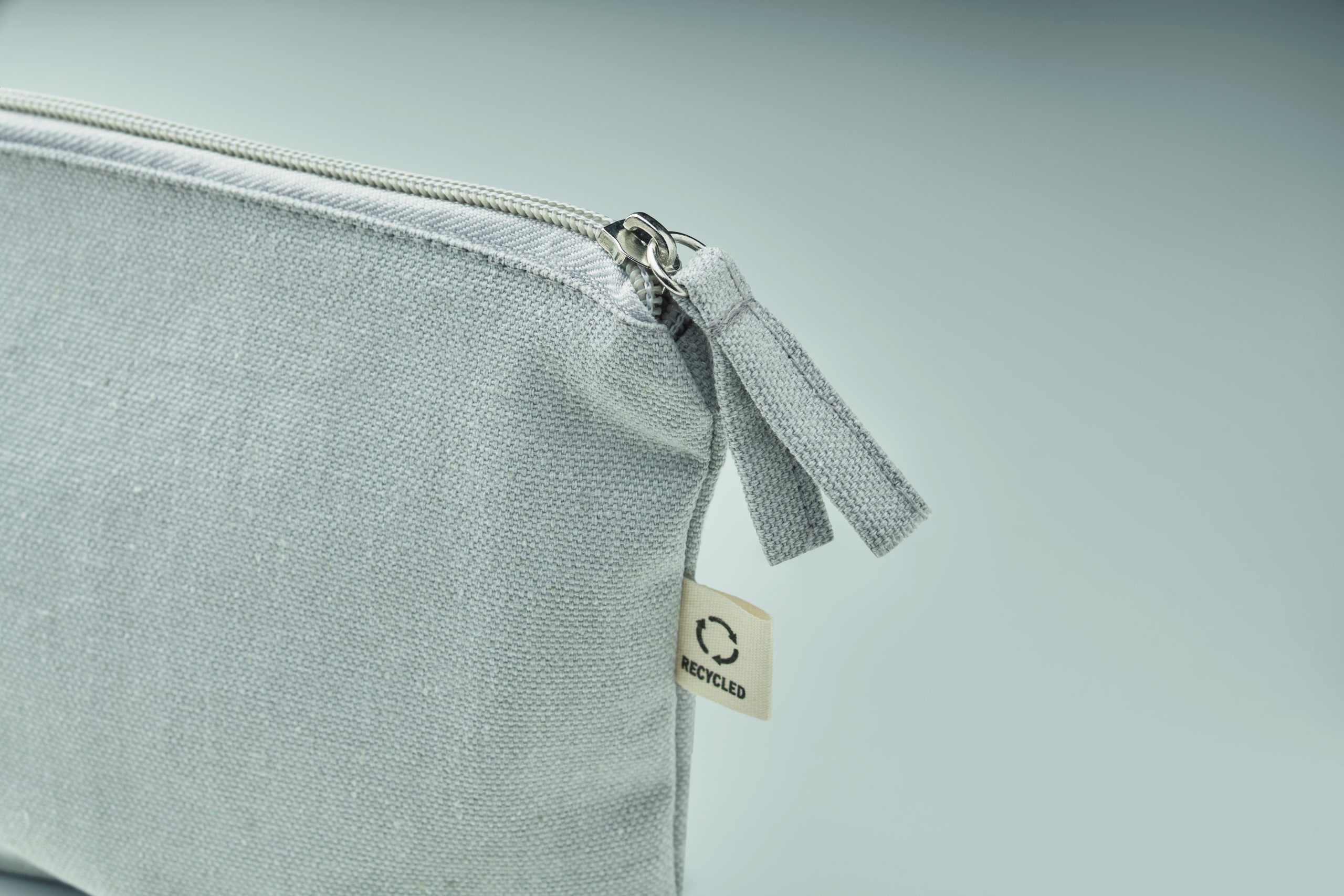 Torebka na kosmetyki lub inne akcesoria z materiału z recyklingu (70% bawełny z recyklingu i 30% poliestru RPET) z dopasowanym zamkiem błyskawicznym. 320 gr/m². Ten produkt może się kurczyć po zadrukowaniu.