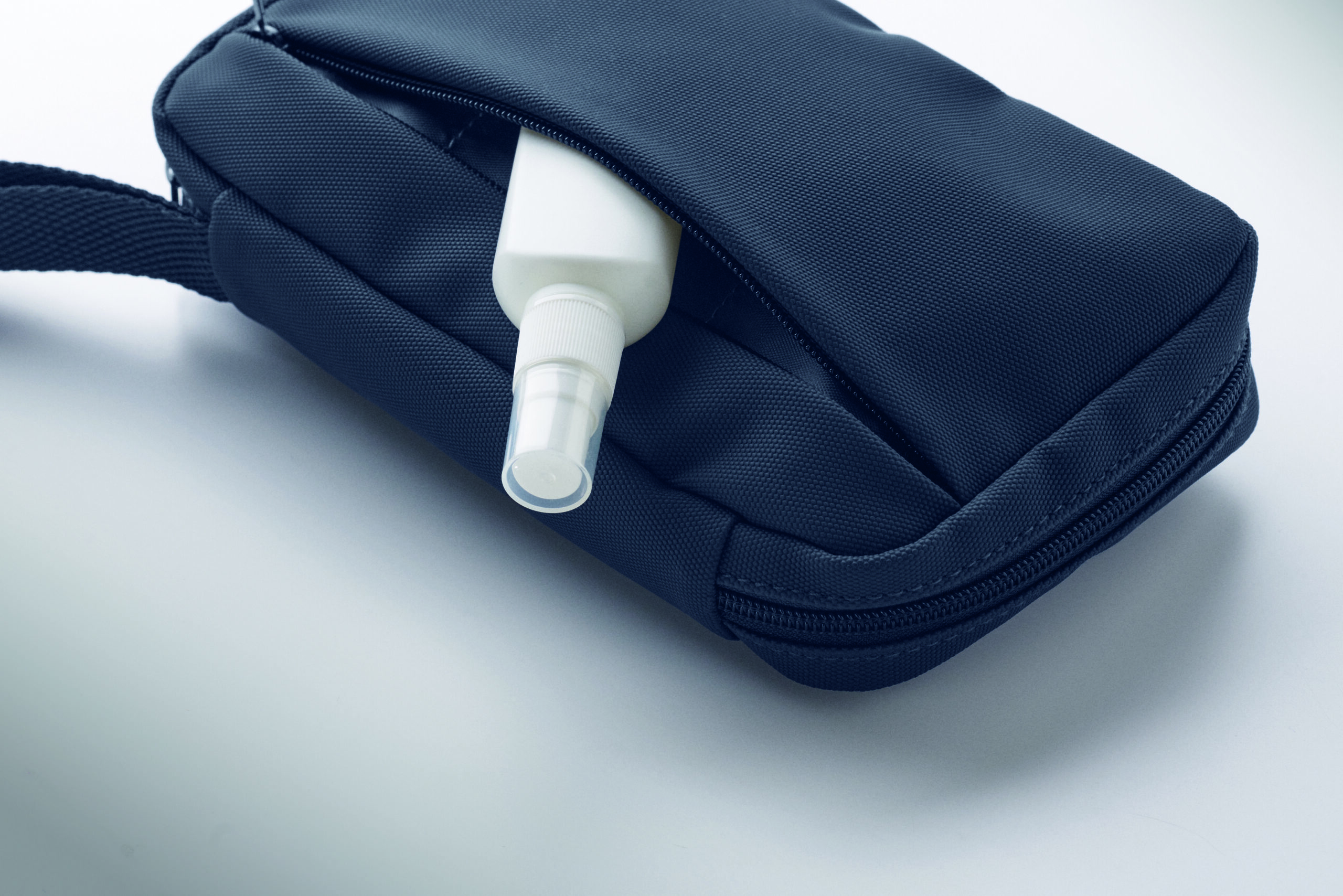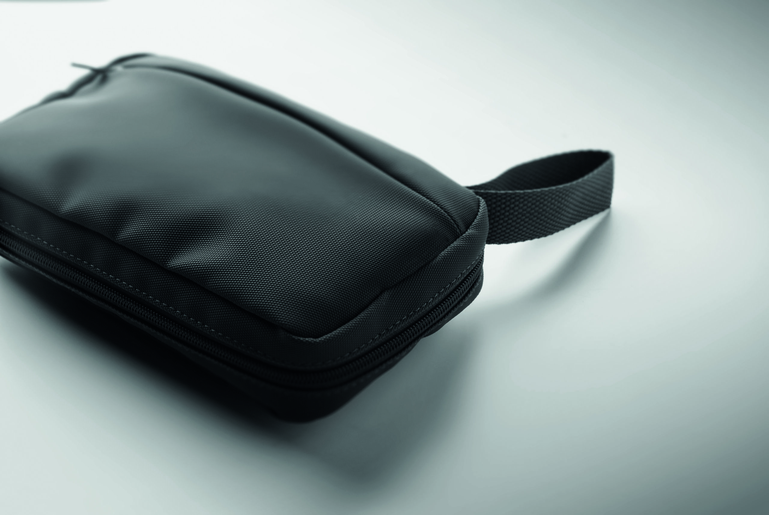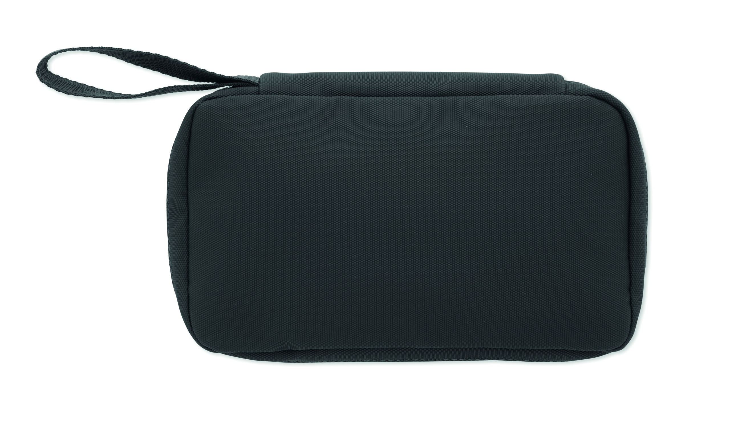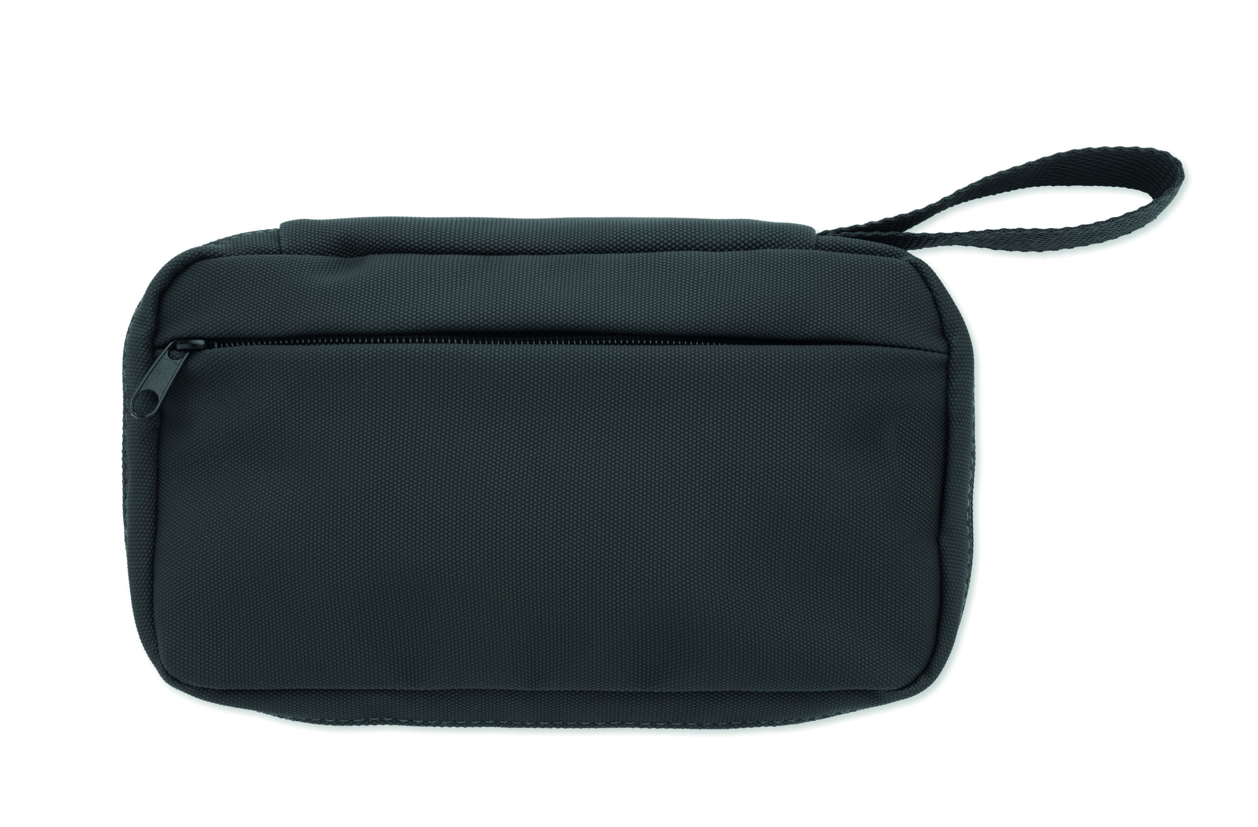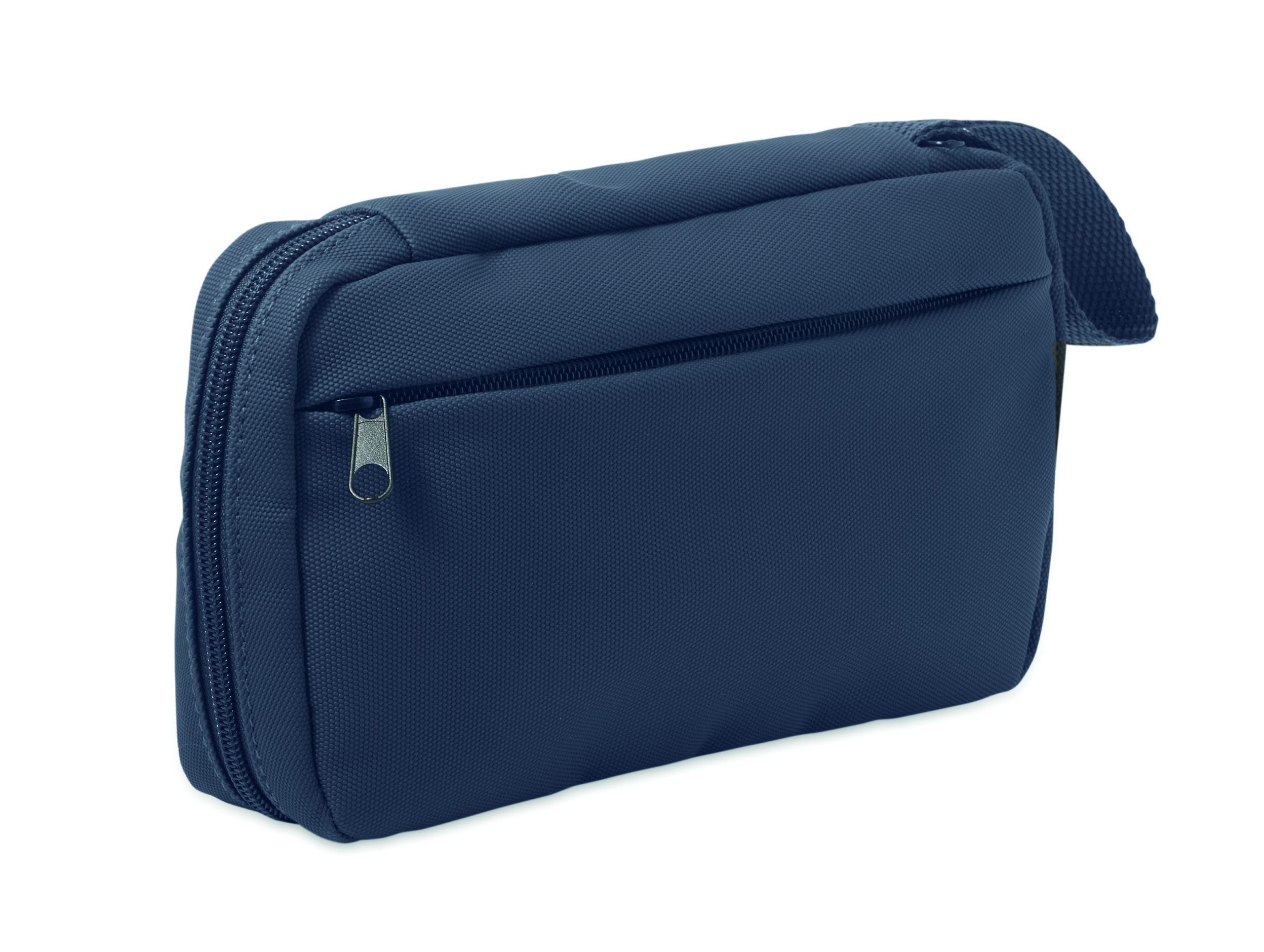 Kosmetyczka wykonana z 600D RPET z powłoką PU, siatką RPET i podszewką 210D RPET. Wyposażona w przednią kieszeń główną zapinaną na zamek błyskawiczny, wewnętrzną siatkę i otwarte kieszenie.