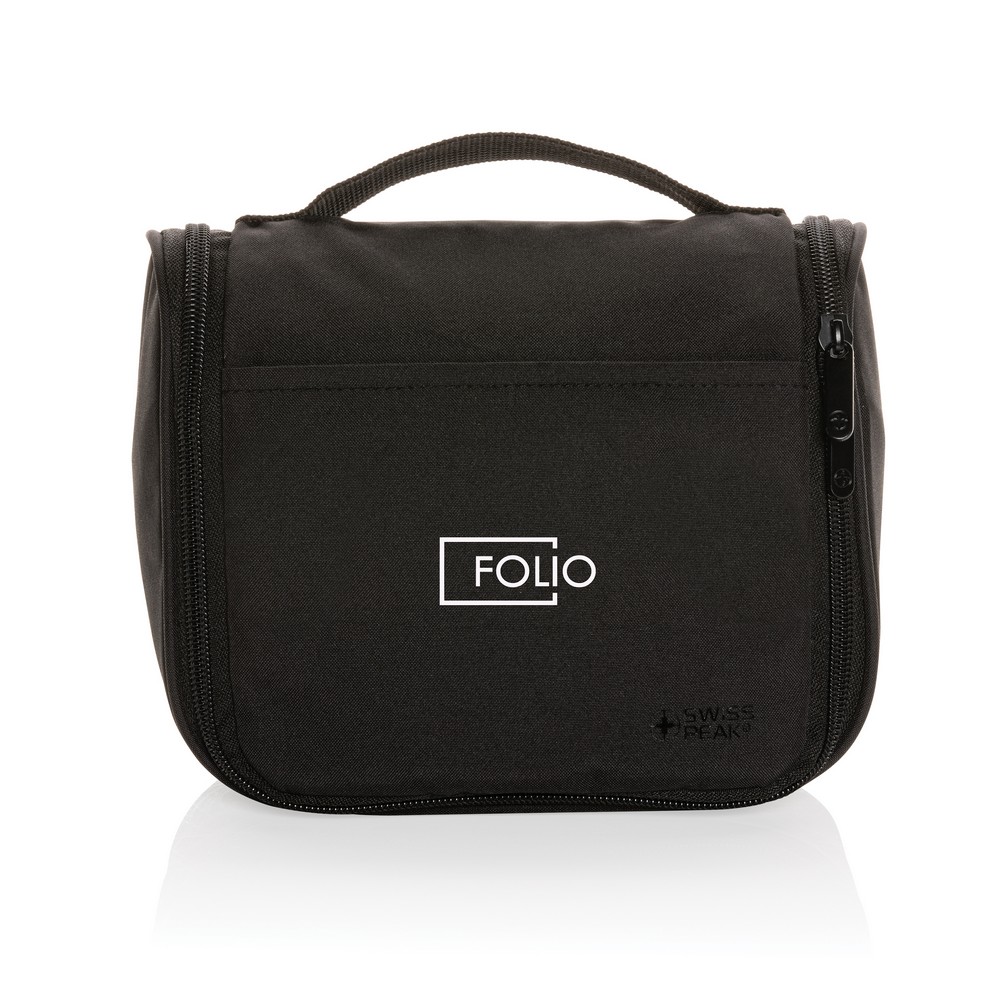 Kosmetyczka, przestronna przegroda główna w kieszeniami i przegródkami wewnątrz, posiada haczyk do zawieszenia, wykonana w 100% z materiałów z recyklingu, ślad węglowy produktu: 1,04 kg CO2