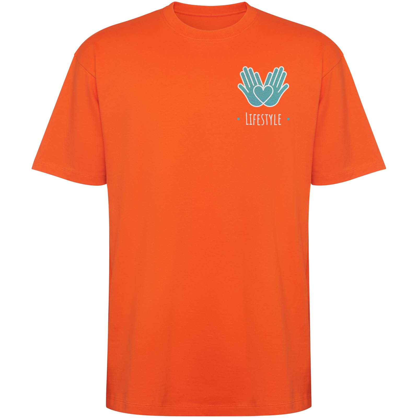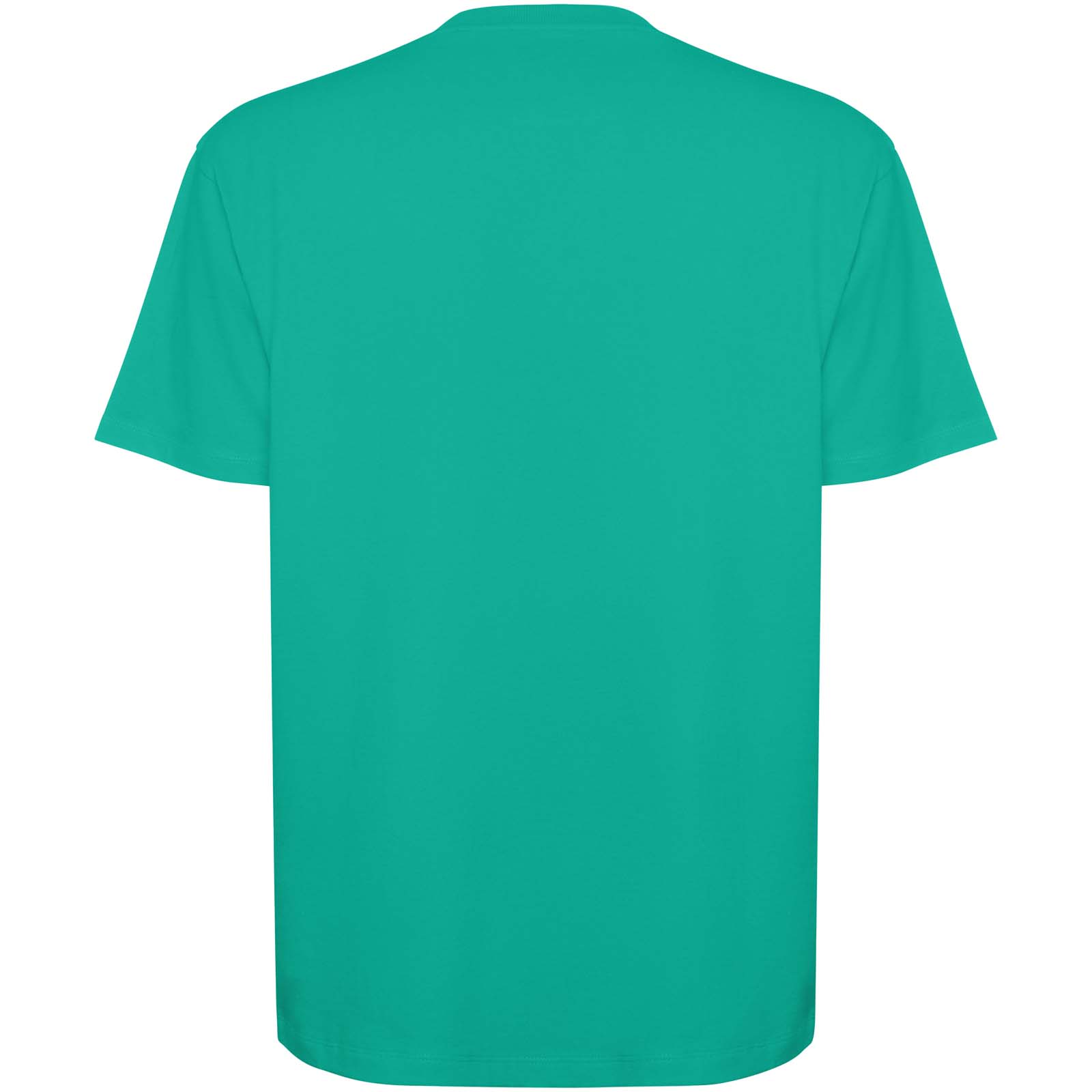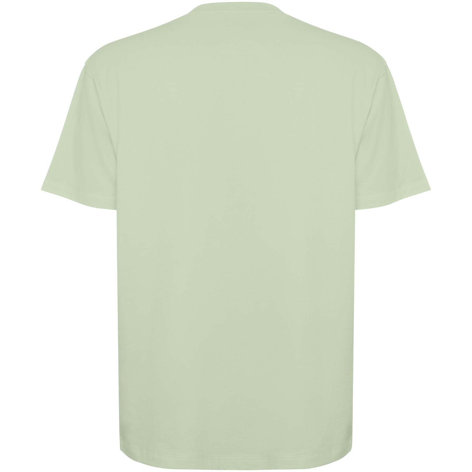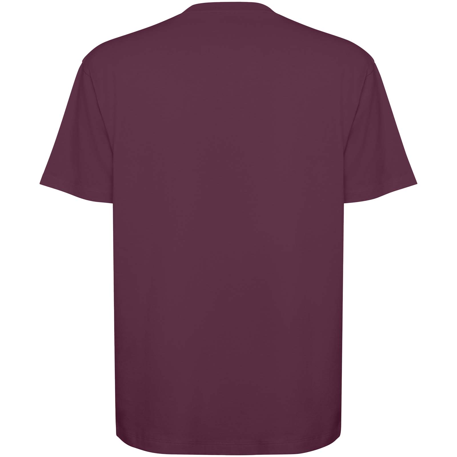Ovesizowa koszulka z krótkim rękawem. Okrągły kołnierzyk wykończony ściągaczem 2×1 z dopasowanymi obszyciami szwów. Szwy boczne. Szerokie podwójne szwy na rękawach i u dołu. Usuwalna etykieta.