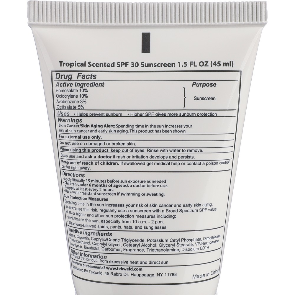 Krem przeciwsłoneczny o zapachu waniliowym, pojemność 45 ml, z filtrem przeciwsłonecznym SPF30, co oznacza 97% ochronę przeciwsłoneczną, przetestowany dermatologicznie, z okresem przydatności do 3 lat od daty produkcji, tuba wykonana z PE