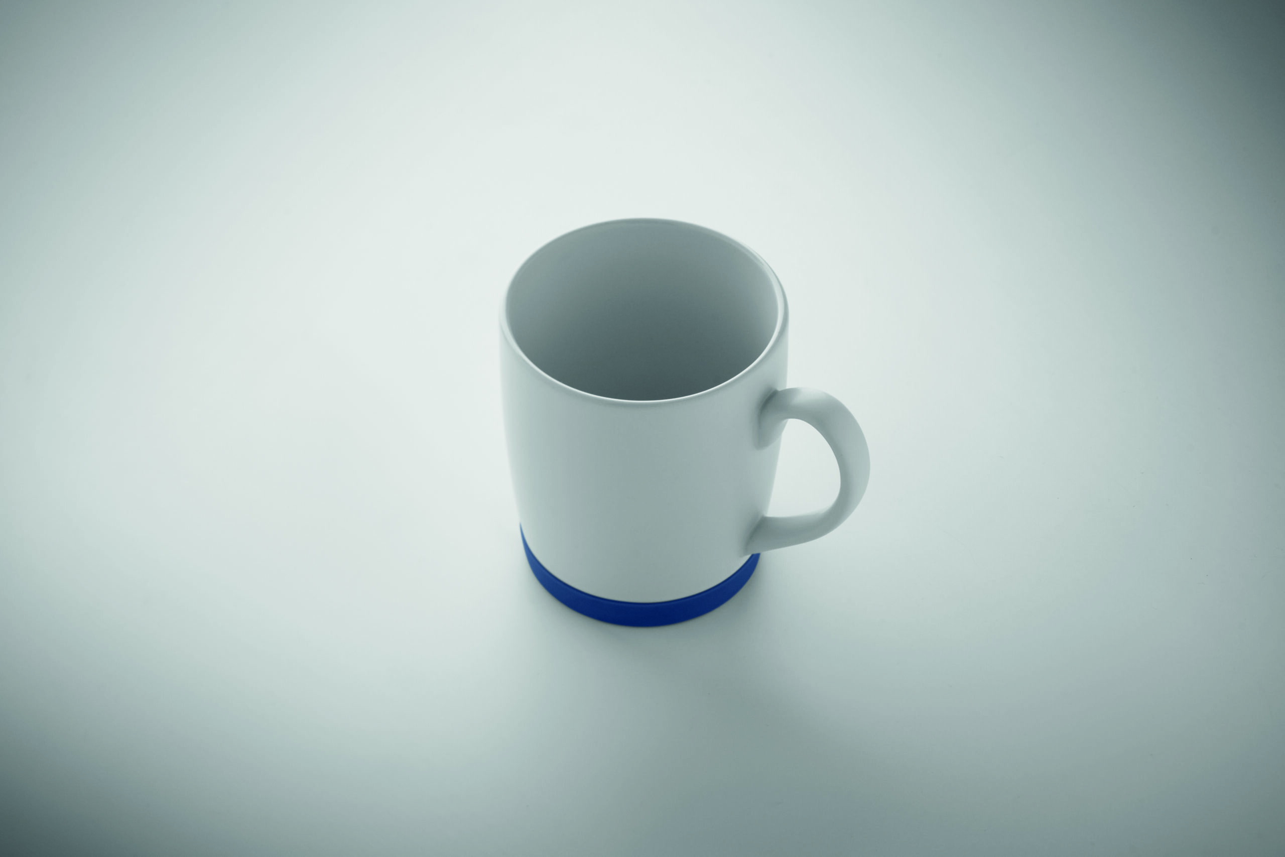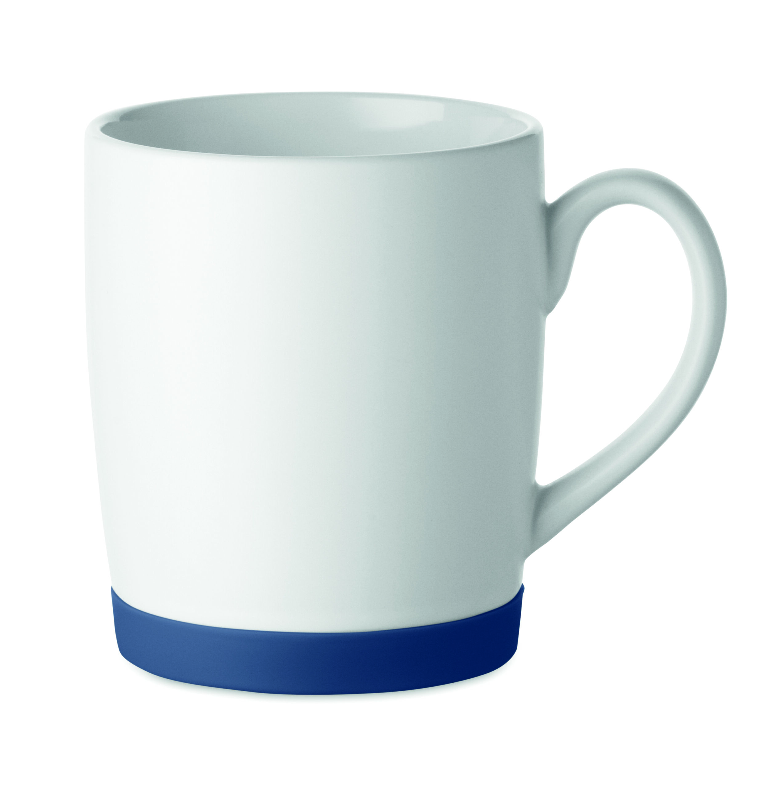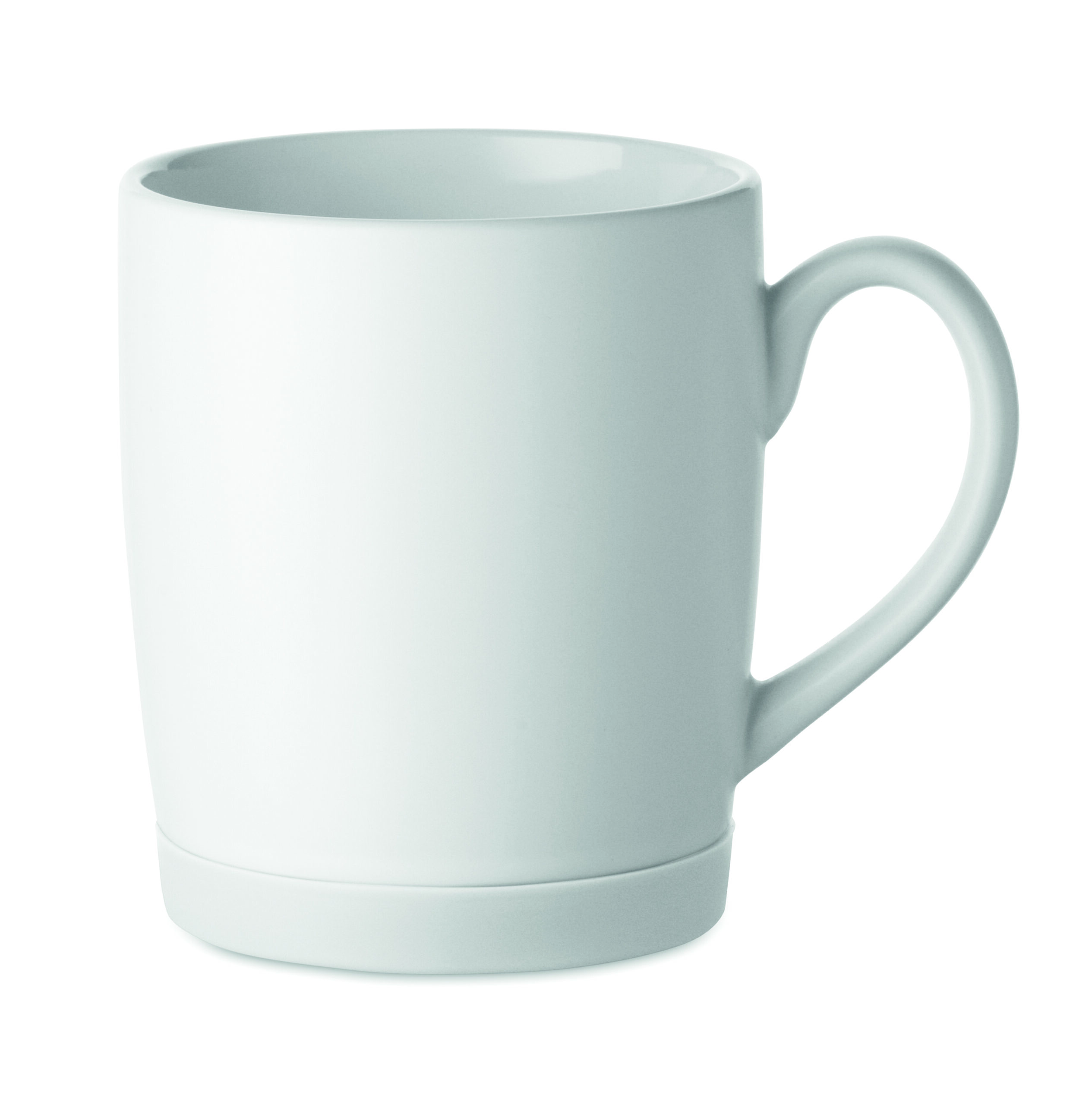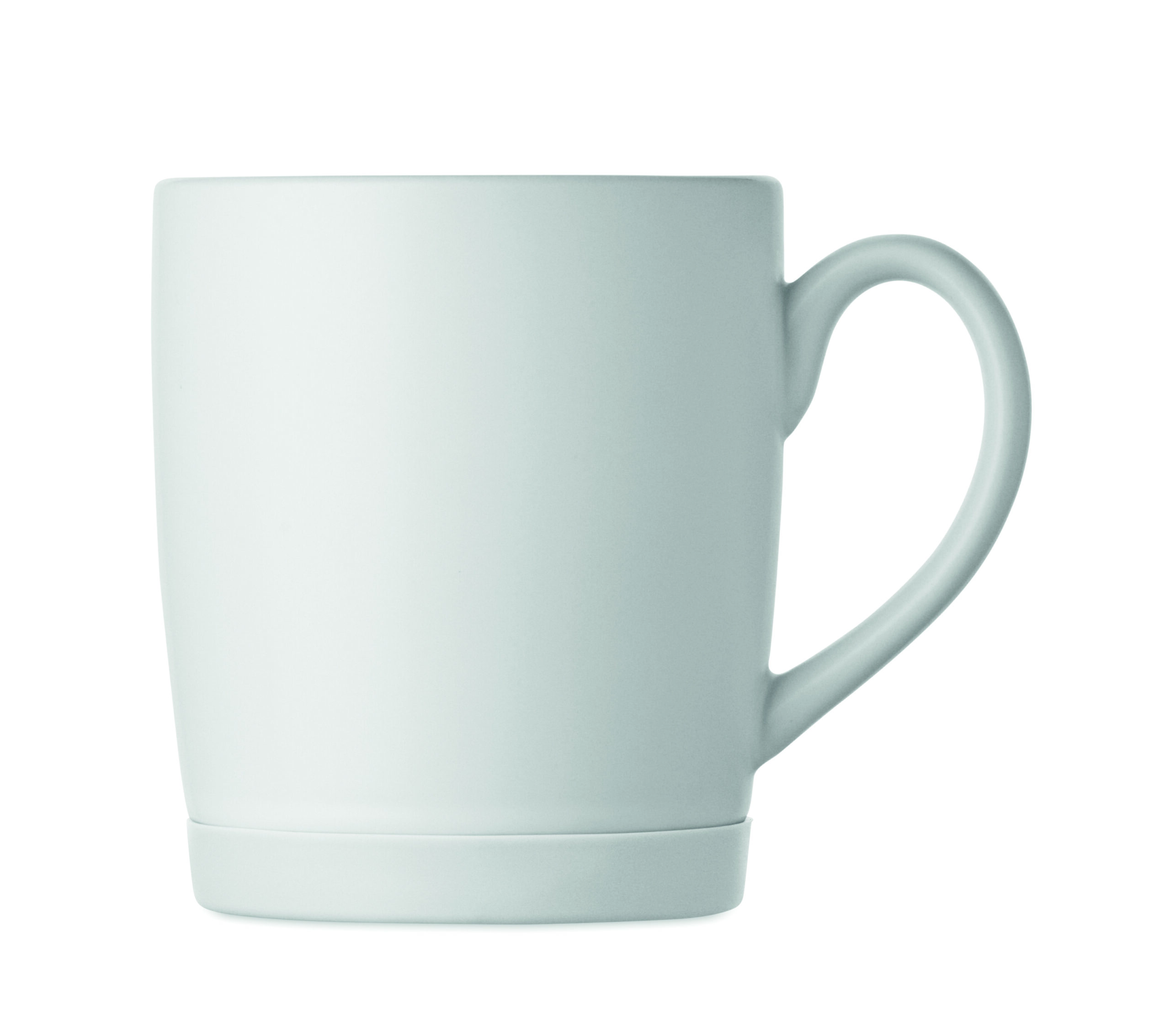 Ceramiczny kubek z białym matowym wykończeniem i silikonową podstawą zapewniającą stabilność. Pojemność 300 ml. Pakowany pojedynczo w białe pudełko kartonowe.