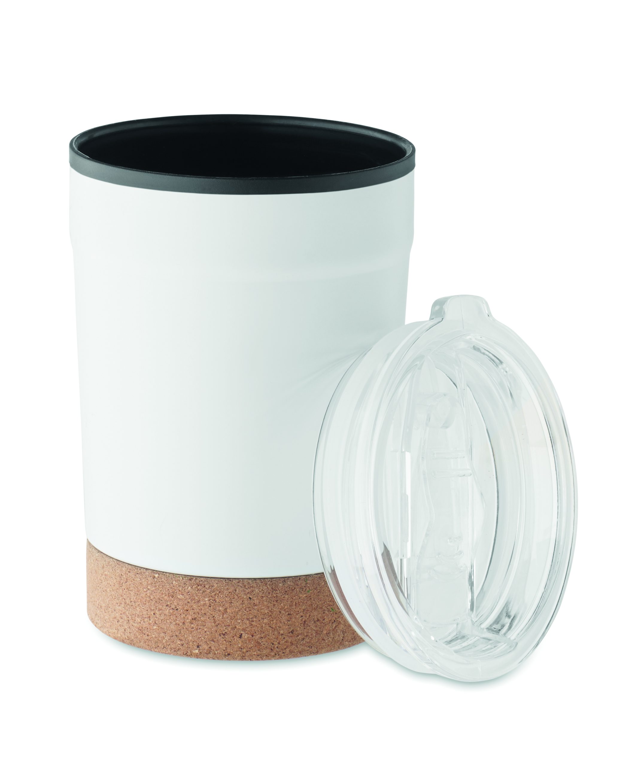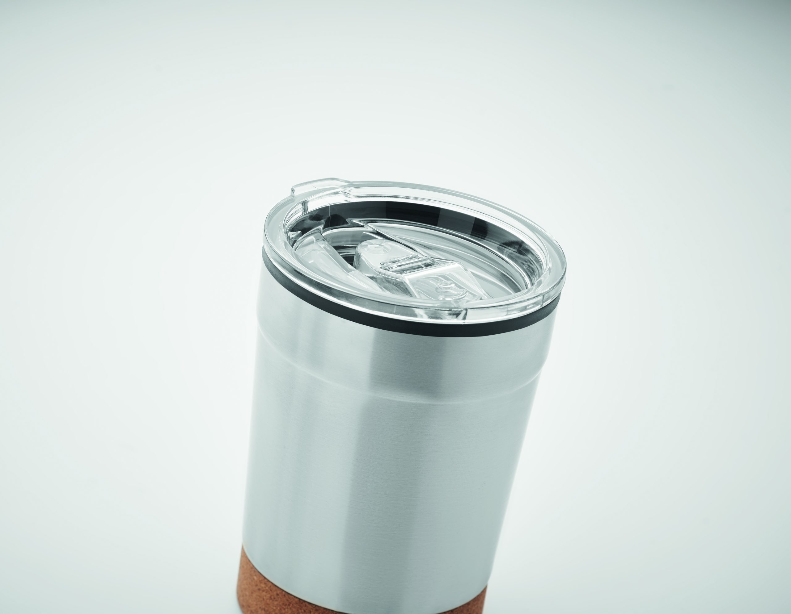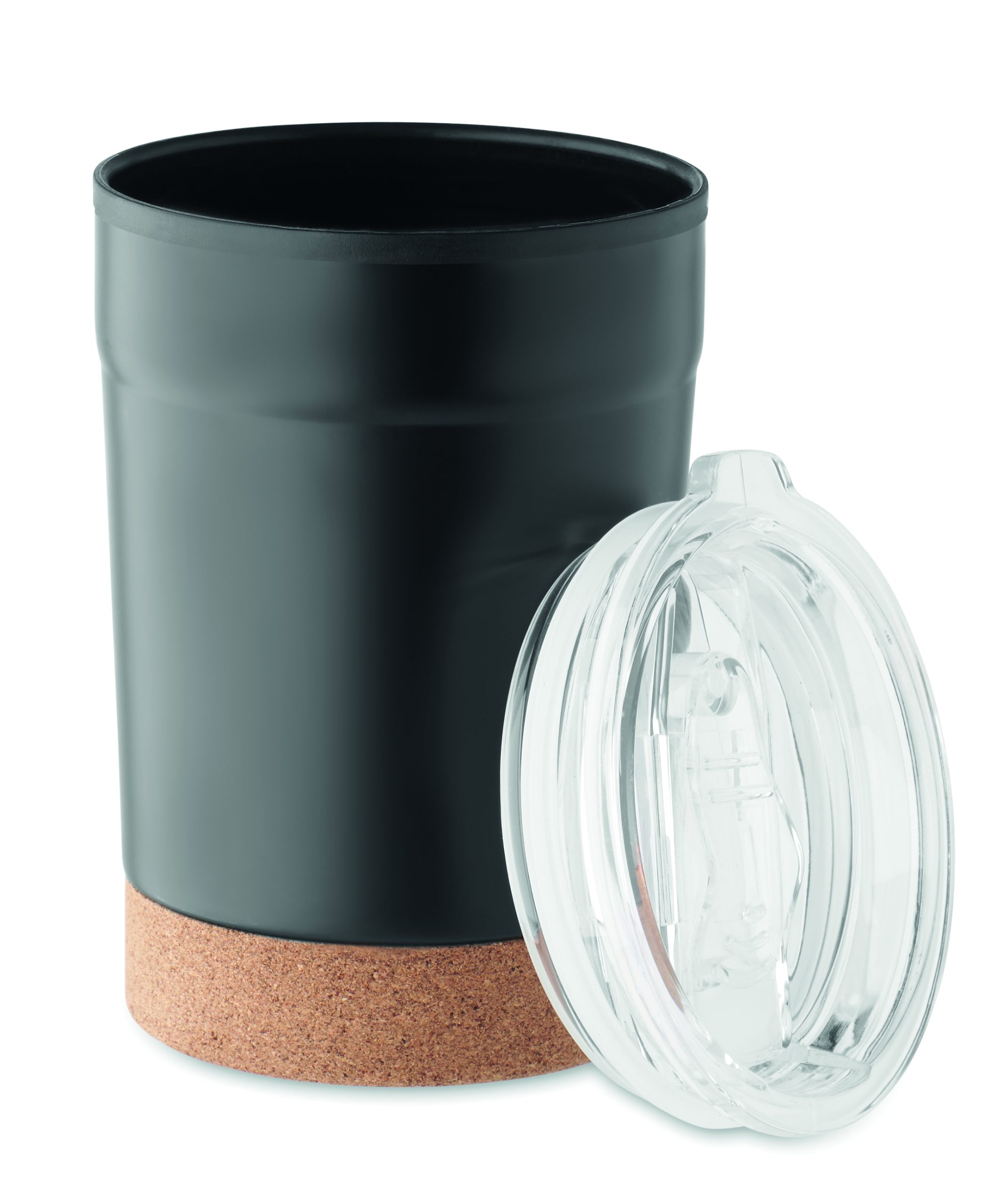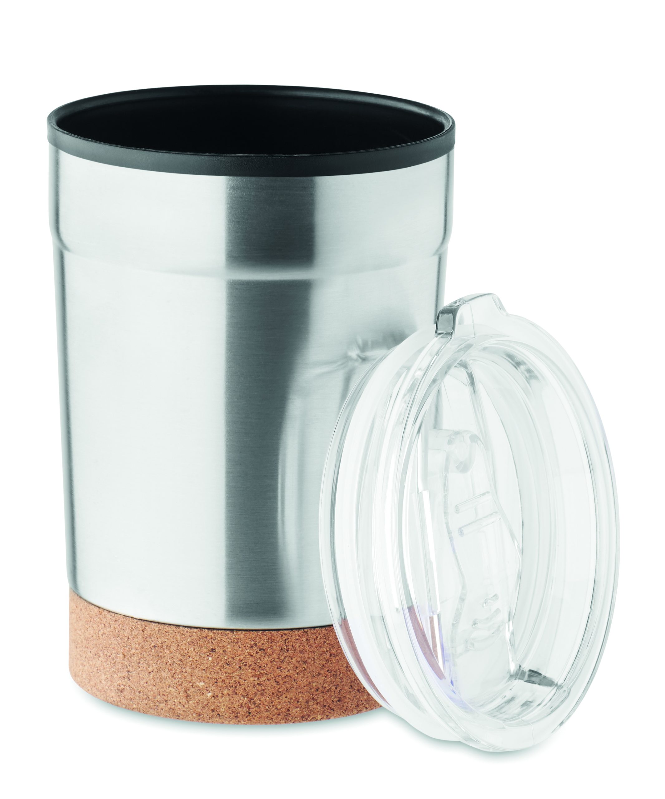 Zewnętrzna podwójna ścianka ze stali nierdzewnej i wewnętrzna strona z PP. Korkowa podstawka i przesuwane otwarcie do picia. Nie przecieka. Pojemność: 300 ml.