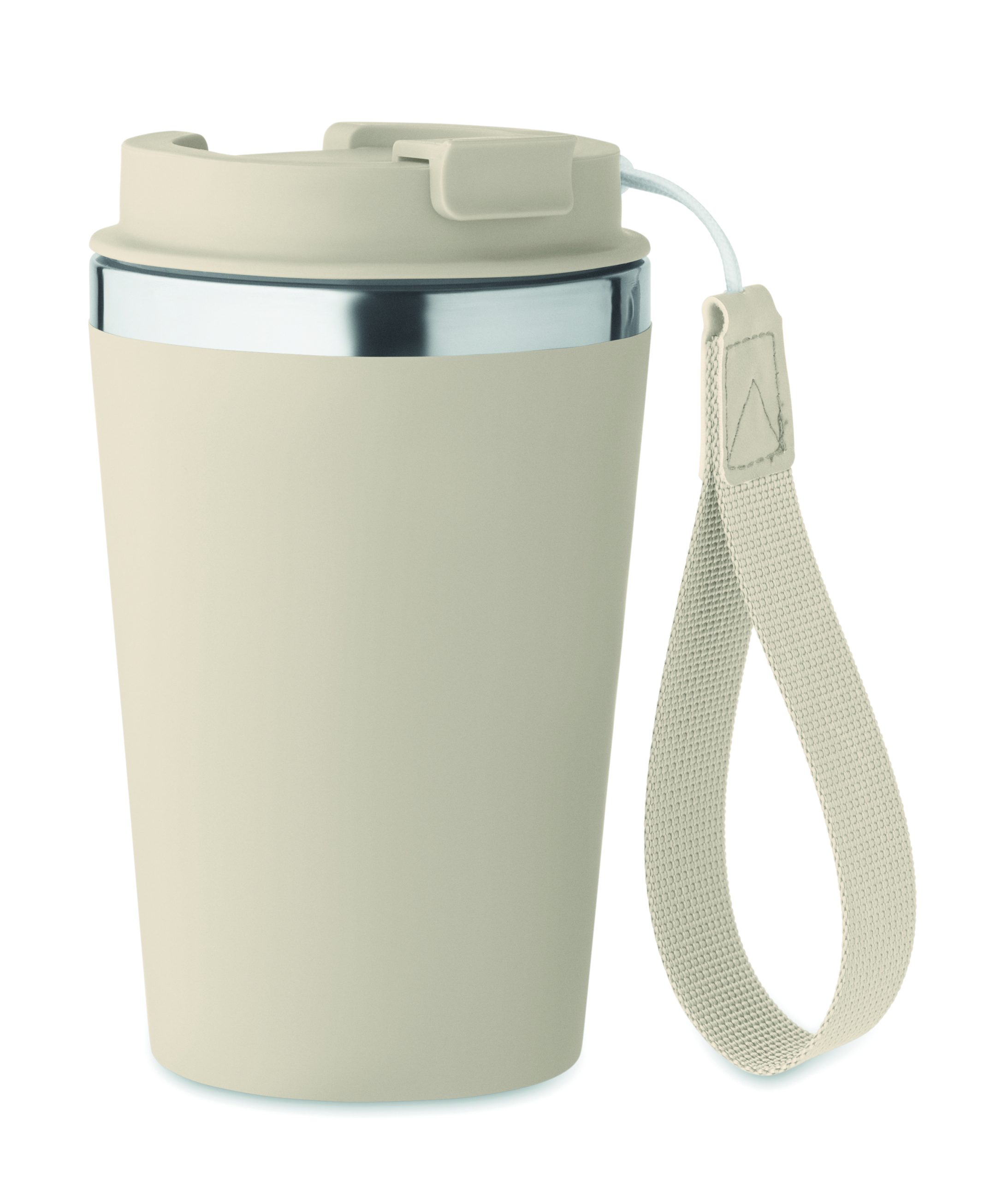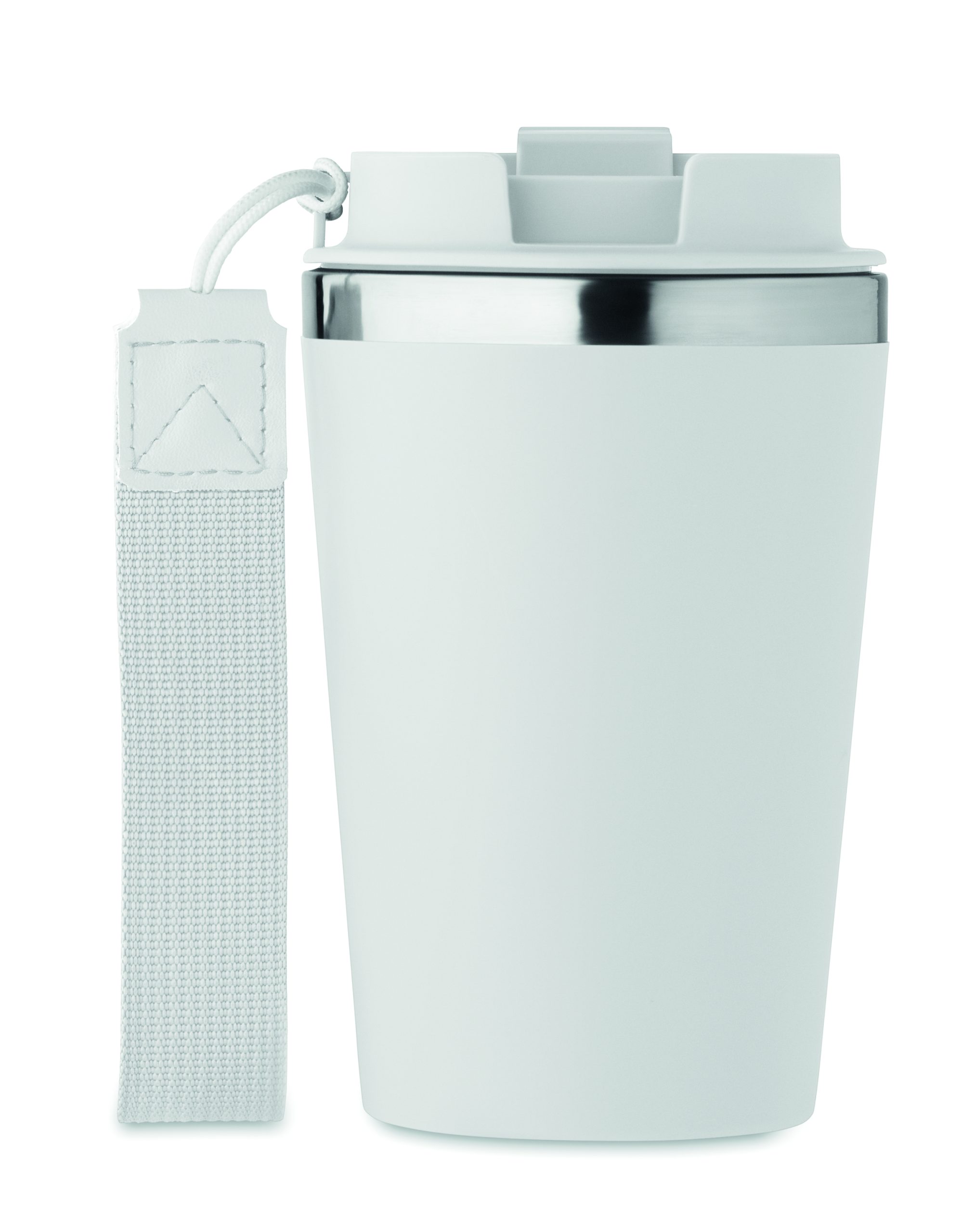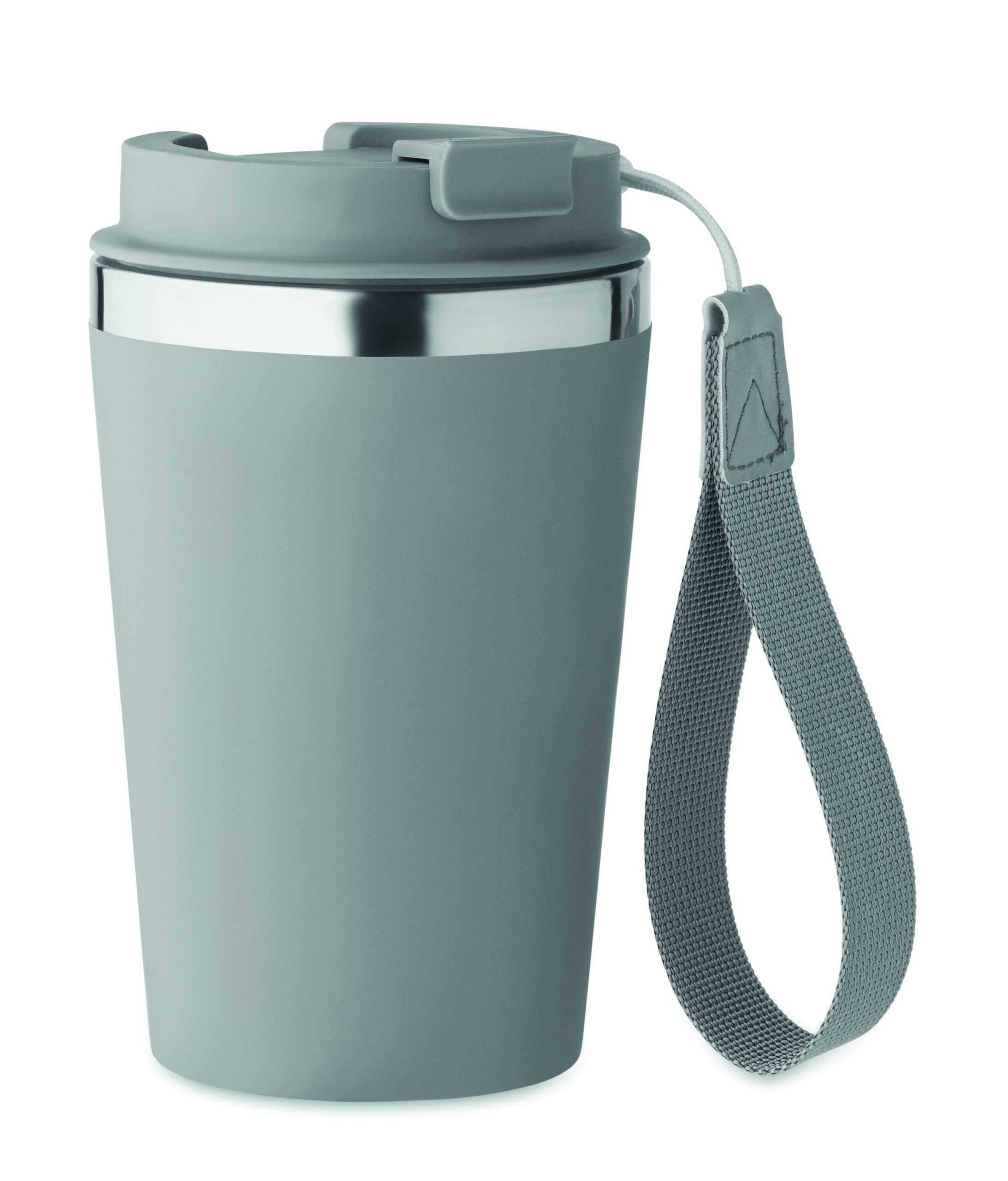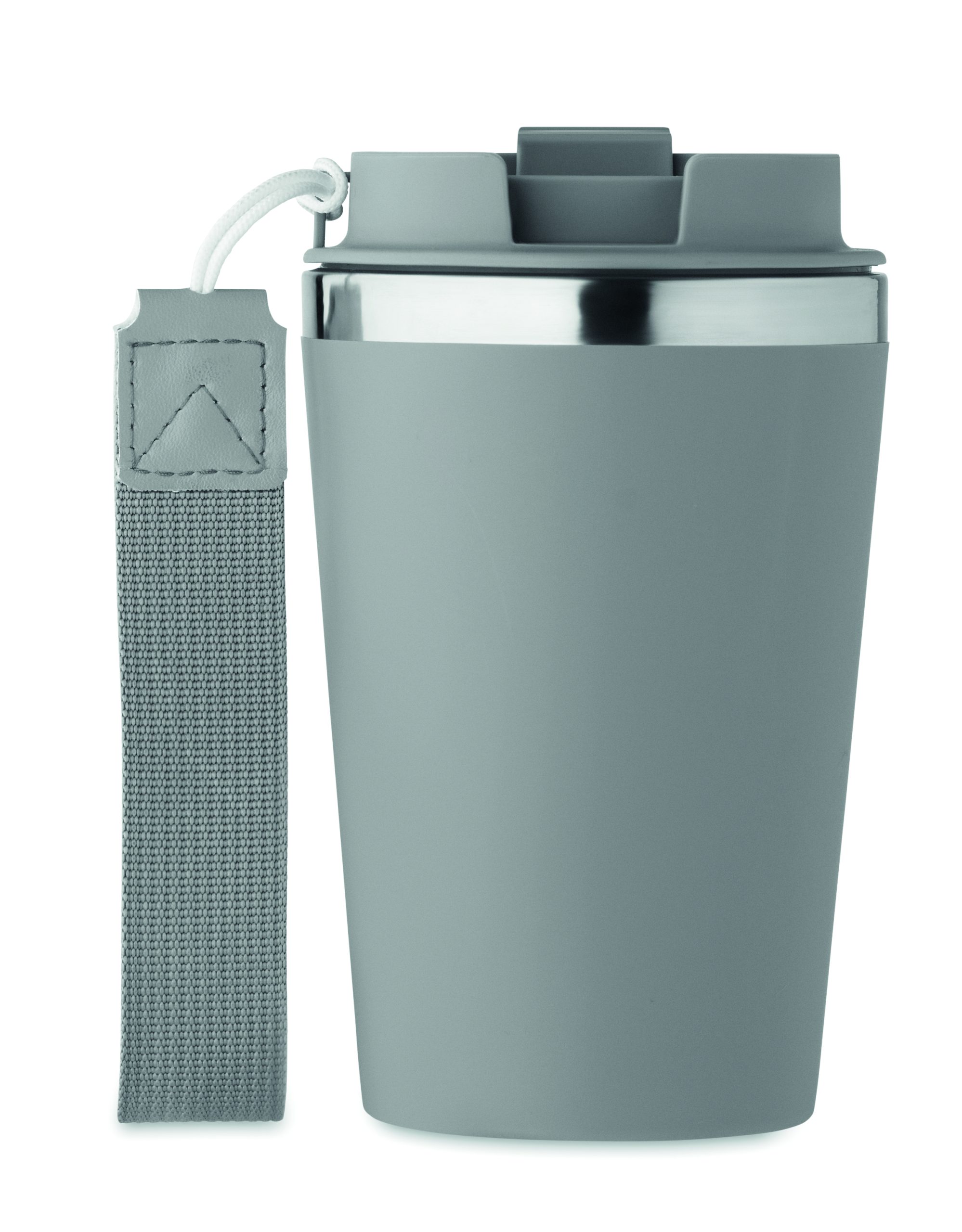 Kubek z podwójnymi ściankami z recyklingowanej stali nierdzewnej (90% recyklingowanej stali nierdzewnej i 10% stali nierdzewnej) z zewnętrzną warstwą z PP i paskiem na nadgarstek z RPET. Pojemność: 350 ml.