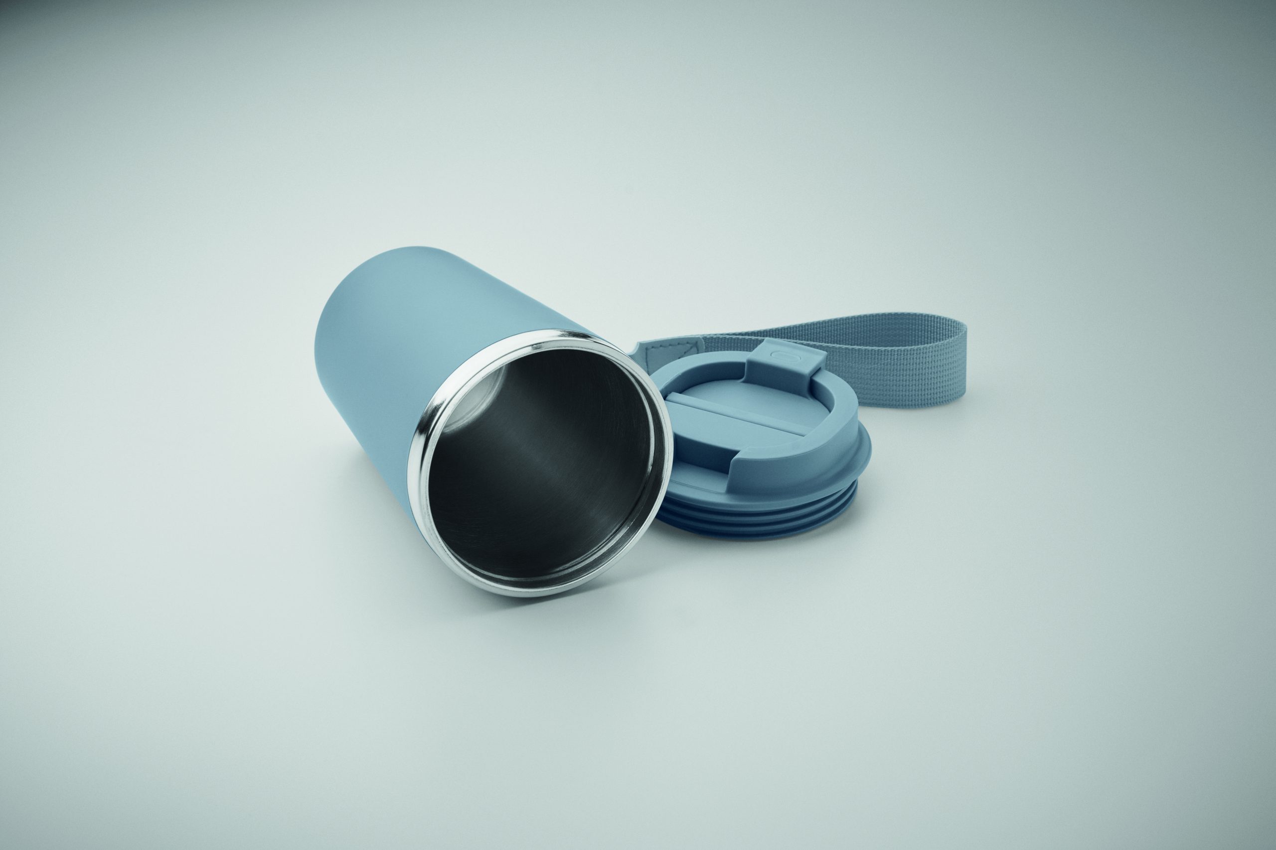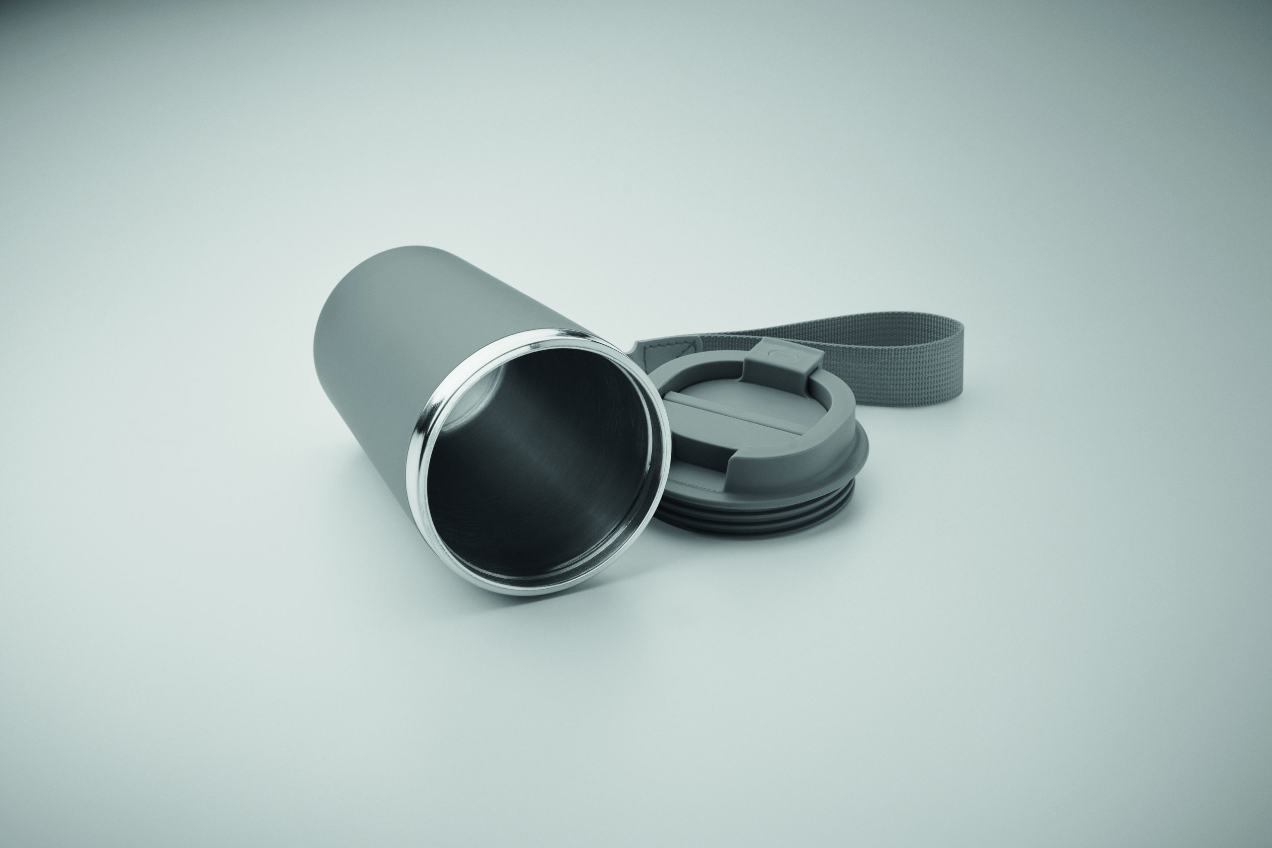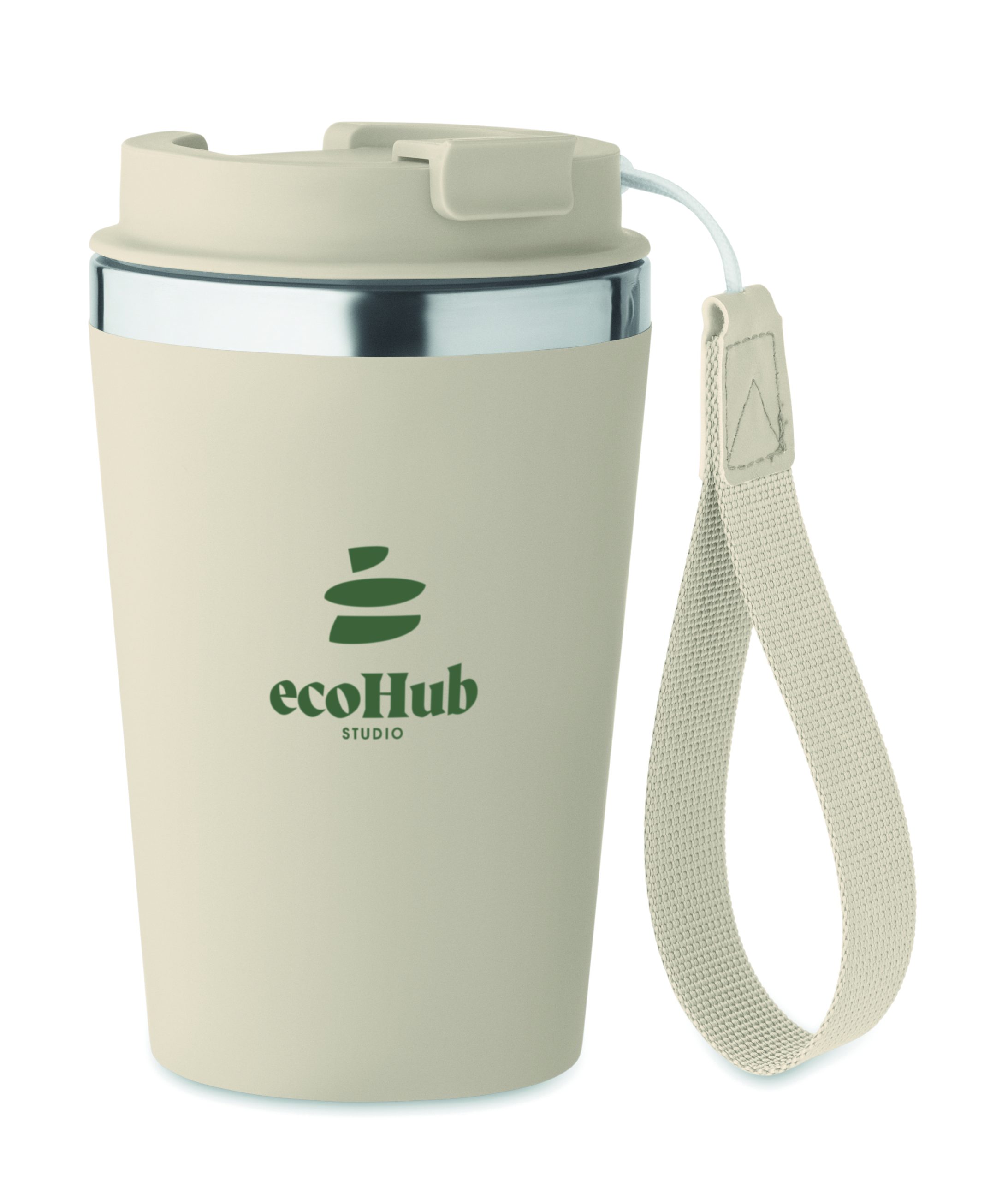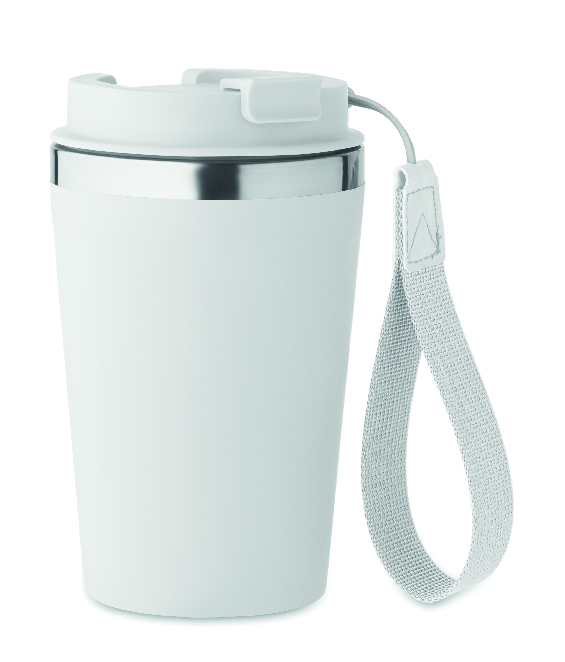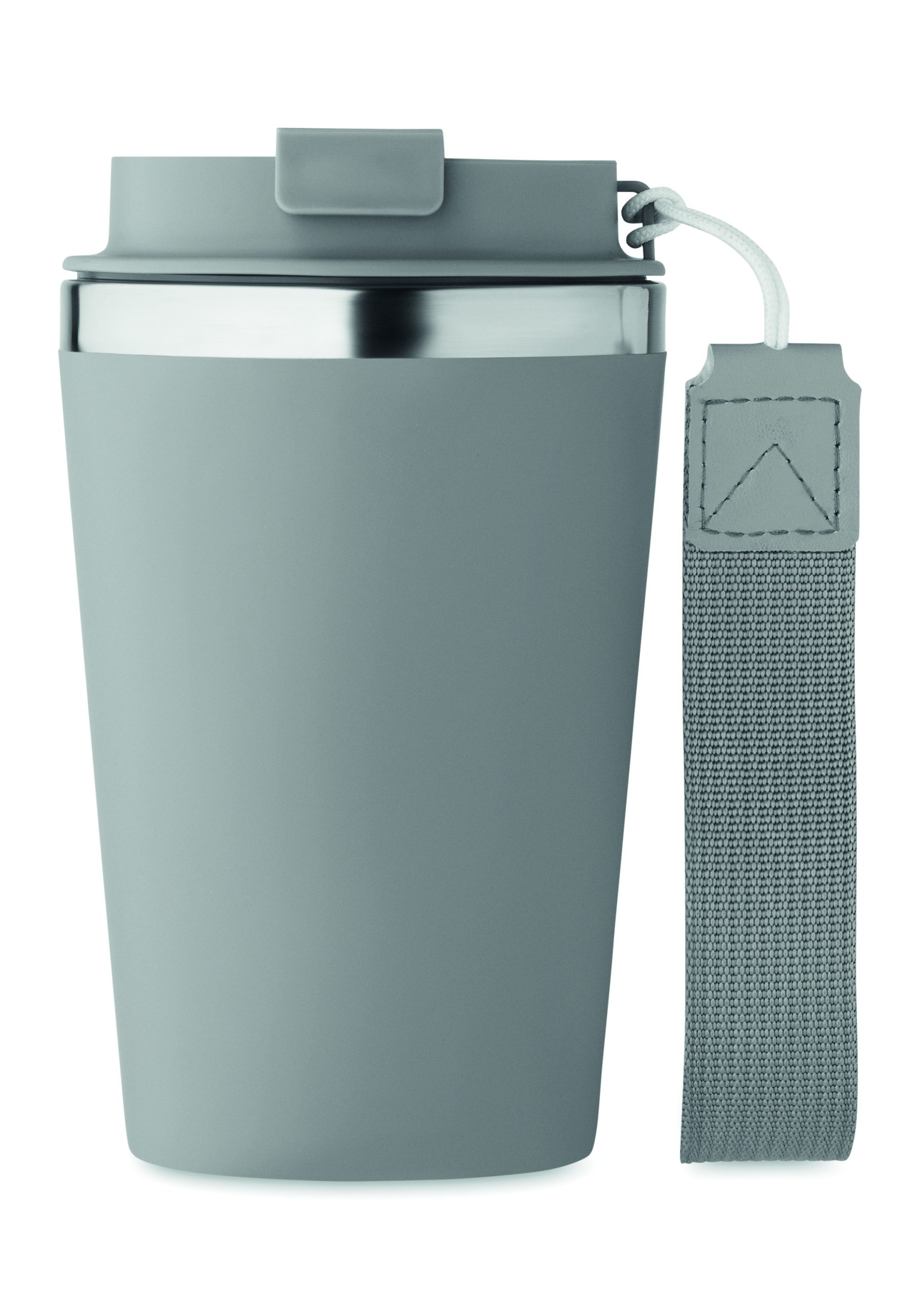 Kubek z podwójnymi ściankami z recyklingowanej stali nierdzewnej (90% recyklingowanej stali nierdzewnej i 10% stali nierdzewnej) z zewnętrzną warstwą z PP i paskiem na nadgarstek z RPET. Pojemność: 350 ml.