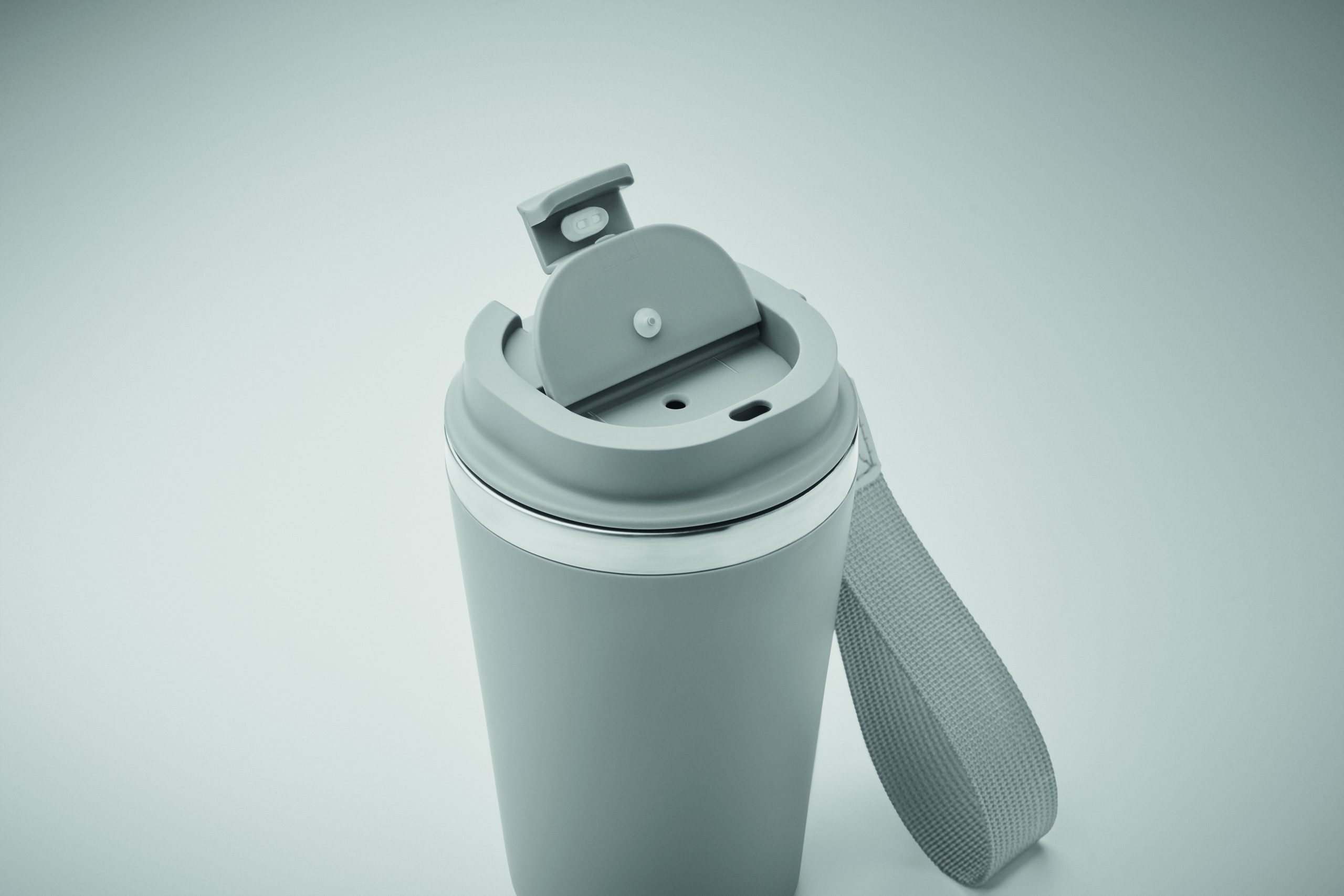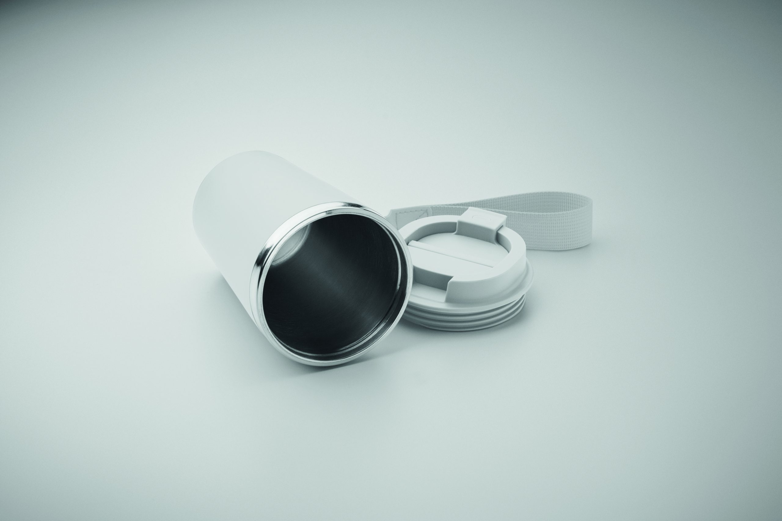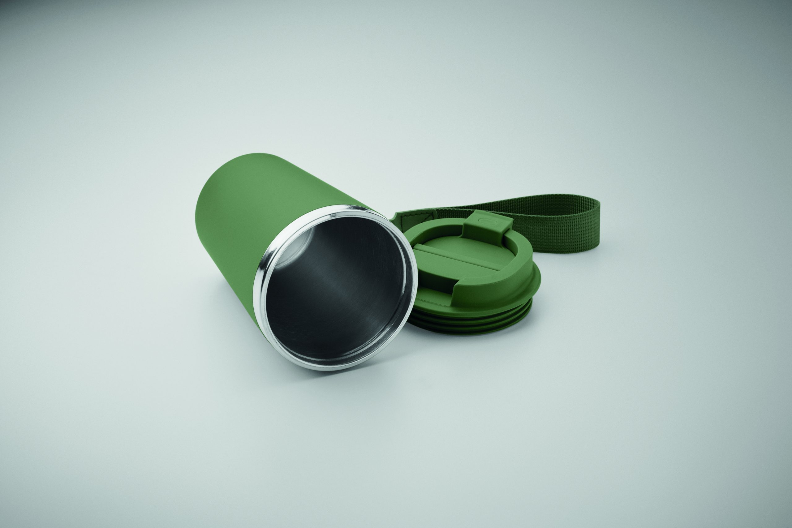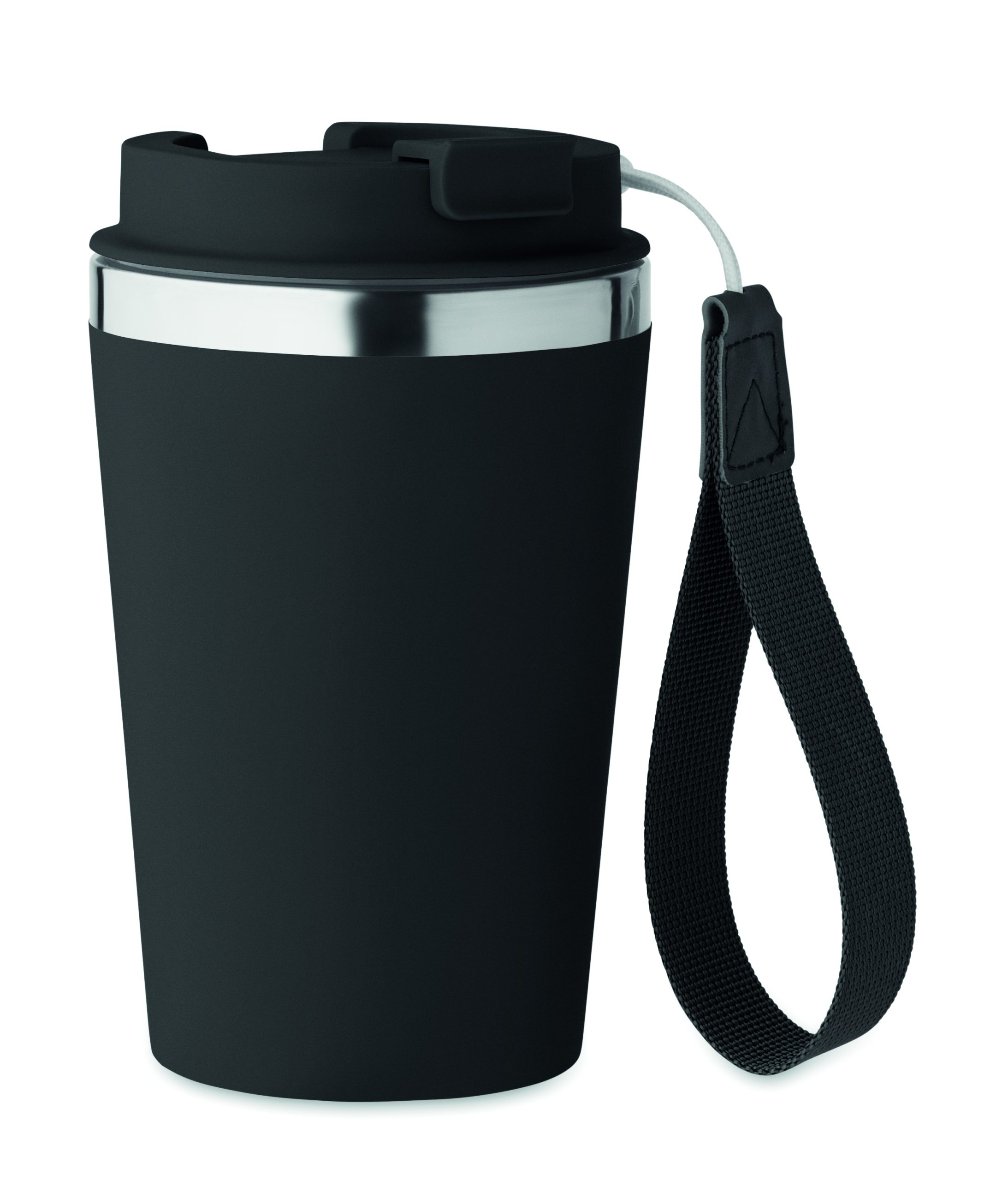 Kubek z podwójnymi ściankami z recyklingowanej stali nierdzewnej (90% recyklingowanej stali nierdzewnej i 10% stali nierdzewnej) z zewnętrzną warstwą z PP i paskiem na nadgarstek z RPET. Pojemność: 350 ml.