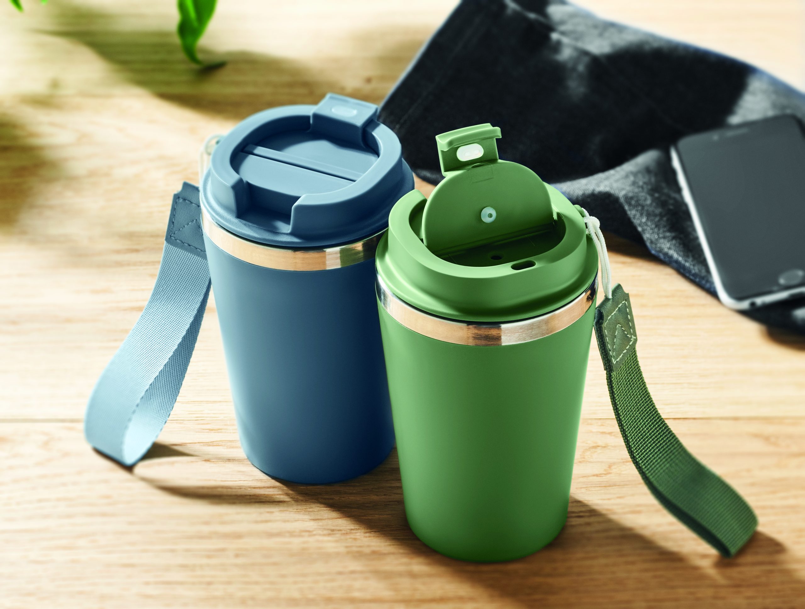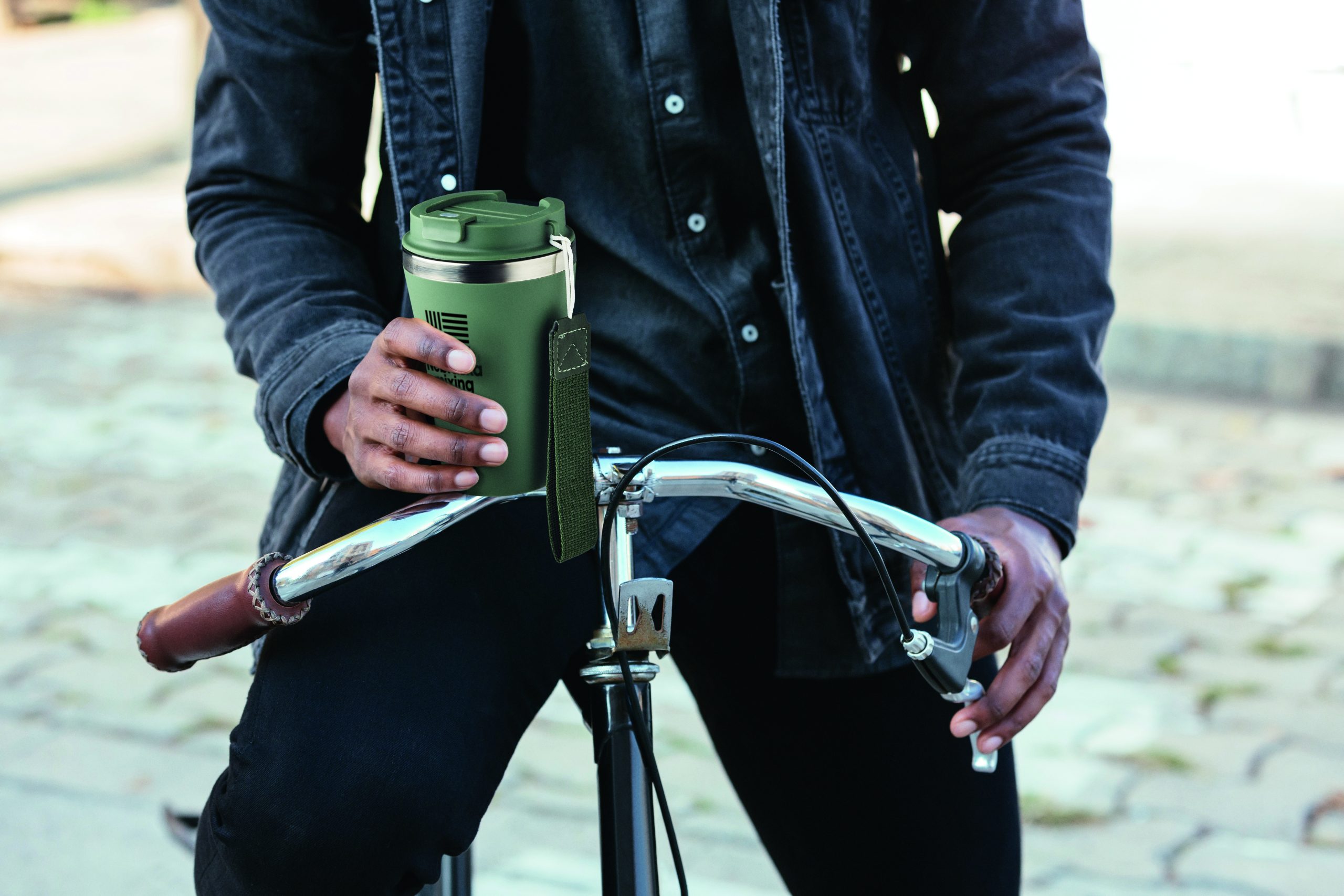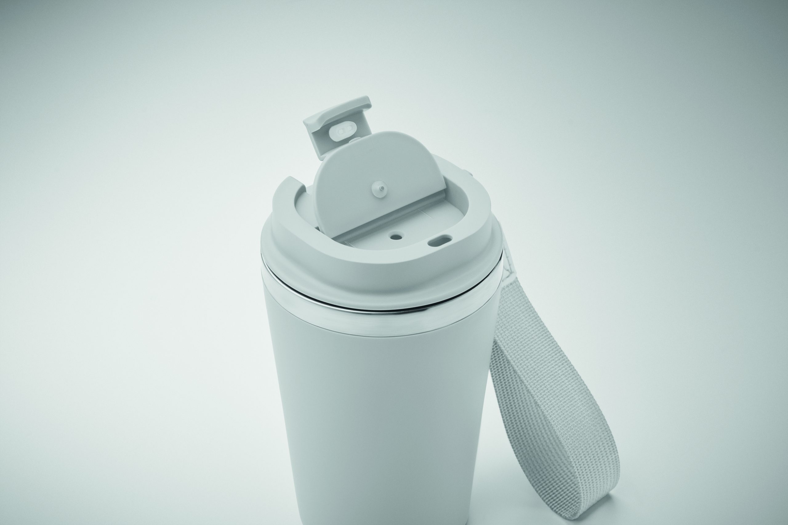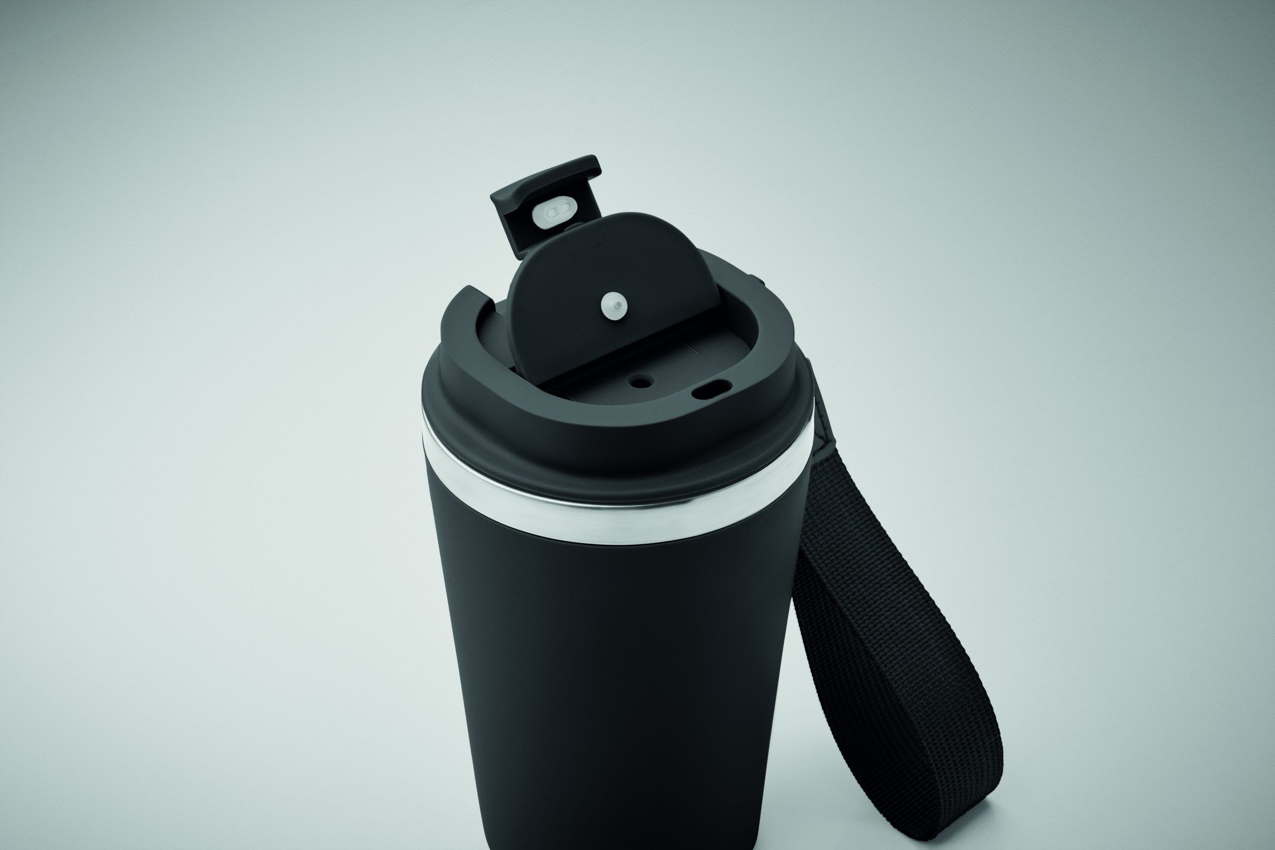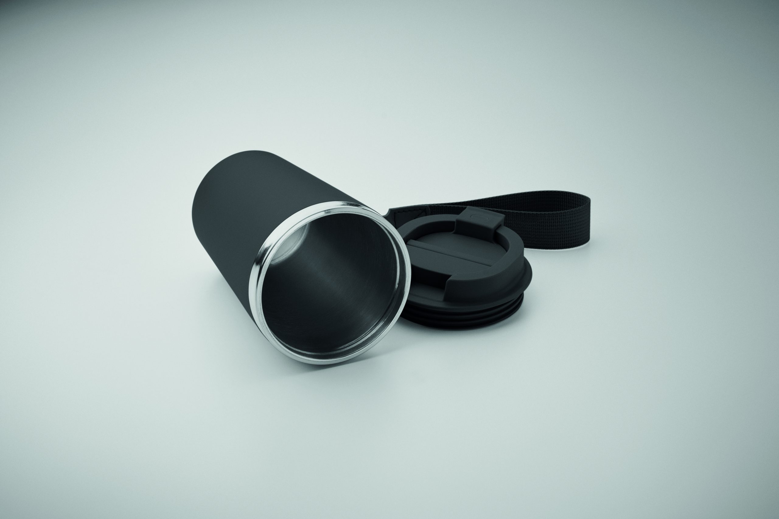 Kubek z podwójnymi ściankami z recyklingowanej stali nierdzewnej (90% recyklingowanej stali nierdzewnej i 10% stali nierdzewnej) z zewnętrzną warstwą z PP i paskiem na nadgarstek z RPET. Pojemność: 350 ml.