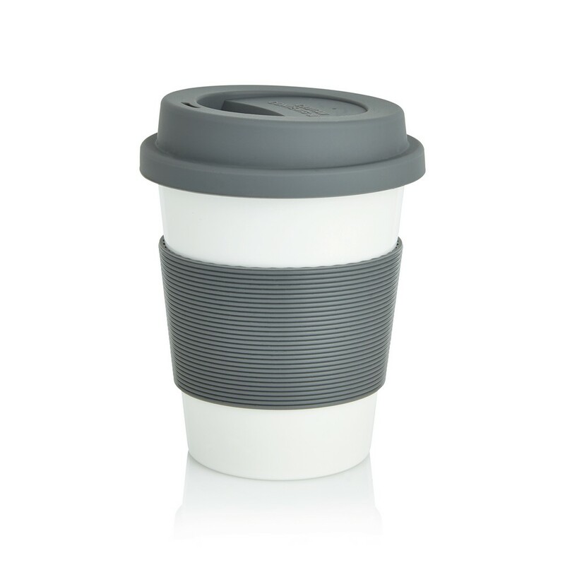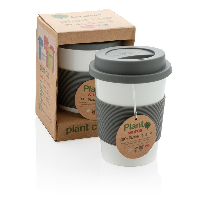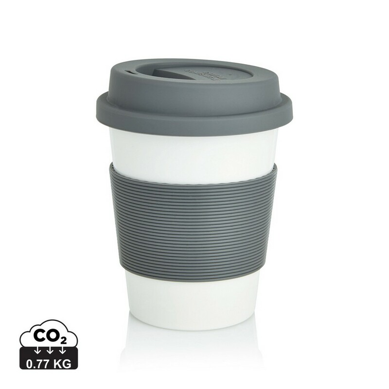 Kubek podróżny 350 ml, wykonany z PLA, silikonowe wieczko i uchwyt, można myć w zmywarce, ślad węglowy produktu: 0,77 kg CO2