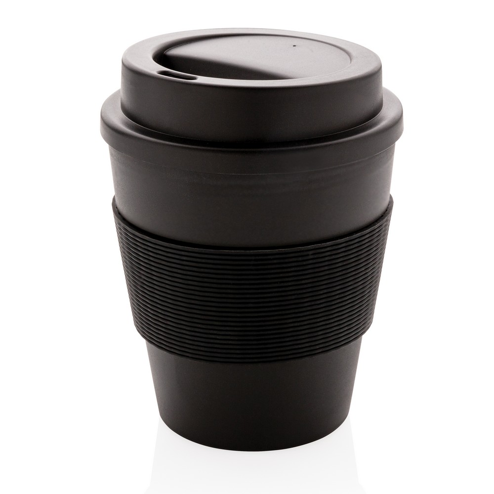 Kubek podróżny 350 ml, lekki, trwały i wielokrotnego użytku, wykonany z nadającego się w 100% do recyklingu materiału PP, silikonowy uchwyt, zakręcane wieczko, odporny na temperaturę do 100 stopni Celsjusza, kubek można myć w zmywarce i używać w kuchence mikrofalowej, ślad węglowy produktu: 0,34 kg CO2