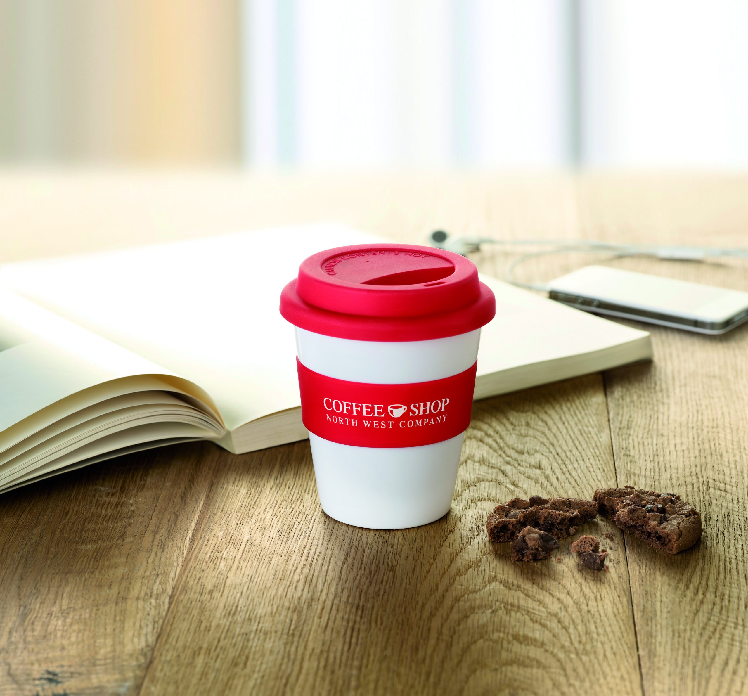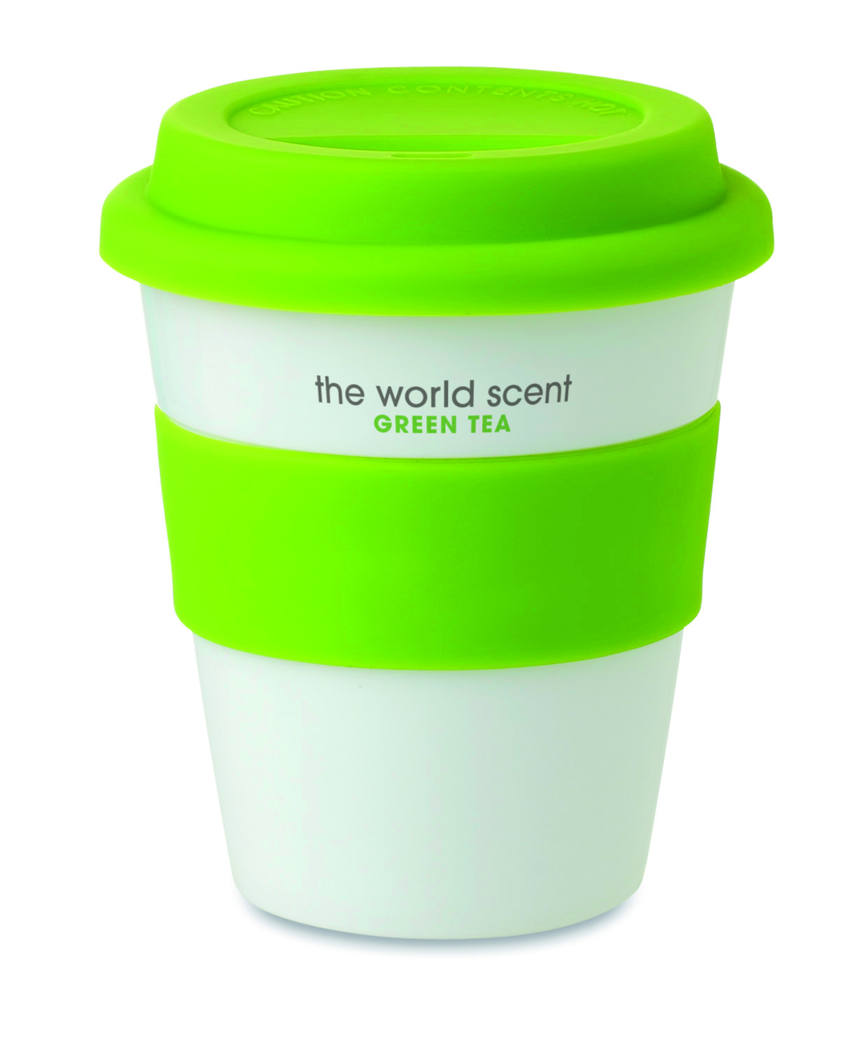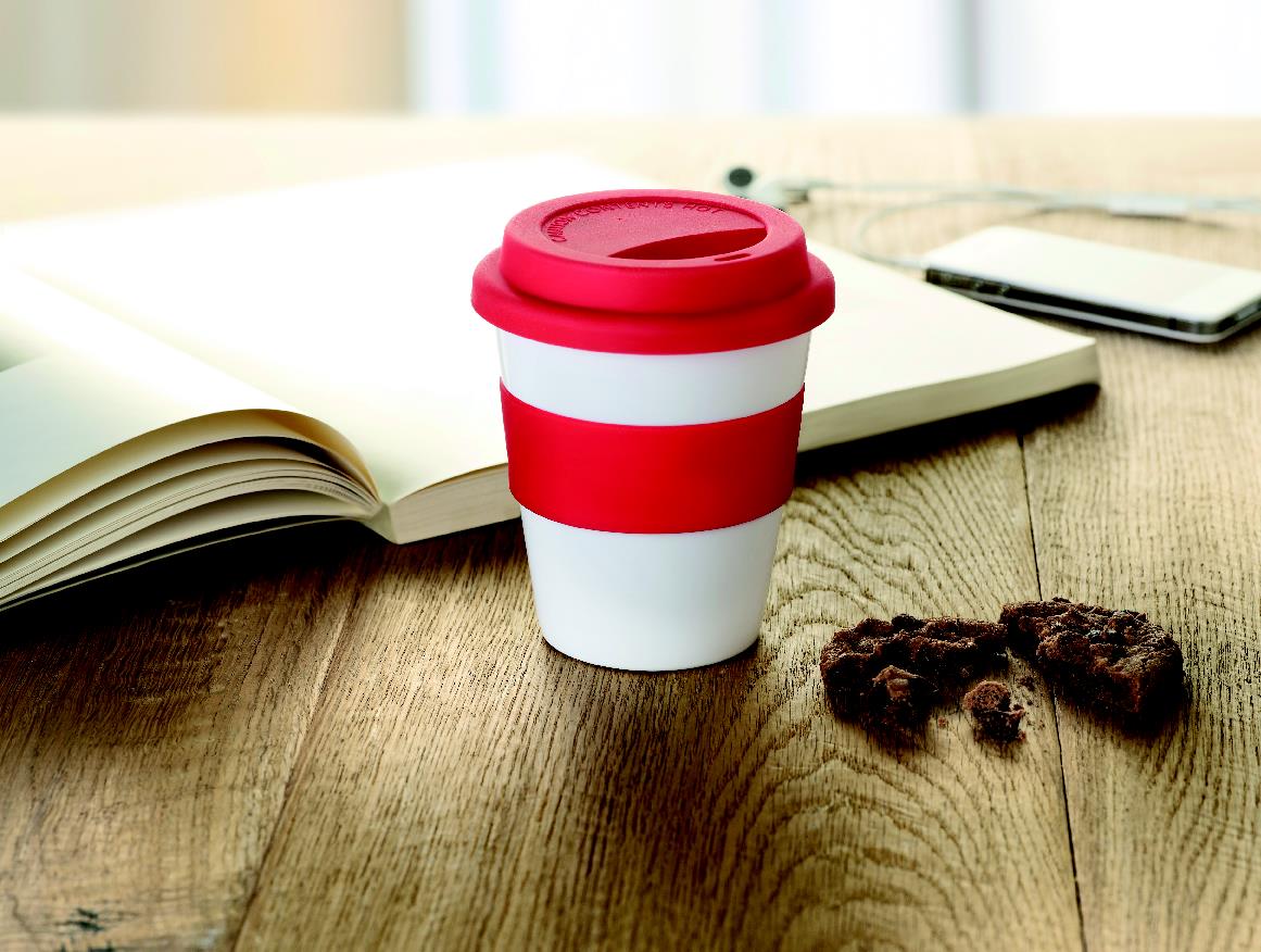 Kubek z pojedynczą ścianką, z białego połyskującego PP z silikonową pokrywą i pierścieniem na środku. Pojemność 350ml. Kubek jest jednowarstwowy, nagrzewa się z zewnątrz.