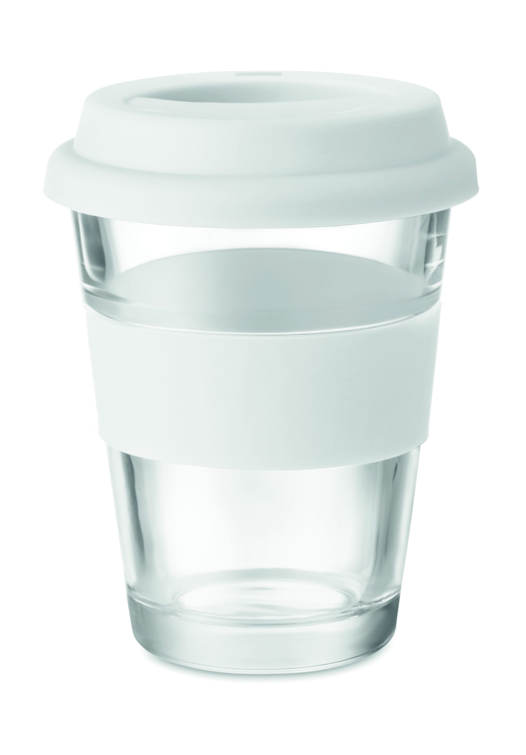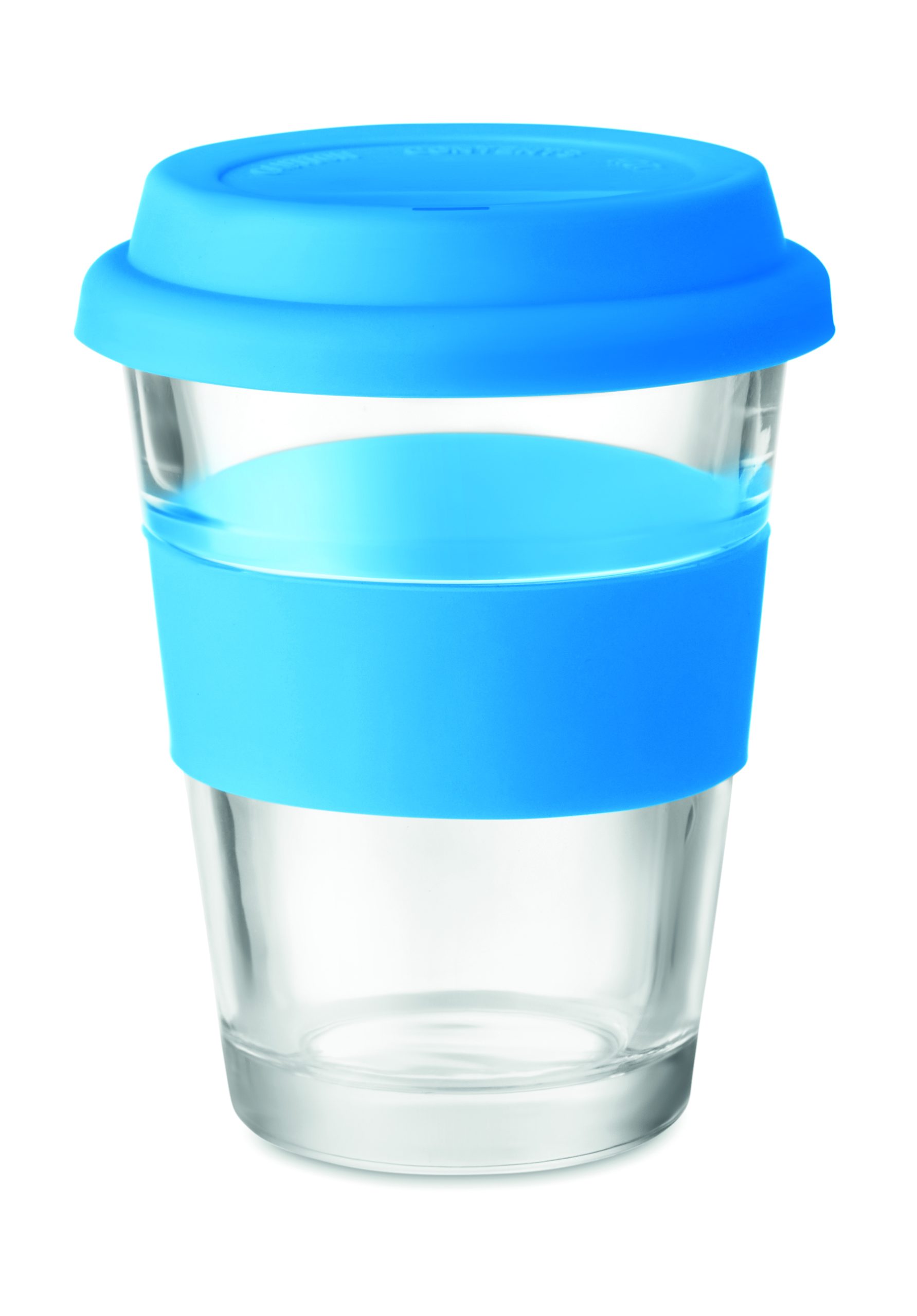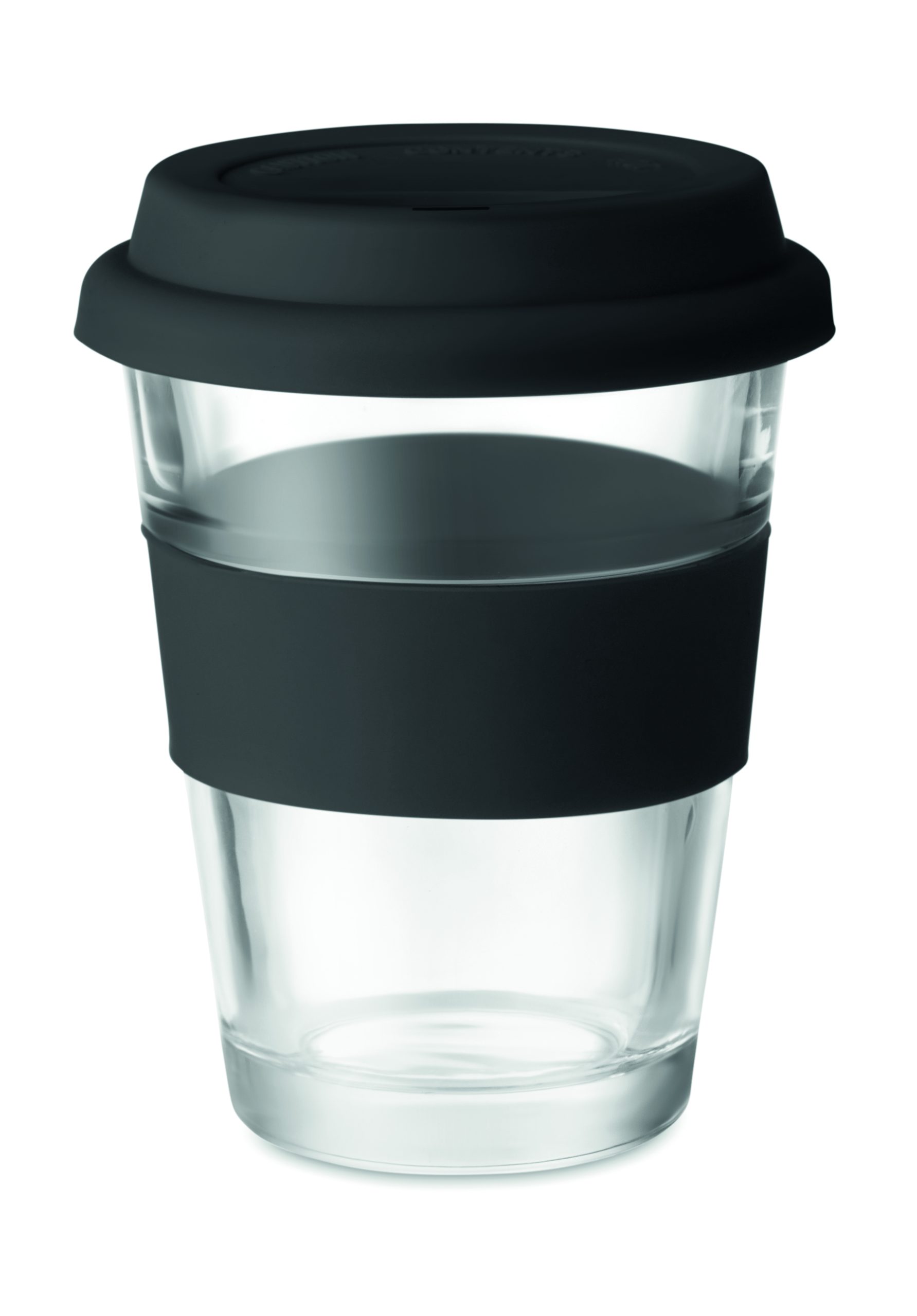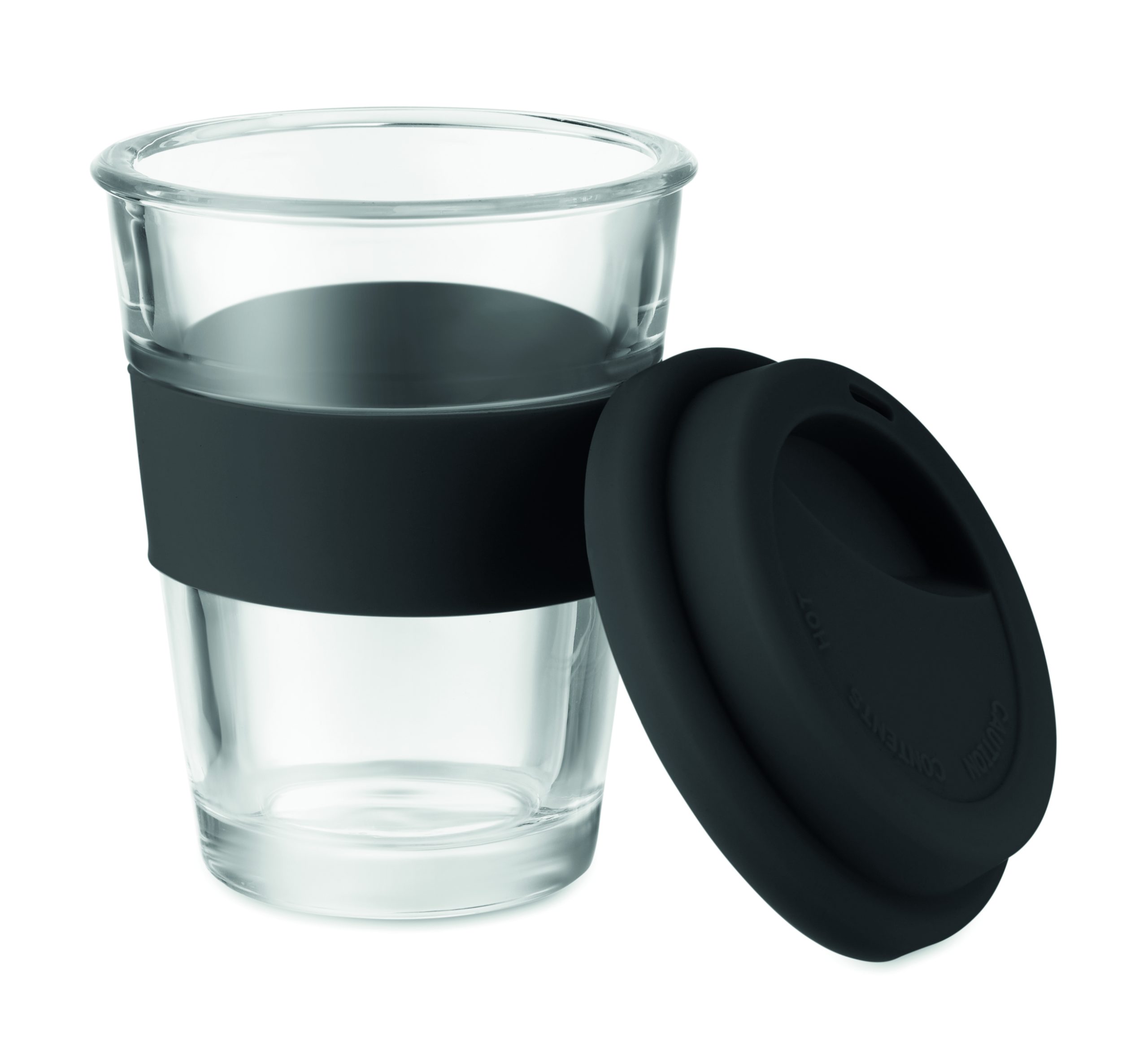 Szklany kubek z silikonową pokrywką i uchwytem. Pojemność 350 ml. Kubek posiada pojedynczą ściankę, więc może się nagrzewać.