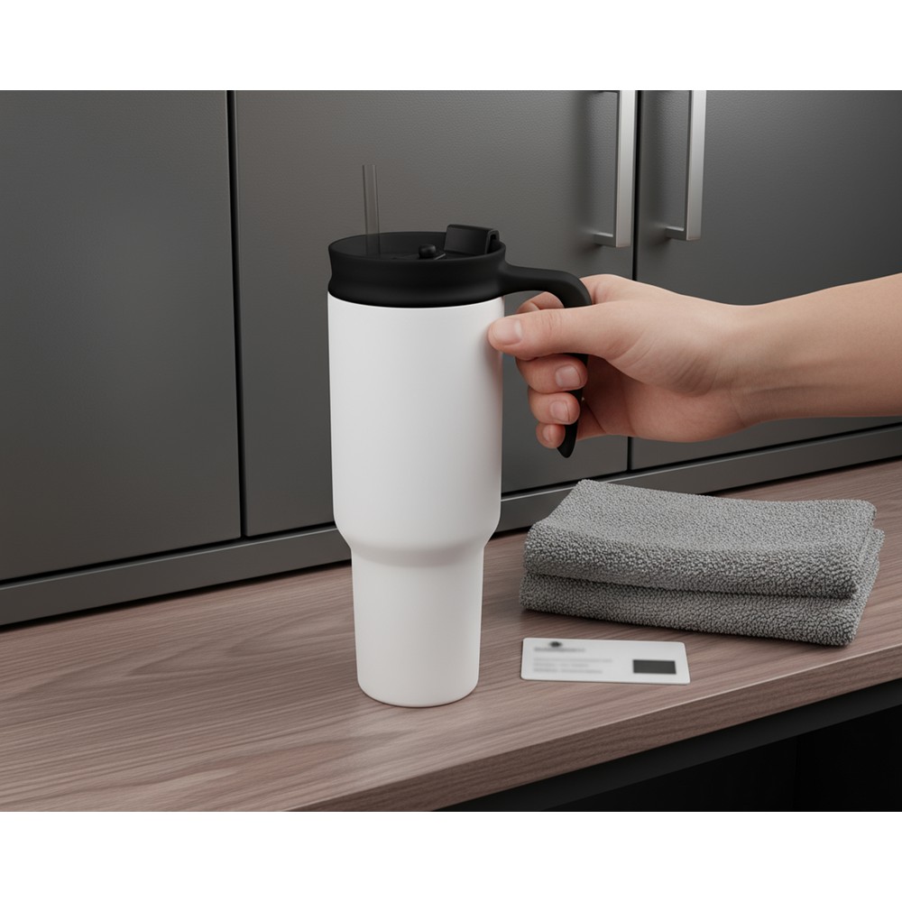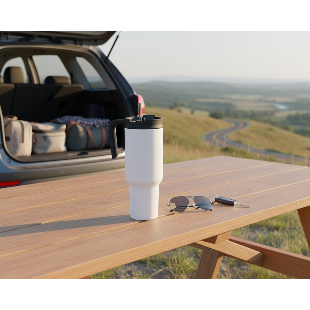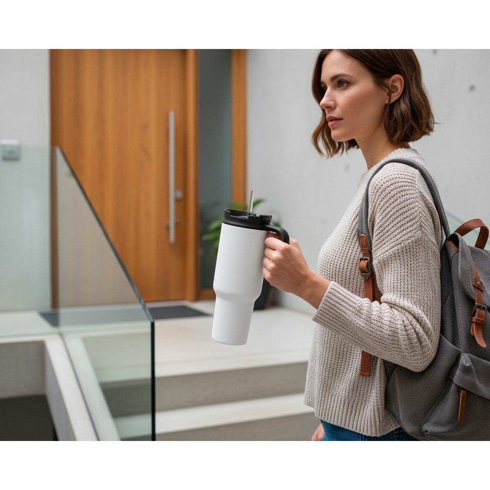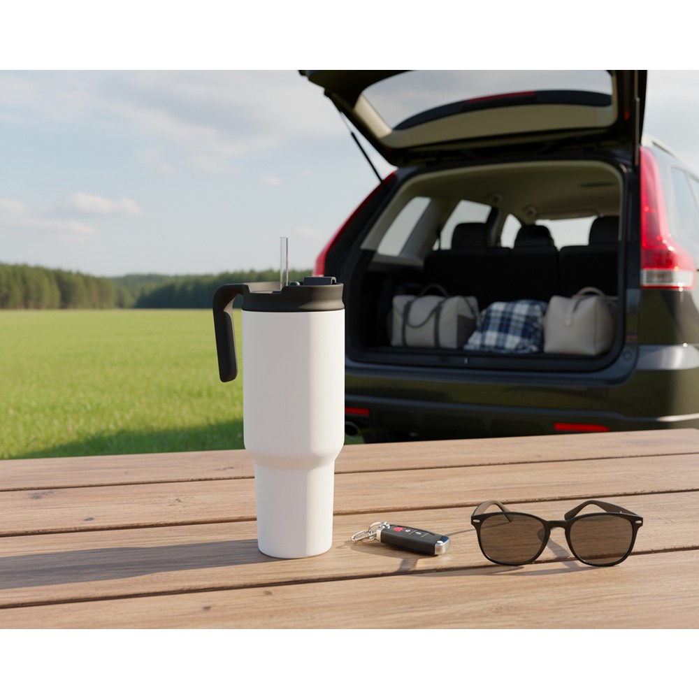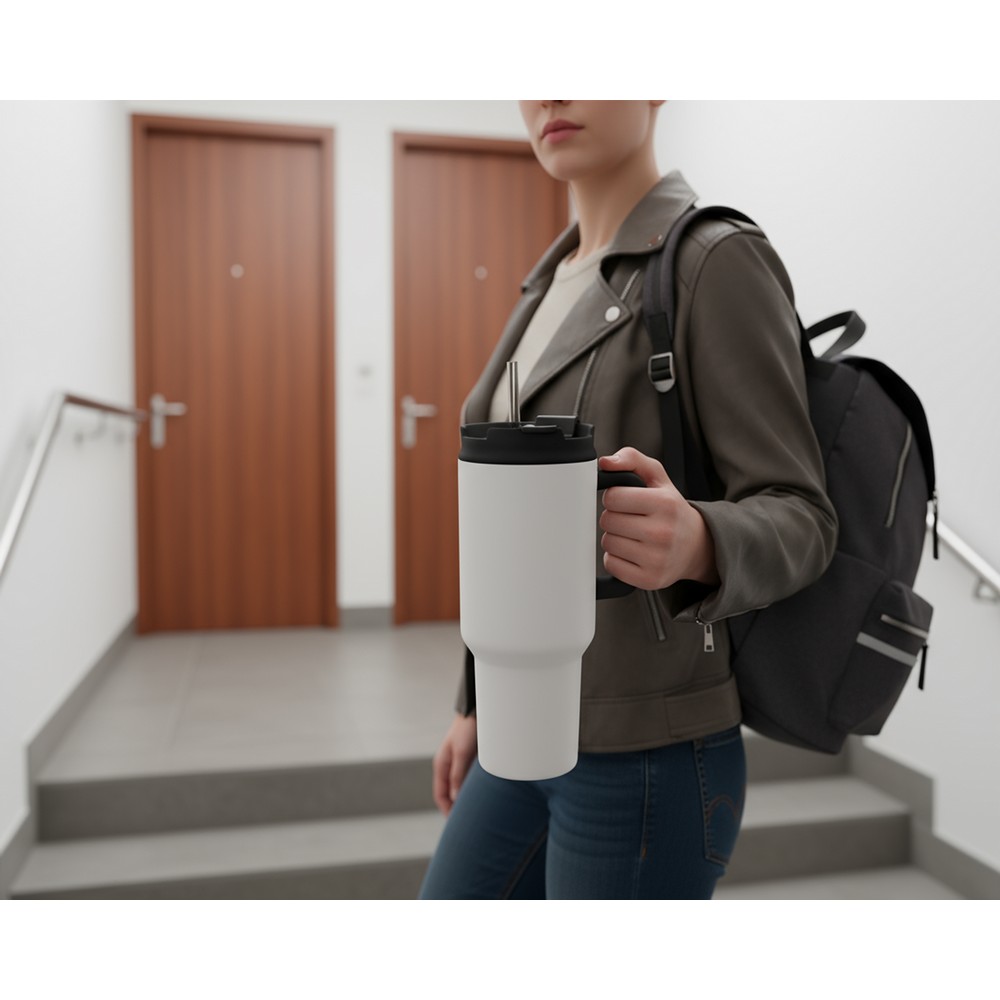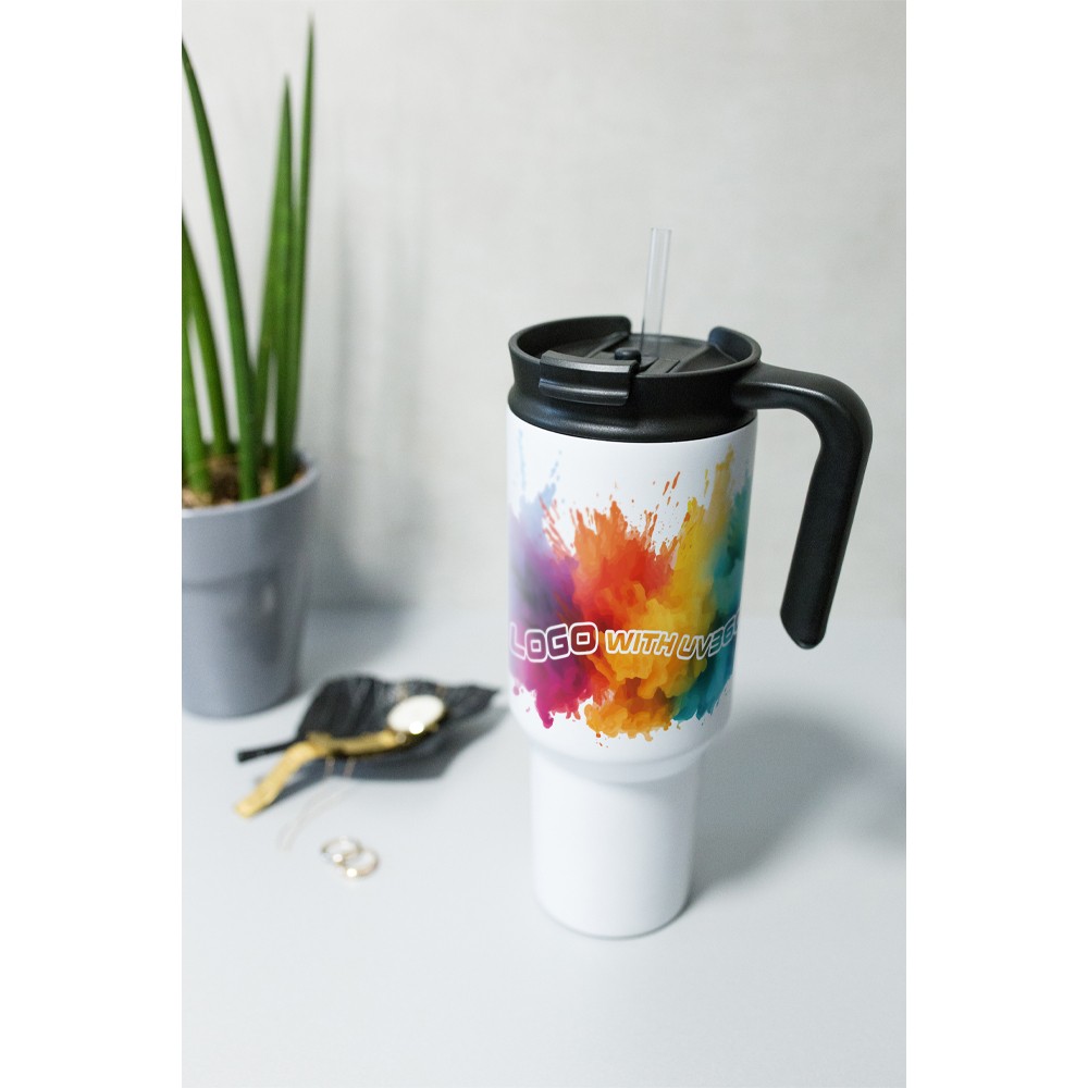 Kubek termiczny 1100 ml Air Gifts ze słomką i ergonomicznym uchwytem, zaprojektowany specjalnie pod technologię znakowania UV360, posiada podwójne ścianki ze stali nierdzewnej z próżnią między ściankami, co spowalnia oddawanie temperatury na zewnątrz, zachowując funkcje termosu, produkt wykonany ze stali nierdzewnej i plastiku, utrzymuje temperaturę napojów gorących do 15 godzin +leakproof