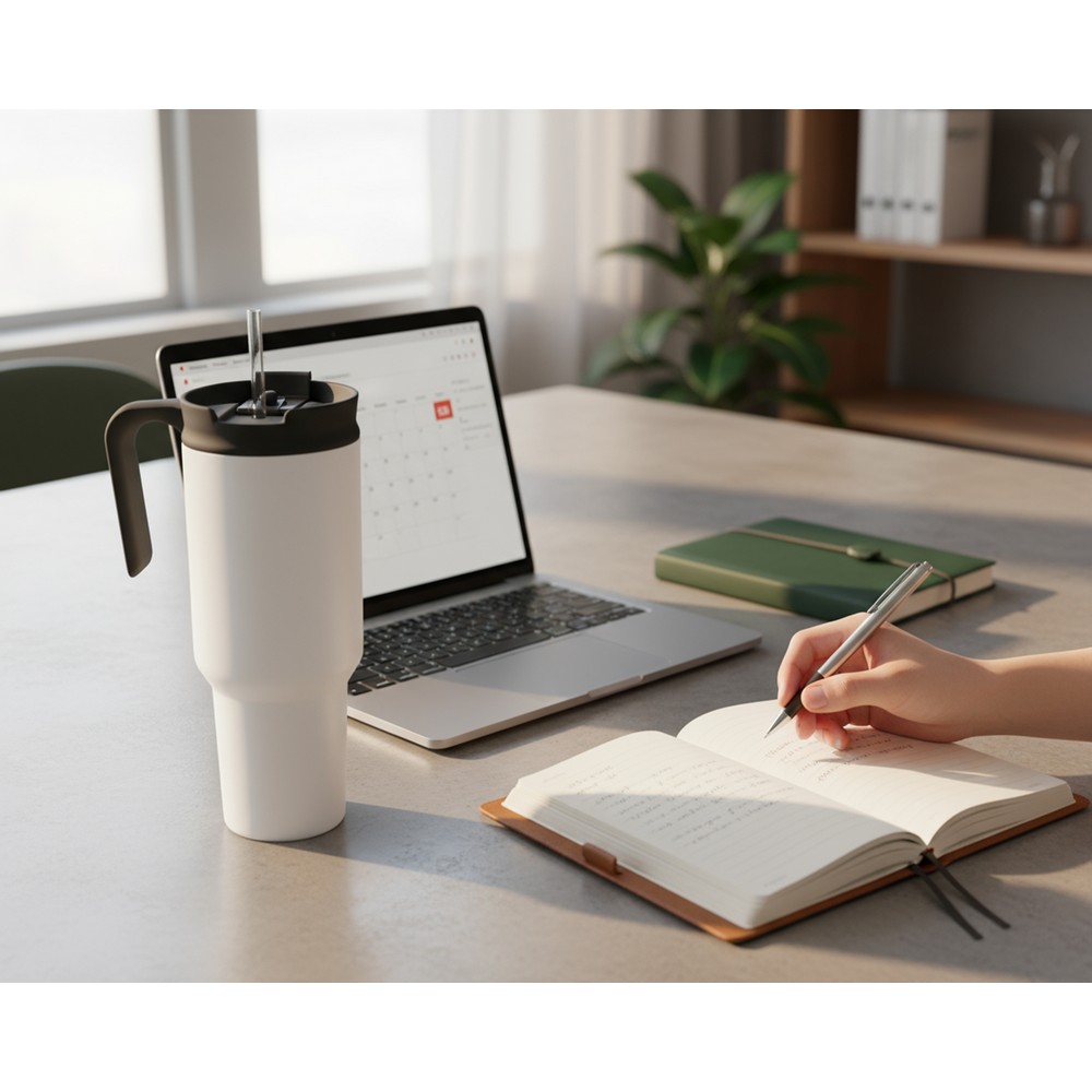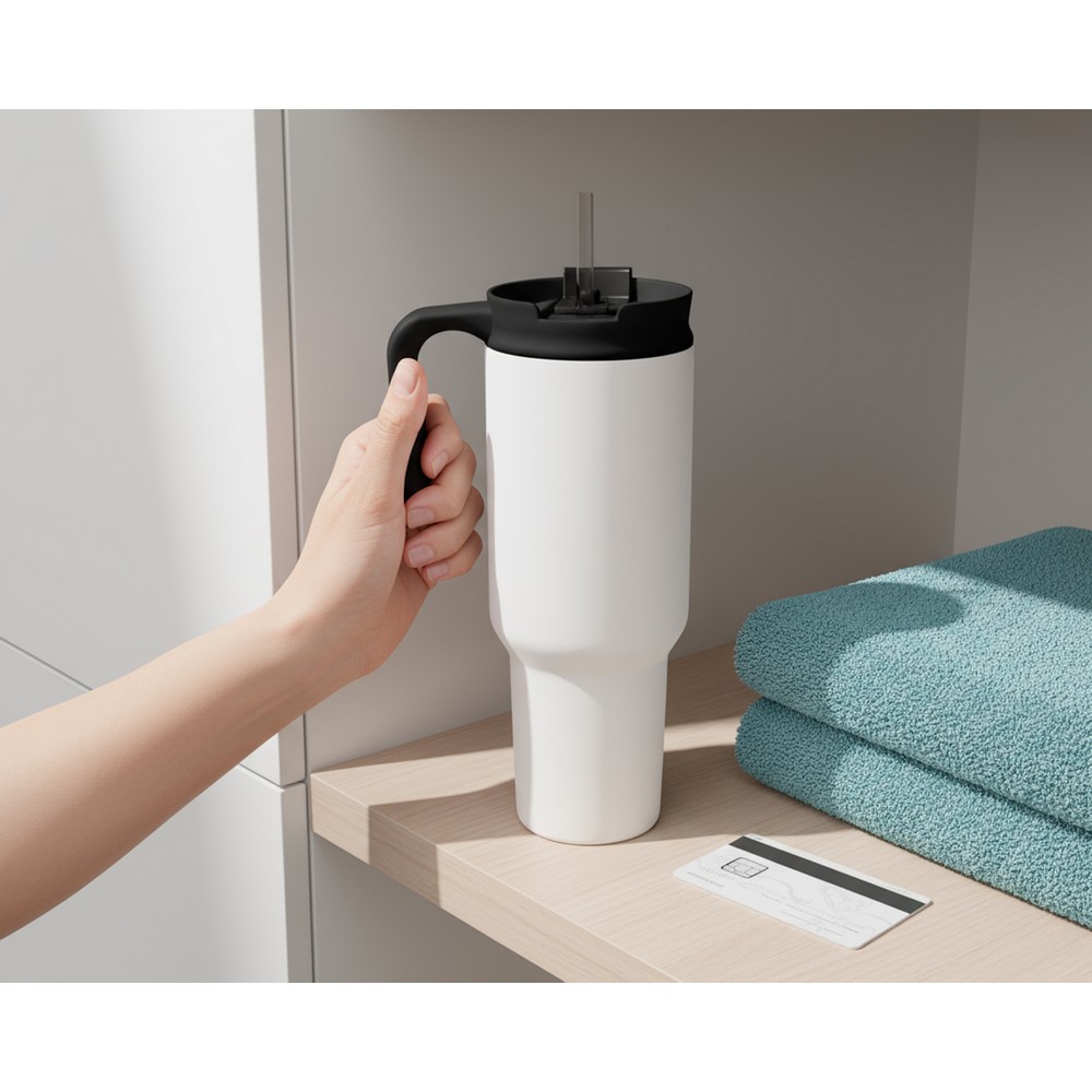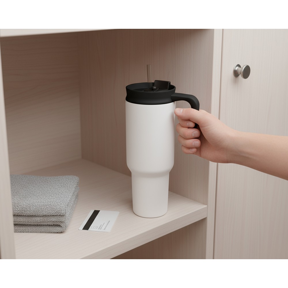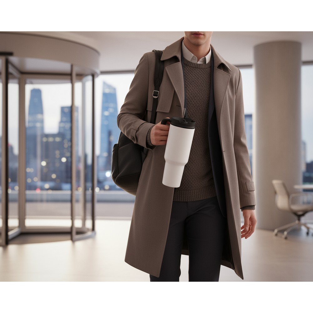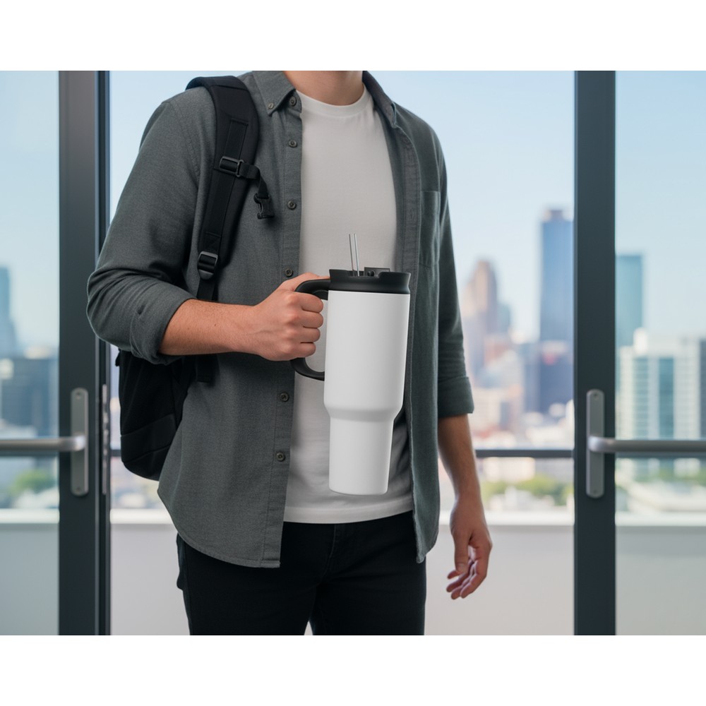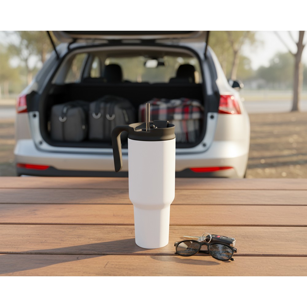 Kubek termiczny 1100 ml Air Gifts ze słomką i ergonomicznym uchwytem, zaprojektowany specjalnie pod technologię znakowania UV360, posiada podwójne ścianki ze stali nierdzewnej z próżnią między ściankami, co spowalnia oddawanie temperatury na zewnątrz, zachowując funkcje termosu, produkt wykonany ze stali nierdzewnej i plastiku, utrzymuje temperaturę napojów gorących do 15 godzin +leakproof