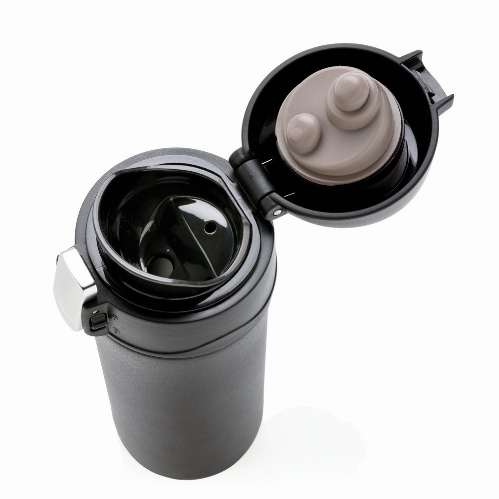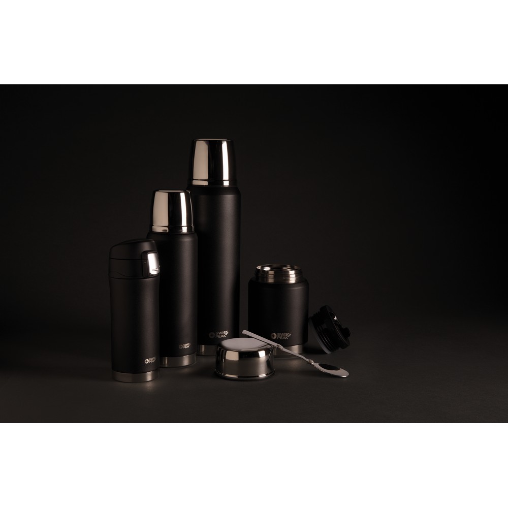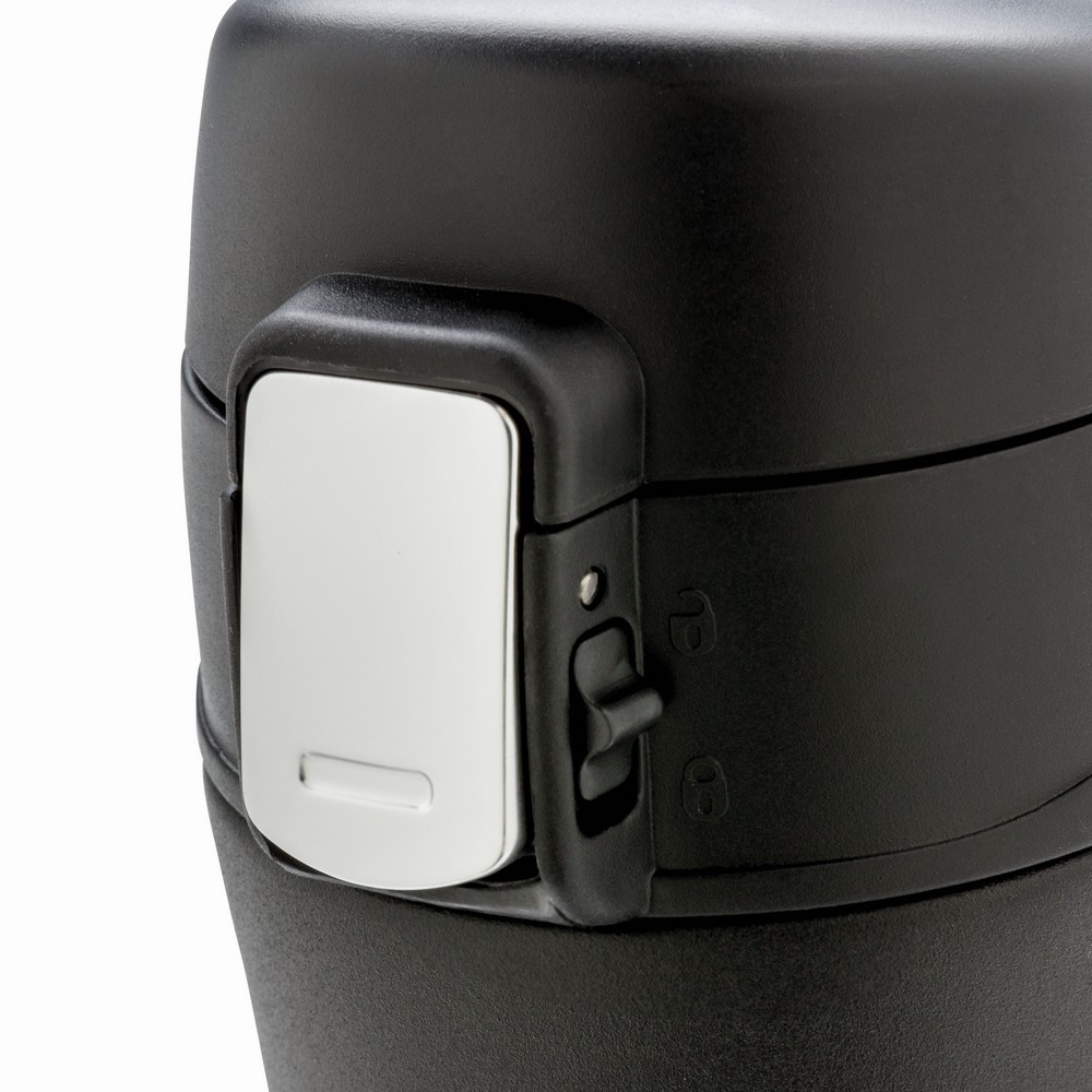 Kubek termiczny 300 ml, podwójne ścianki z próżnią między ściankami, wnętrze ze stali nierdzewnej 18/8, powlekany proszkowo czarny kolor cechujący się niezwykłą trwałością i odpornością na wyblaknięcie czy popękanie, ściana wewnętrzna pokryta miedzią o wysokim poziomie przewodnictwa, szczelny, zamykane wieczko, wyłącznie mycie ręczne, utrzymuje temperaturę napojów gorących do 15 godzin oraz zimnych do 24 godzin