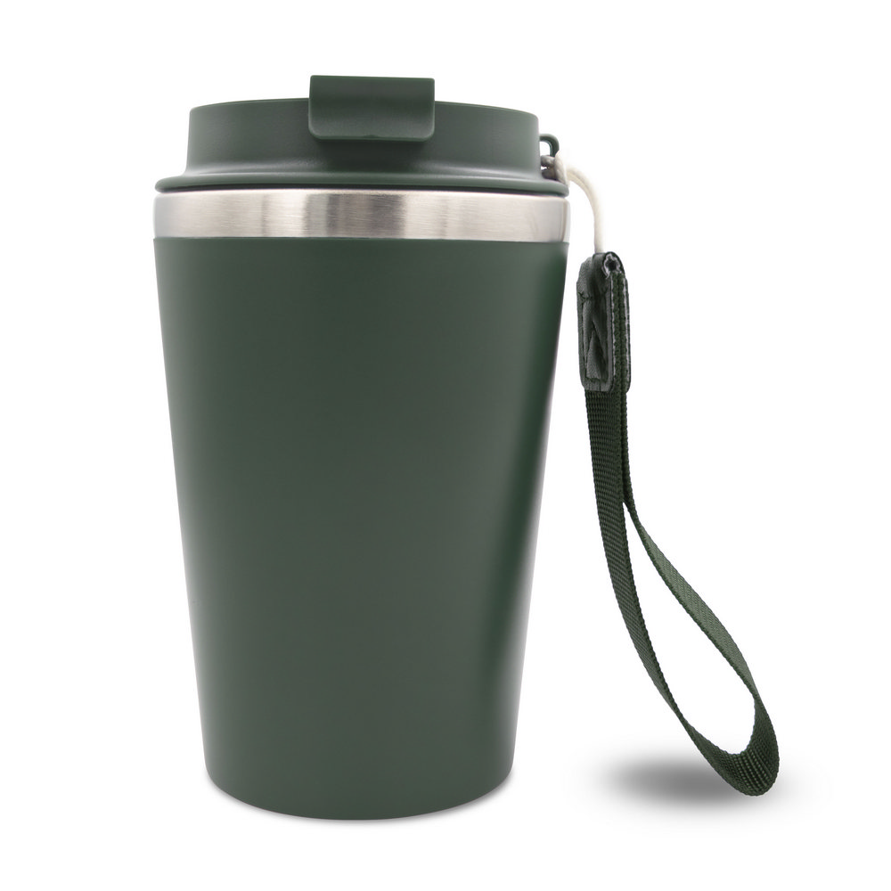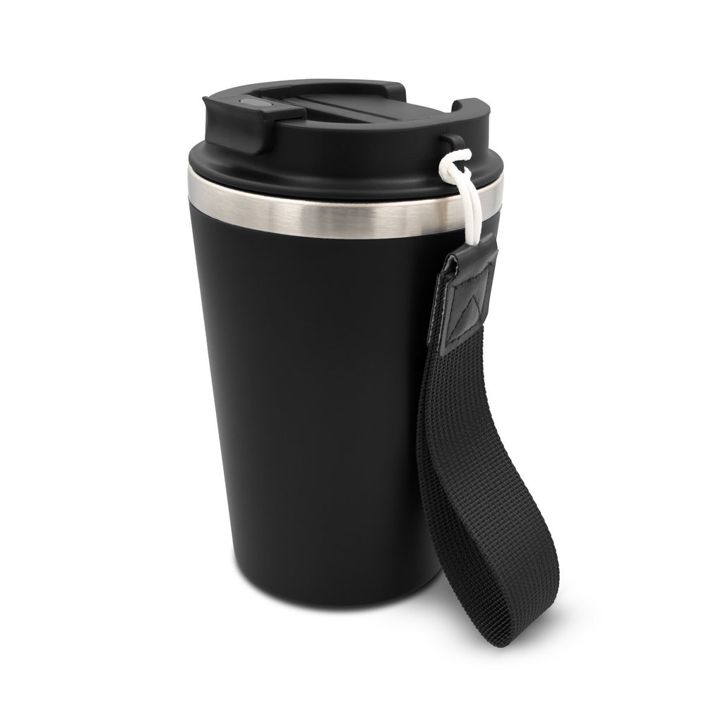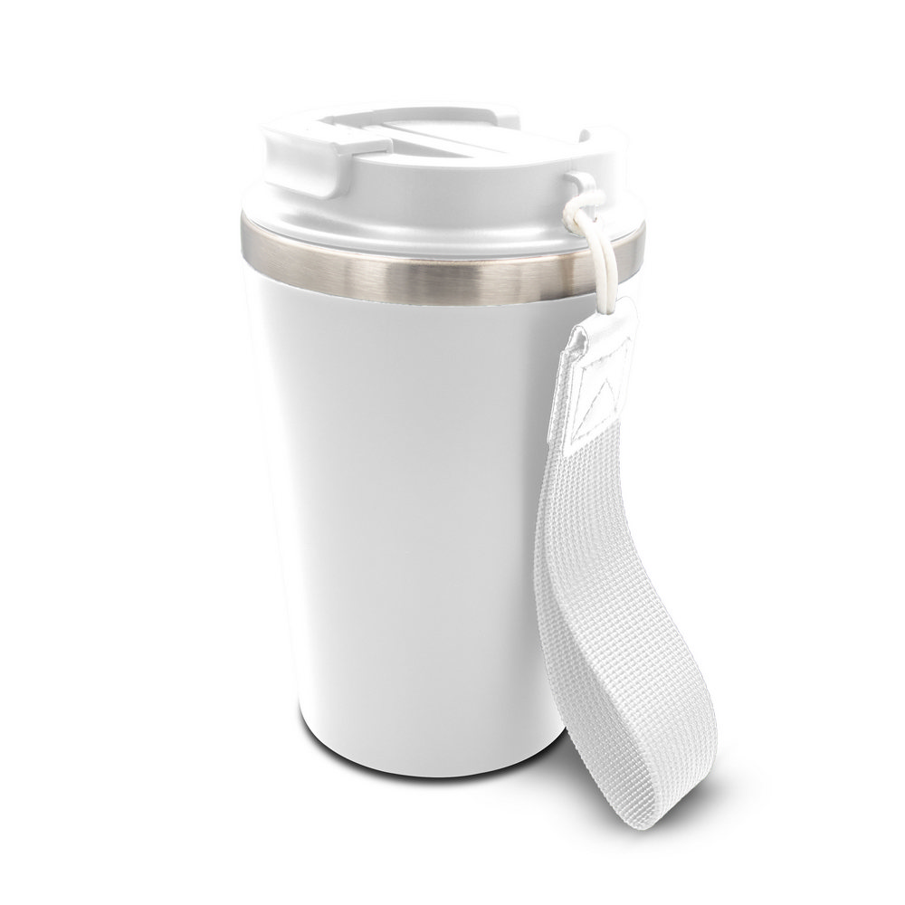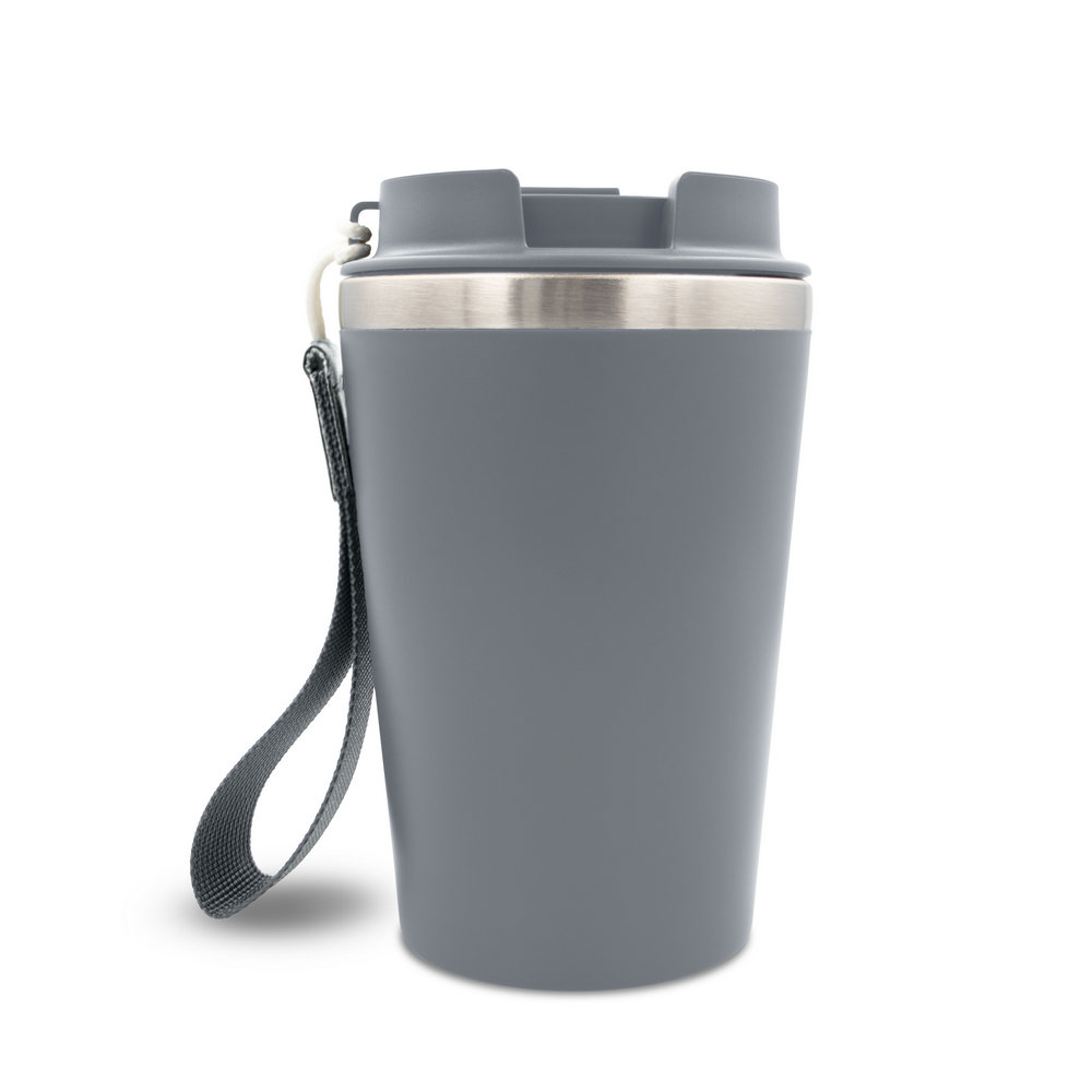 Kubek termiczny 350 ml, posiada podwójne ścianki ze stali nierdzewnej z recyklingu i plastiku, pasek ułatwiający noszenie lub przypięcie, produkt wykonany ze stali nierdzewnej z recyklingu i PP, utrzymuje temperaturę napojów gorących do 4 godzin +leakproof