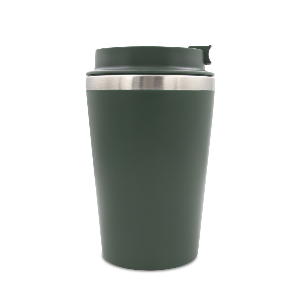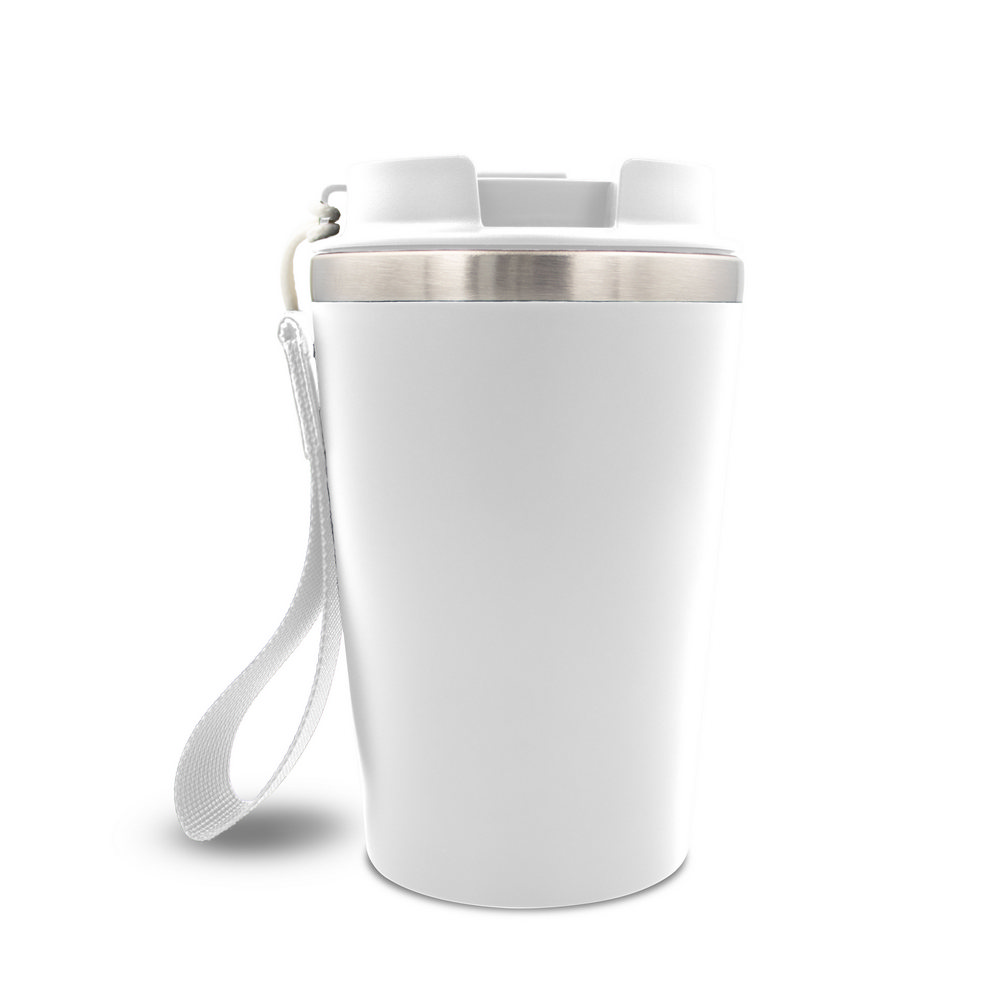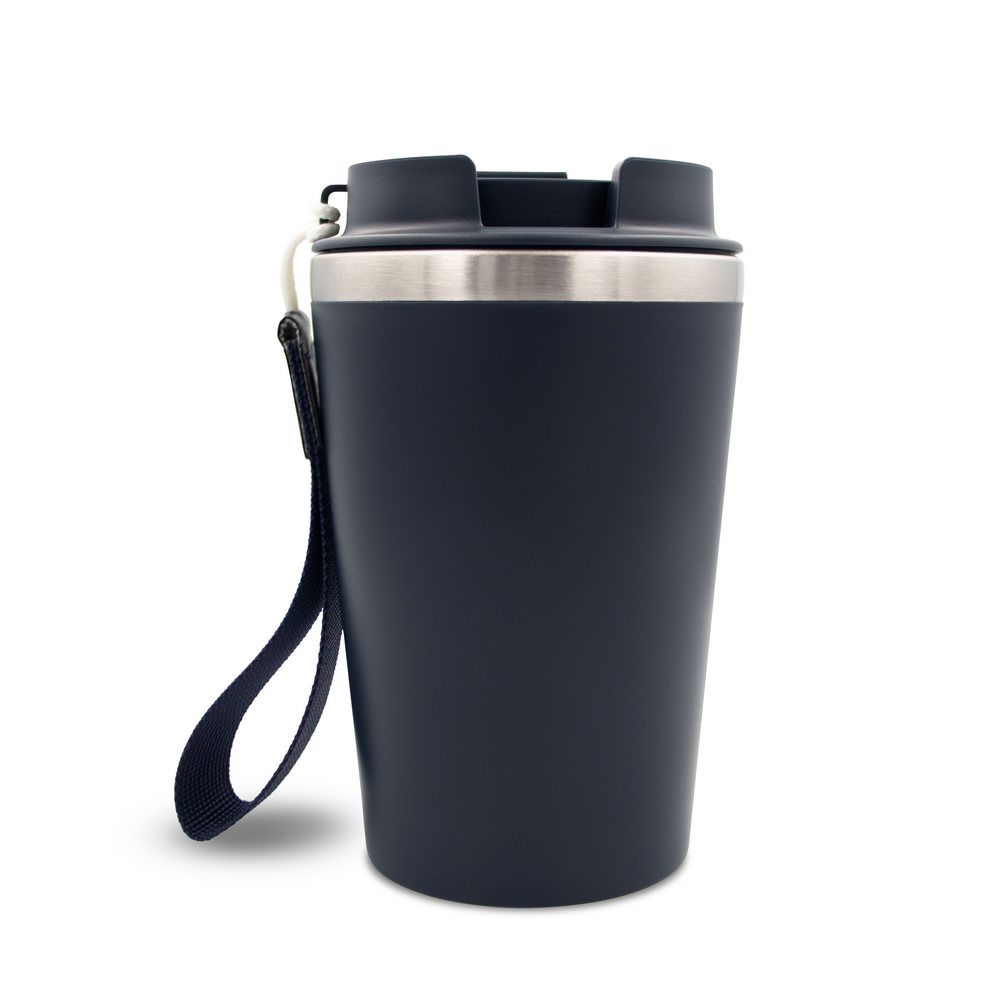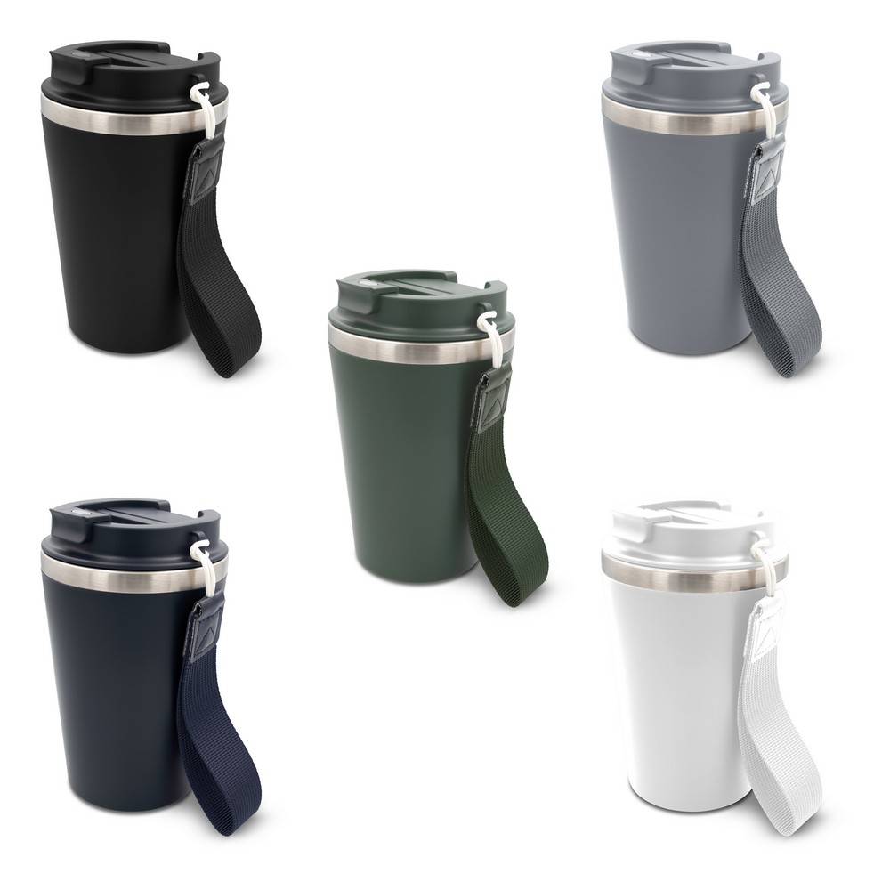 Kubek termiczny 350 ml, posiada podwójne ścianki ze stali nierdzewnej z recyklingu i plastiku, pasek ułatwiający noszenie lub przypięcie, produkt wykonany ze stali nierdzewnej z recyklingu i PP, utrzymuje temperaturę napojów gorących do 4 godzin +leakproof