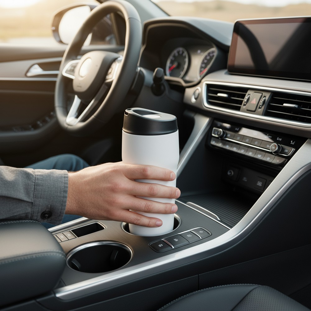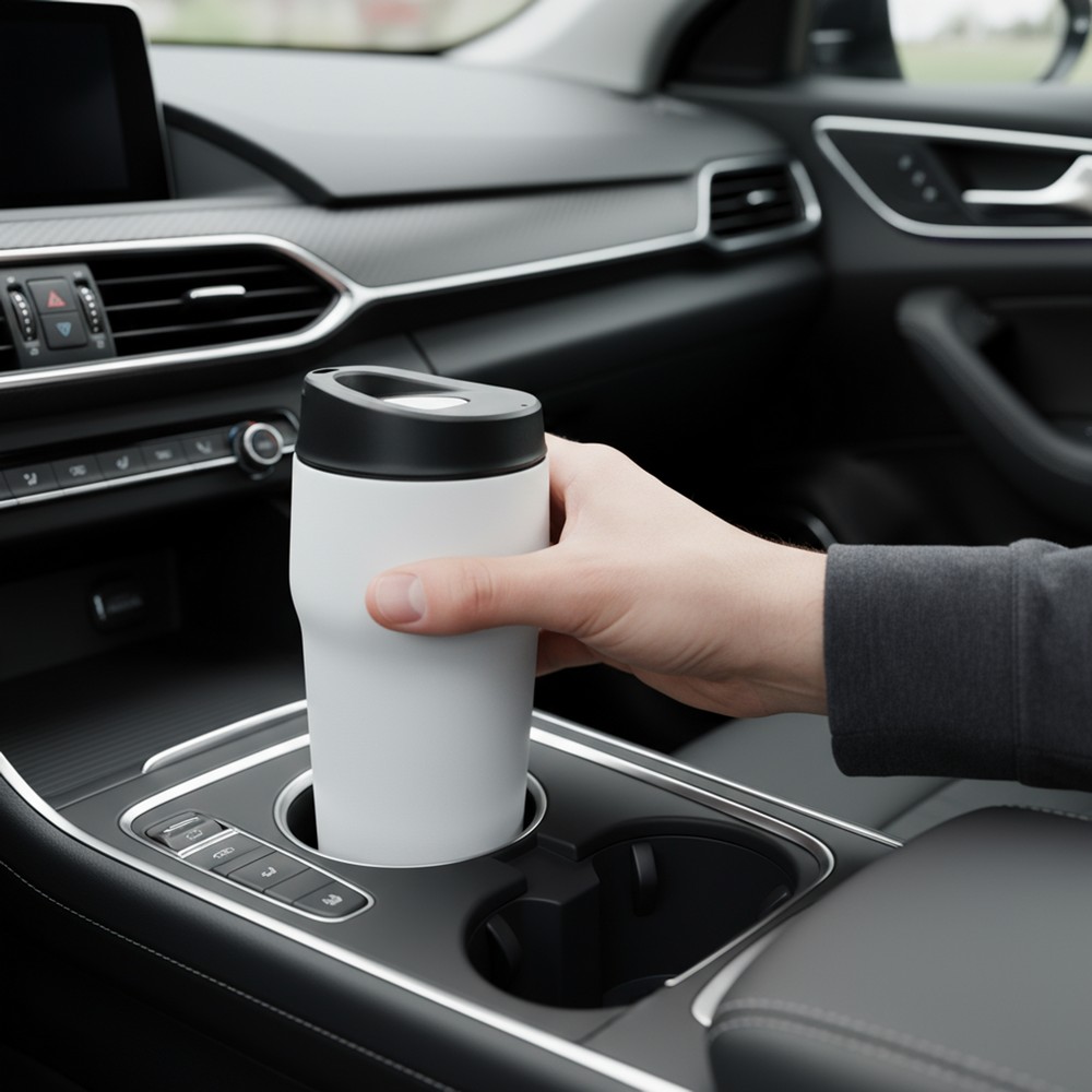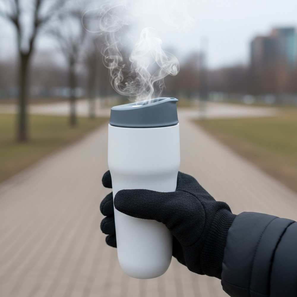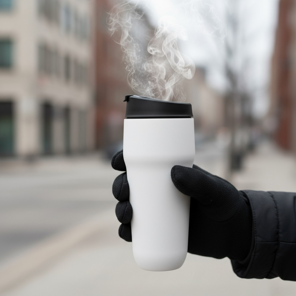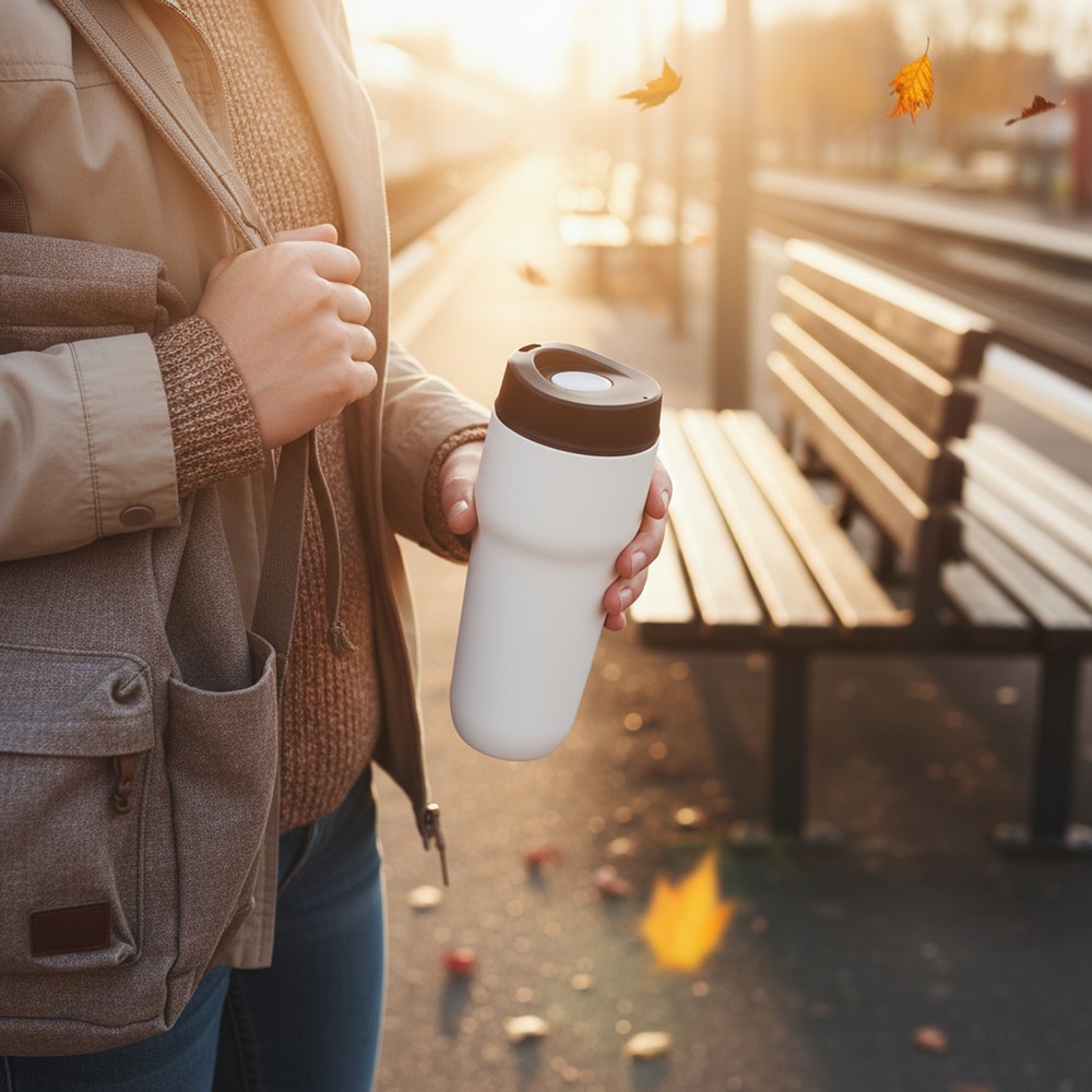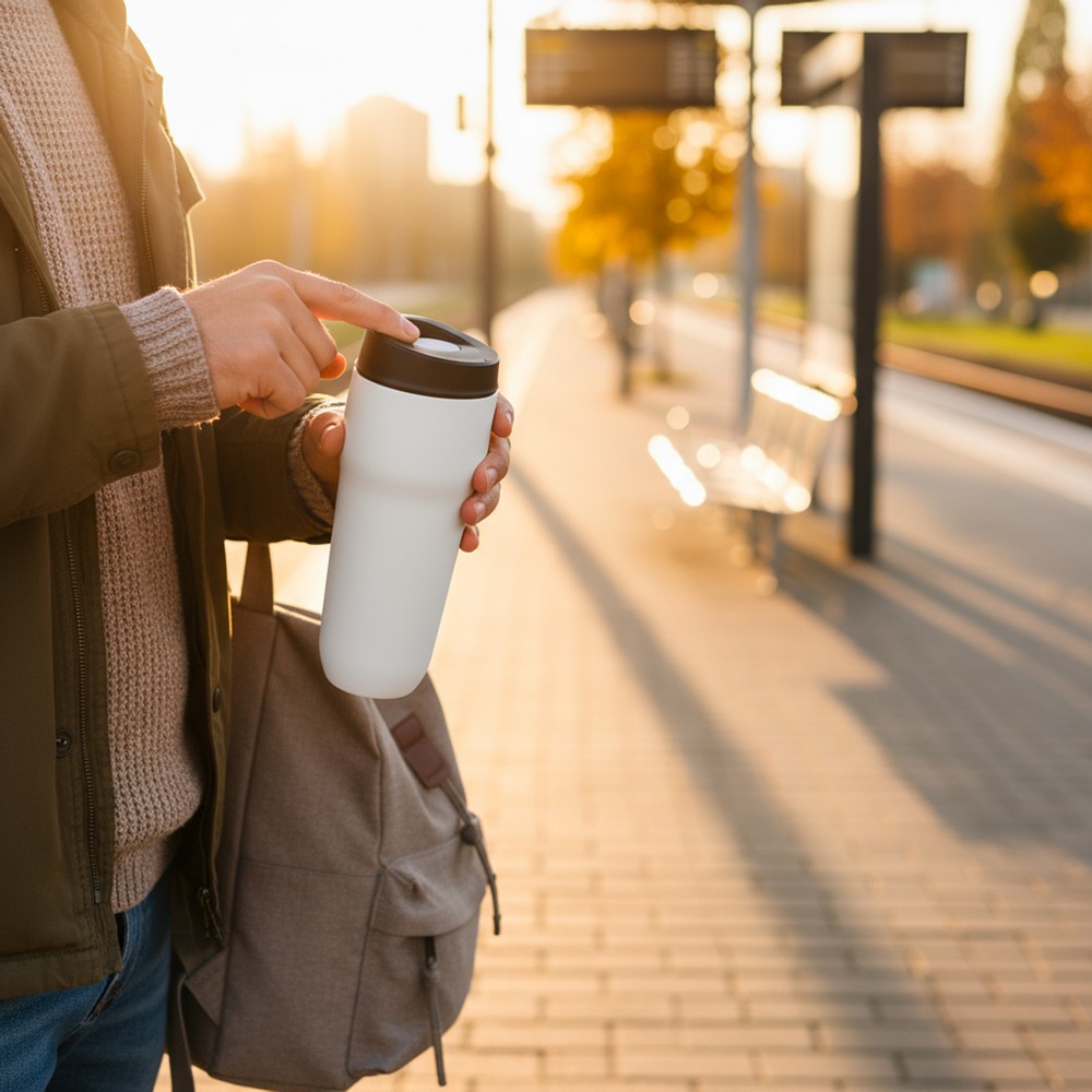 Kubek termiczny 400 ml Air Gifts, posiada podwójne ścianki ze stali nierdzewnej i ceramiki z próżnią między ściankami, co spowalnia oddawanie temperatury na zewnątrz, zachowując funkcje termosu, plastikowe wieczko z przyciskiem otwarcia/zamknięcia ustnika umożliwiającym obsługę jedną ręką, wieczko może zostać rozkręcone w celu ułatwienia czyszczenia, matowe wykończenie, produkt wykonany ze stali nierdzewnej, ceramiki i plastiku, utrzymuje temperaturę napojów gorących do 15 godzin +leakproof