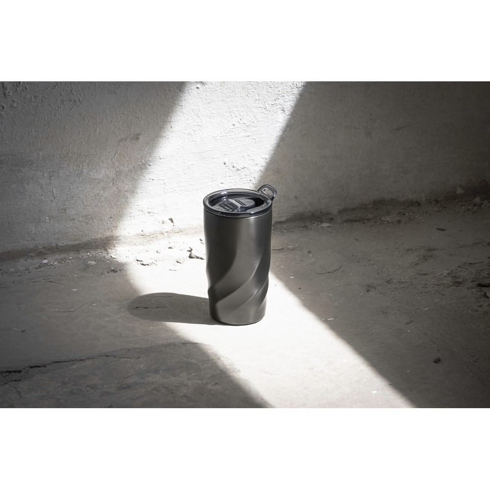 Kubek termiczny 400 ml BrandCharger Vortex Calix, leakproof, zakręcana nakrętka, zaprojektowany żeby przechowywać spienione napoje, nakrętka zawiera pętlę do noszenia, posiada podwójne ścianki ze stali nierdzewnej, co spowalnia oddawanie temperatury na zewnątrz, zachowując funkcje termosu, utrzymuje temperaturę napojów zimnych do 12 godzin, a gorących do 4 godzin, nadaje się do mycia w zmywarce, produkt wykonany ze stali nierdzewnej 304 pochodzącej z recyklingu i tritanu