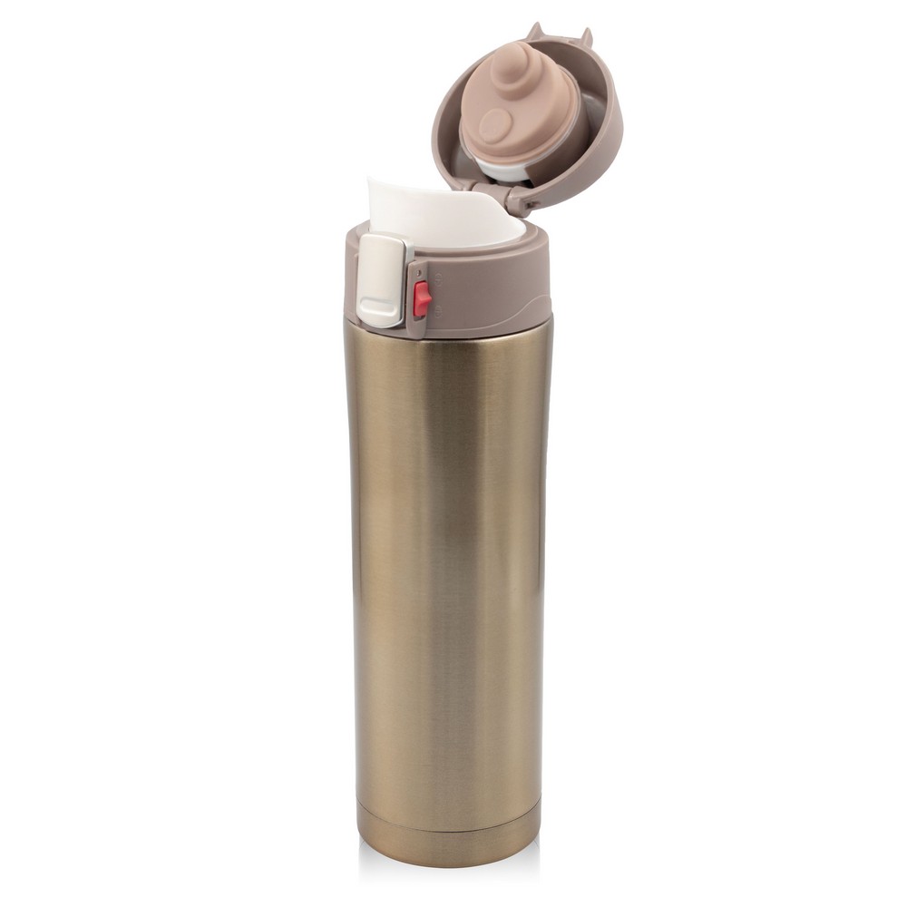 Kubek termiczny 450 ml z podwójnymi ściankami ze stali nierdzewnej z izolacją próżniową spowalniającą oddawanie temperatury na zewnątrz i zachowującą właściwości termosu, wyposażony w płaskie wieczko typu lock z wygodnym mechanizmem otwierania jedną ręką, szczelna konstrukcja leakproof
