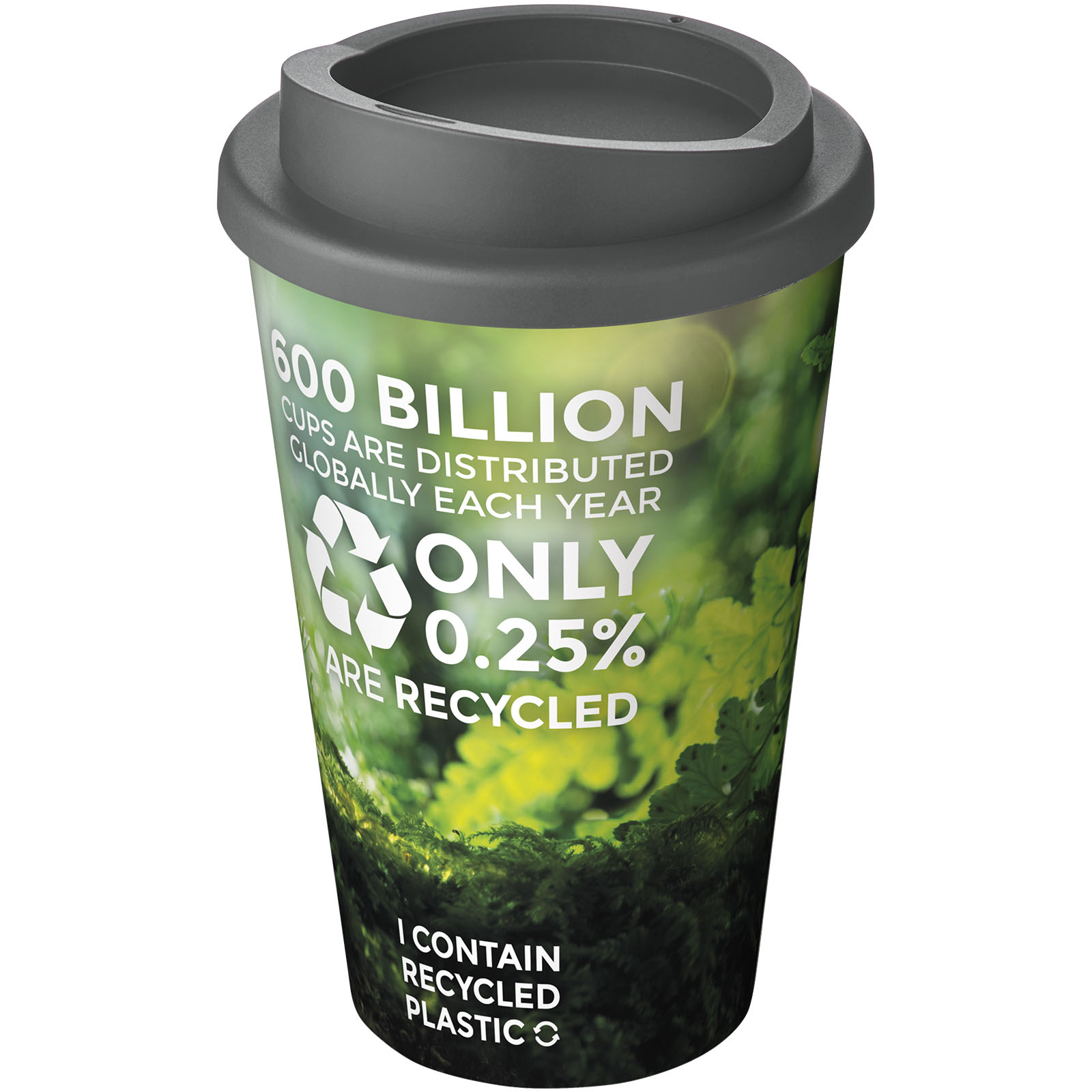 Dwuwarstwowy, izolowany kubek z zakręcaną pokrywą odporną na zalanie. Zewnętrzna warstwa kubka wykonana jest z tworzywa sztucznego pochodzącego z recyklingu. Kubek charakteryzuje się pełnokolorowym, zawijanym wzorem dopasowanym do produktu, dzięki czemu jest trwały. Zgodny z EN12875-1; nadaje się do mycia w zmywarce oraz podgrzewania w kuchence mikrofalowej. Pojemność wynosi 350 ml. Mieszaj i łącz kolory, aby stworzyć idealny kubek. Wykonano w Wielkiej Brytanii. Produkt wolny od BPA. Można myć w zmywarce.