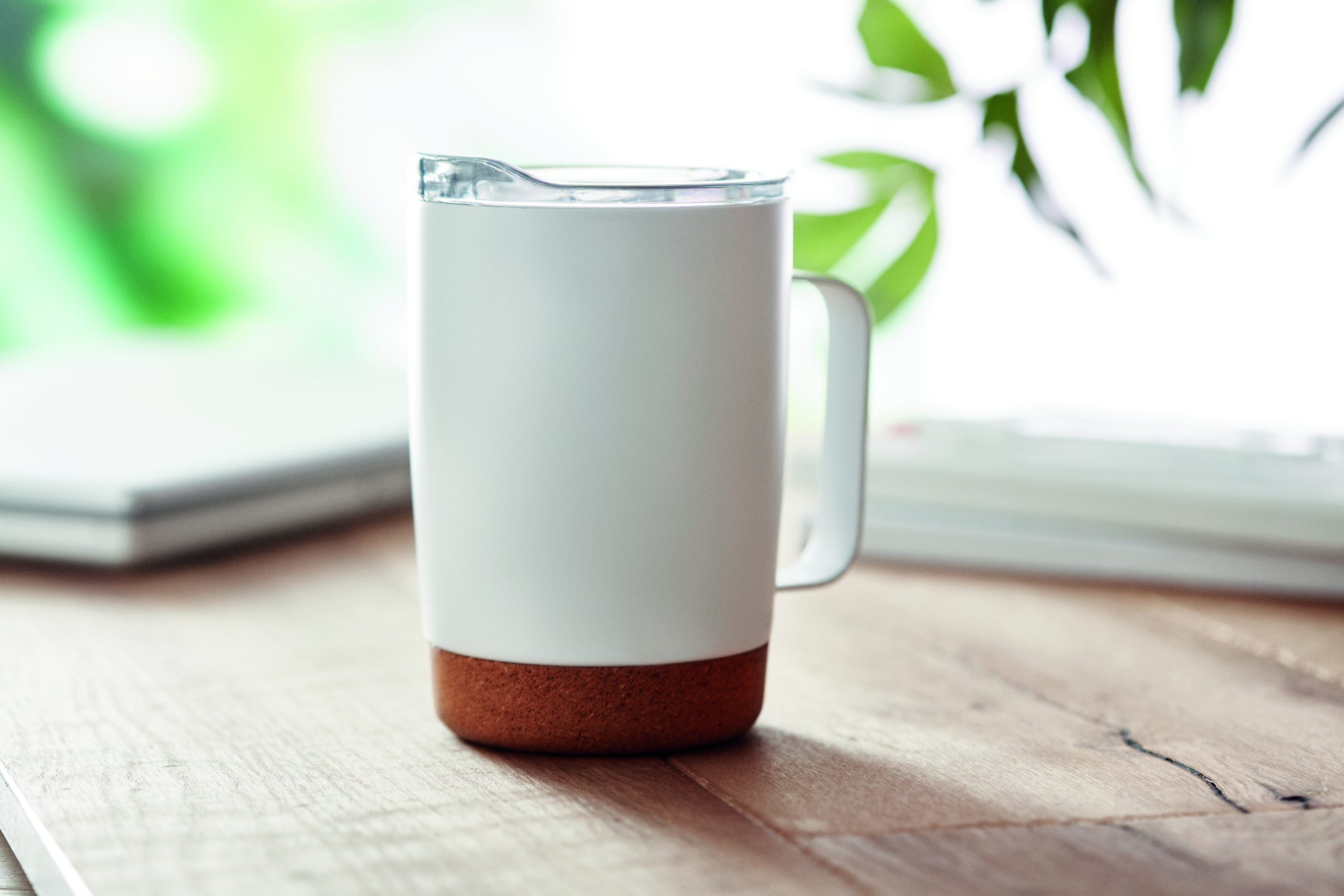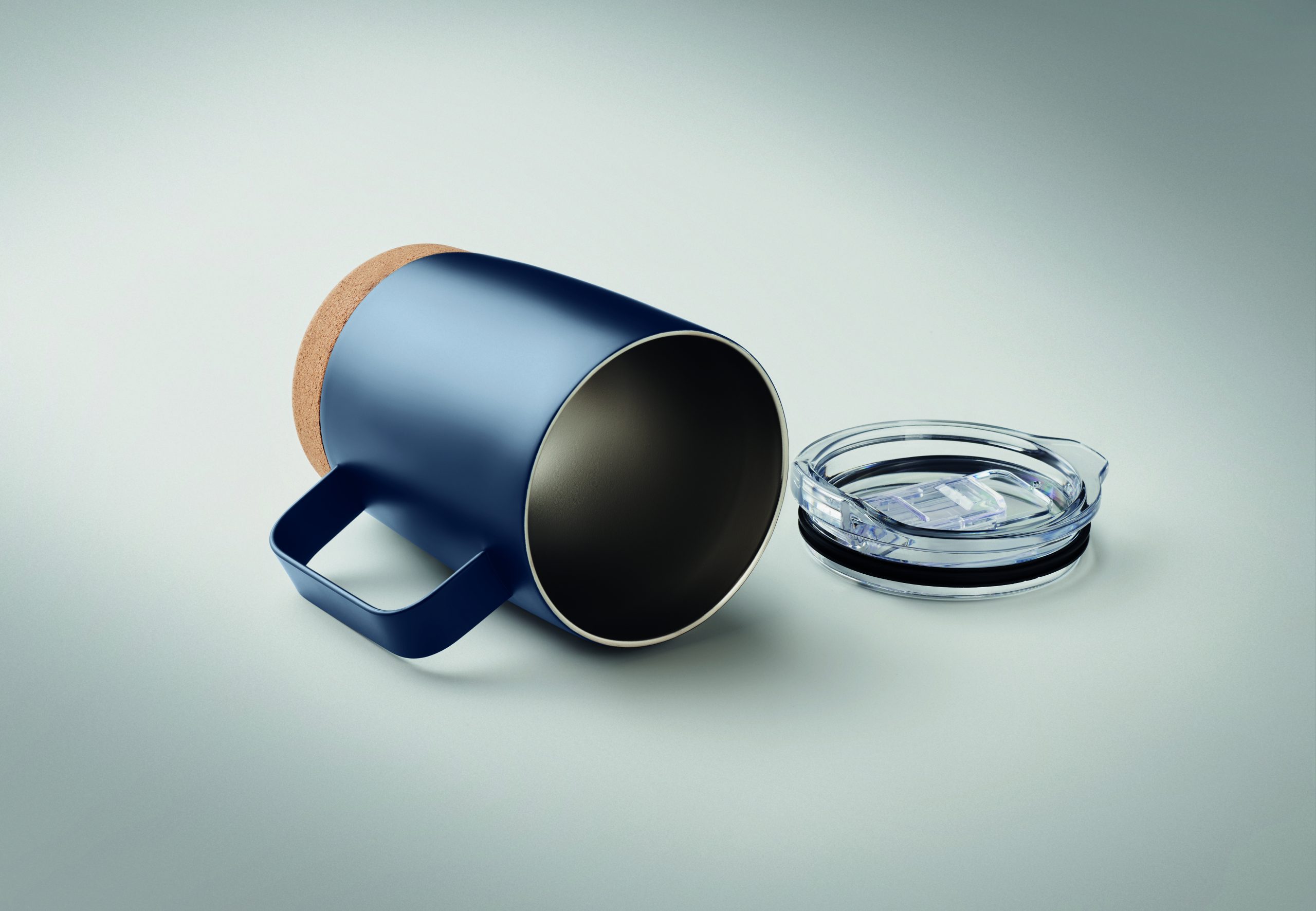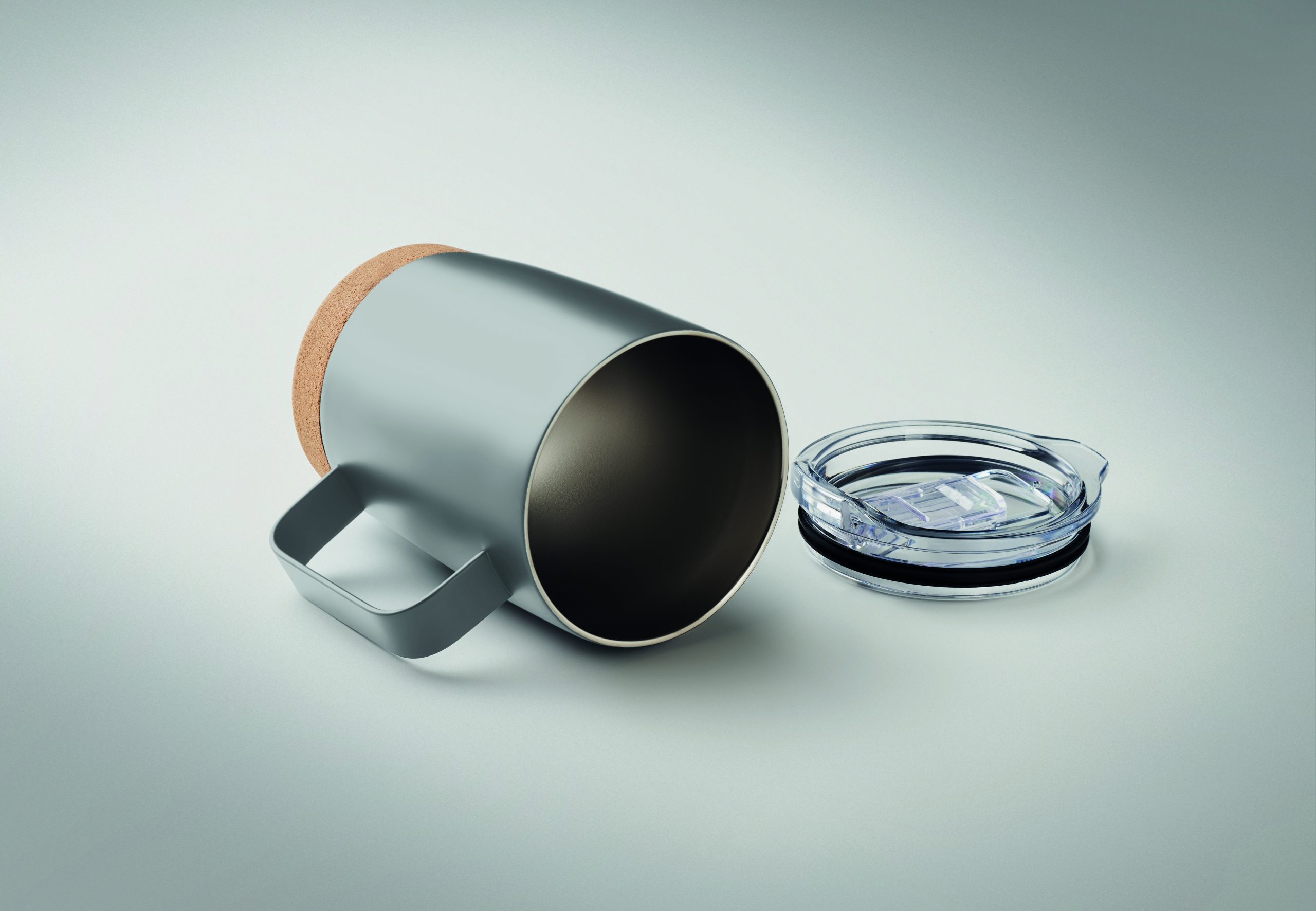 Dwuścienny kubek ze stali nierdzewnej z korkową podstawą i przesuwaną pokrywą z otworem. Pojemność: 300 ml. Korek jest materiałem w 100% naturalnym. Ze względu na jego strukturę i porowatość powierzchni ostateczny wygląd nadruku na każdym artykule może się różnić. szczelny.