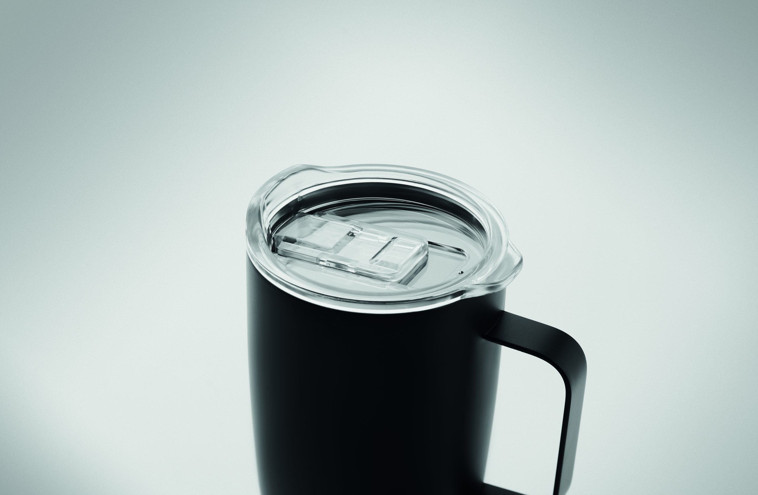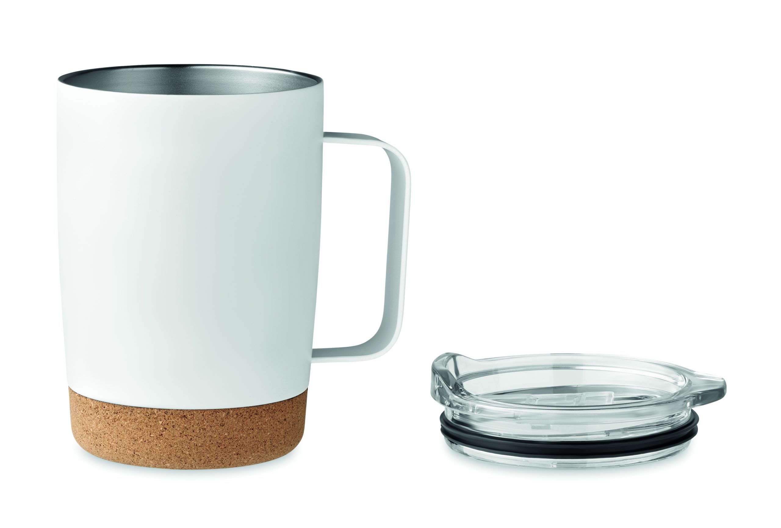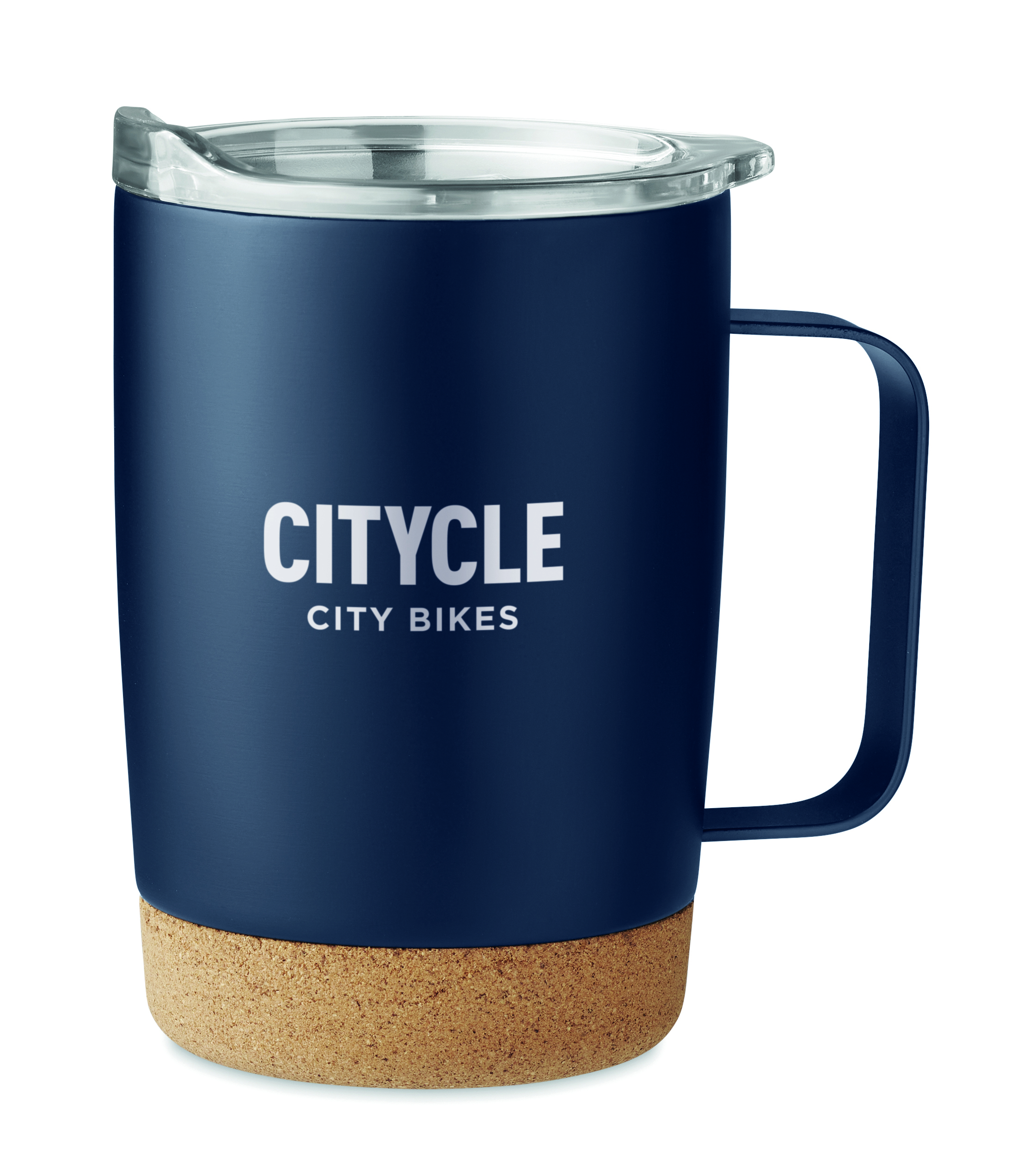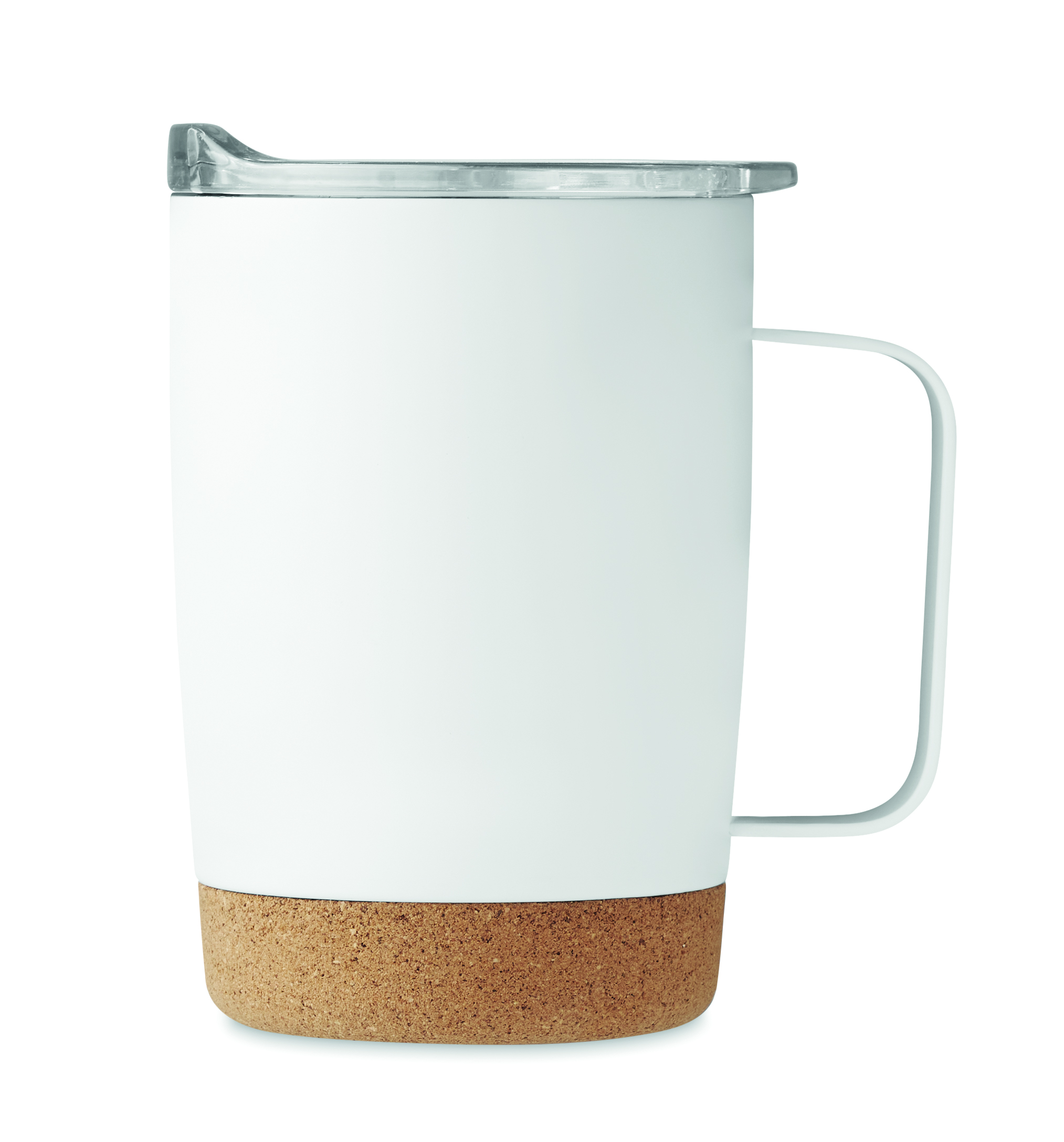 Dwuścienny kubek ze stali nierdzewnej z korkową podstawą i przesuwaną pokrywą z otworem. Pojemność: 300 ml. Korek jest materiałem w 100% naturalnym. Ze względu na jego strukturę i porowatość powierzchni ostateczny wygląd nadruku na każdym artykule może się różnić. szczelny.
