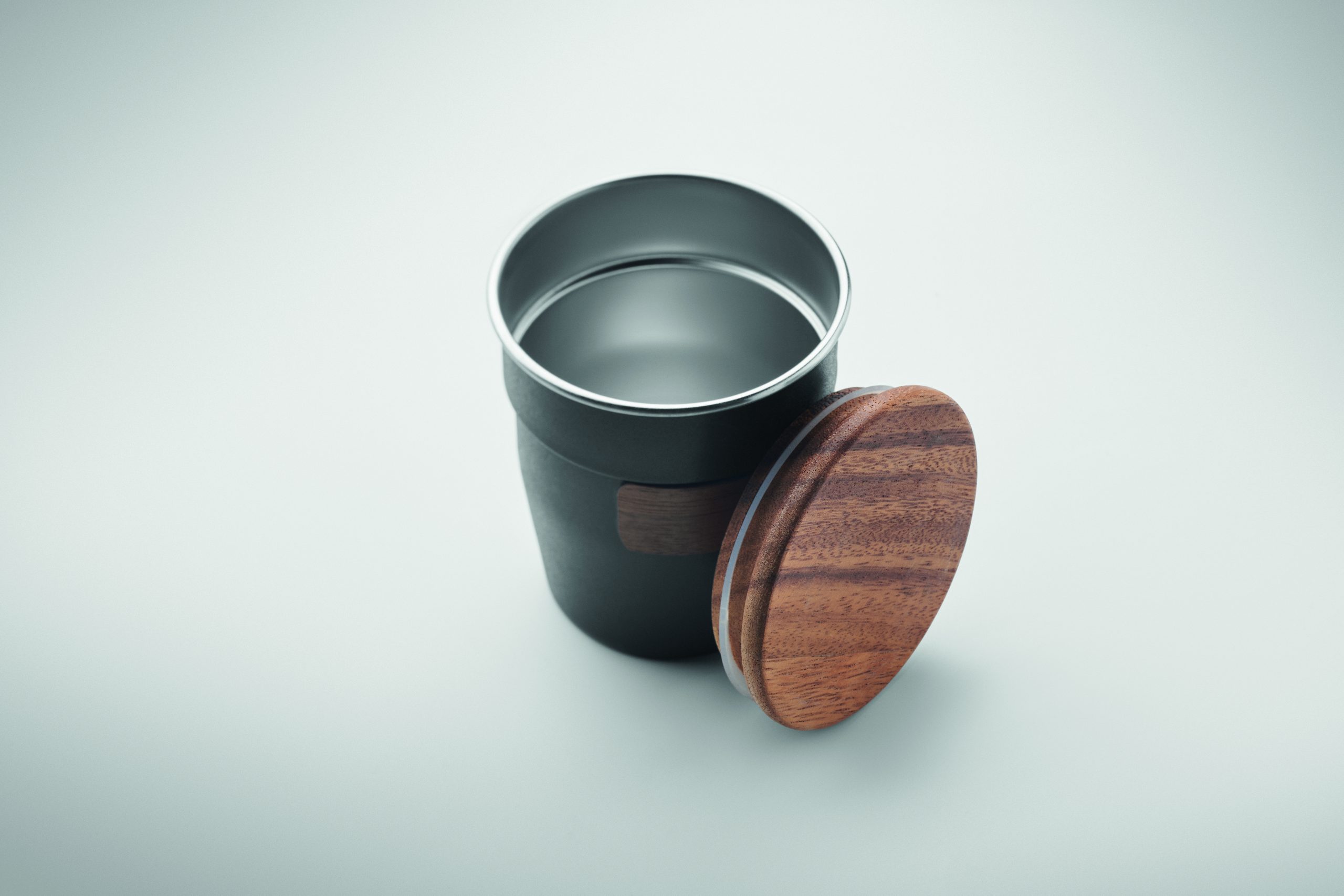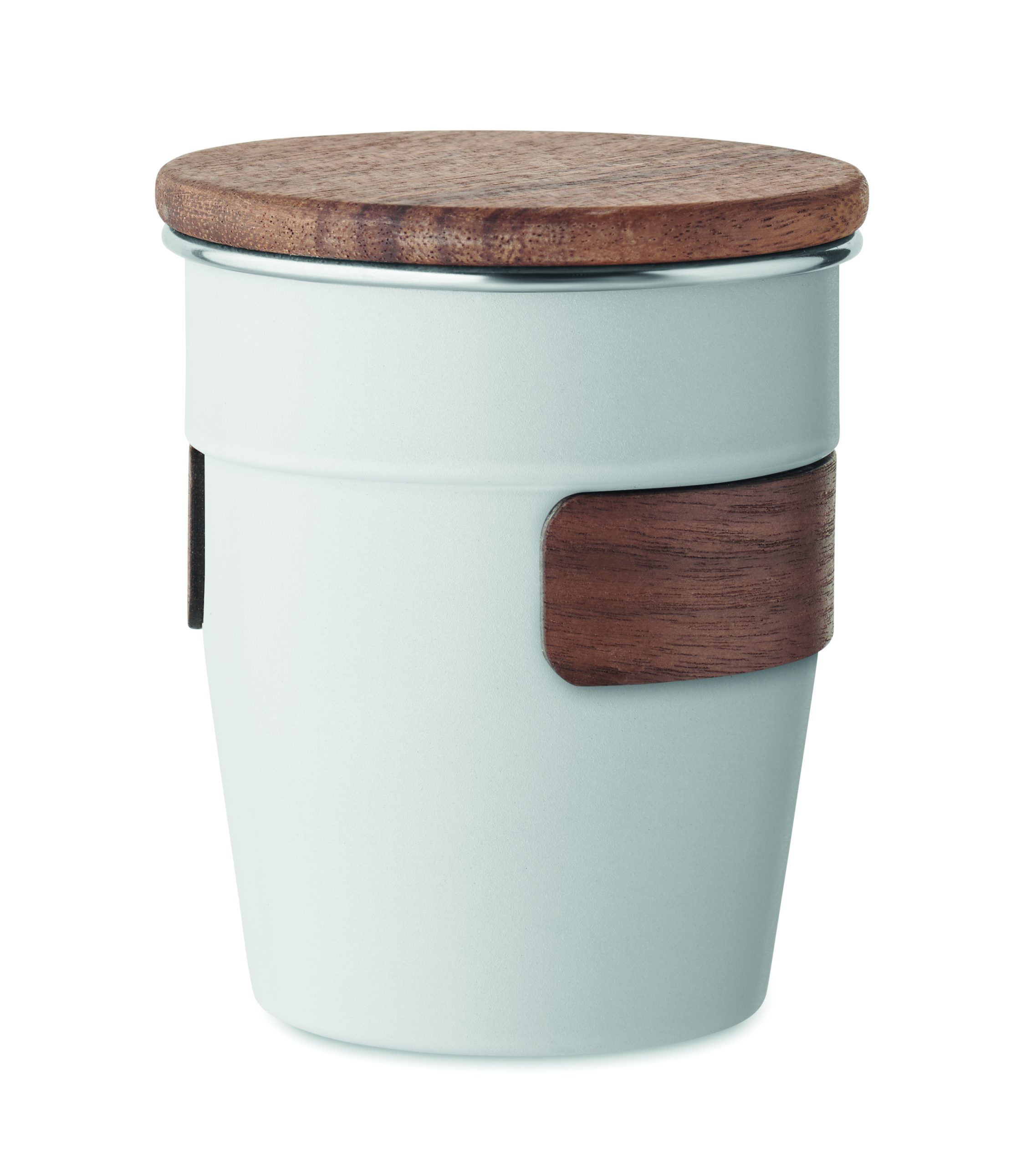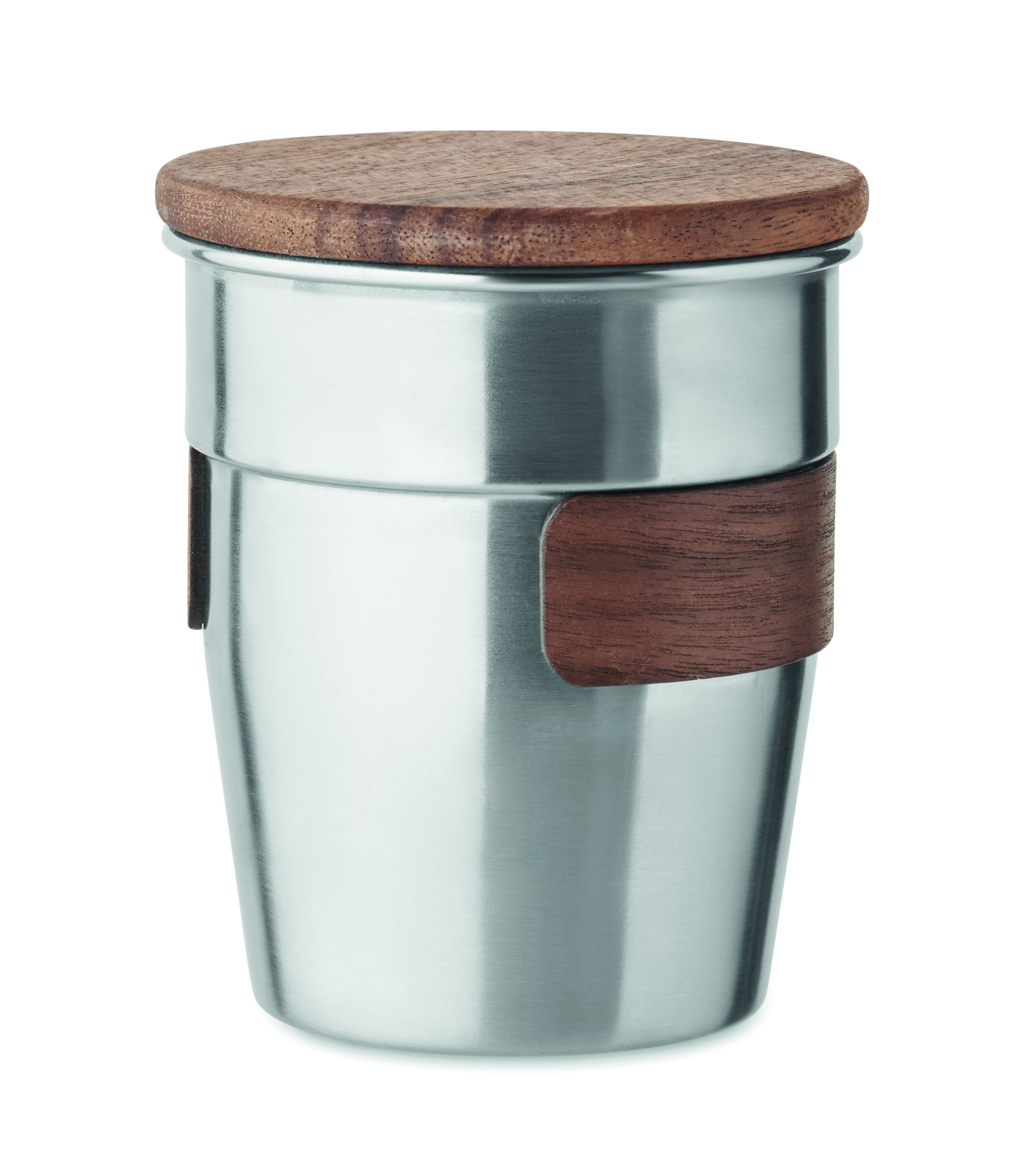 Jednościenny kubek z recyklingowanej stali nierdzewnej (90% stali nierdzewnej z recyklingu i 10% stali nierdzewnej) z uchwytem i pokrywką. Pojemność: 350 ml. Zdejmowany uchwyt do czyszczenia.