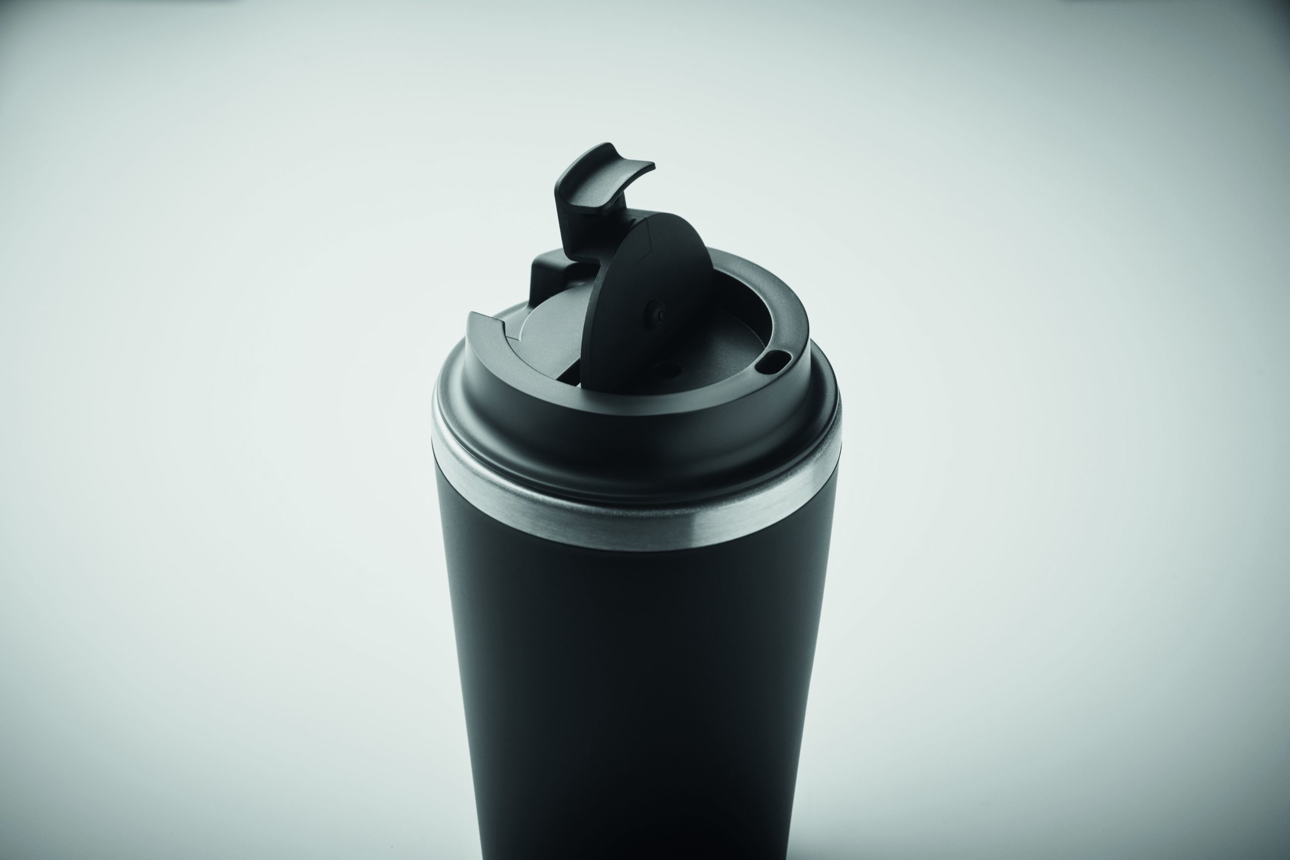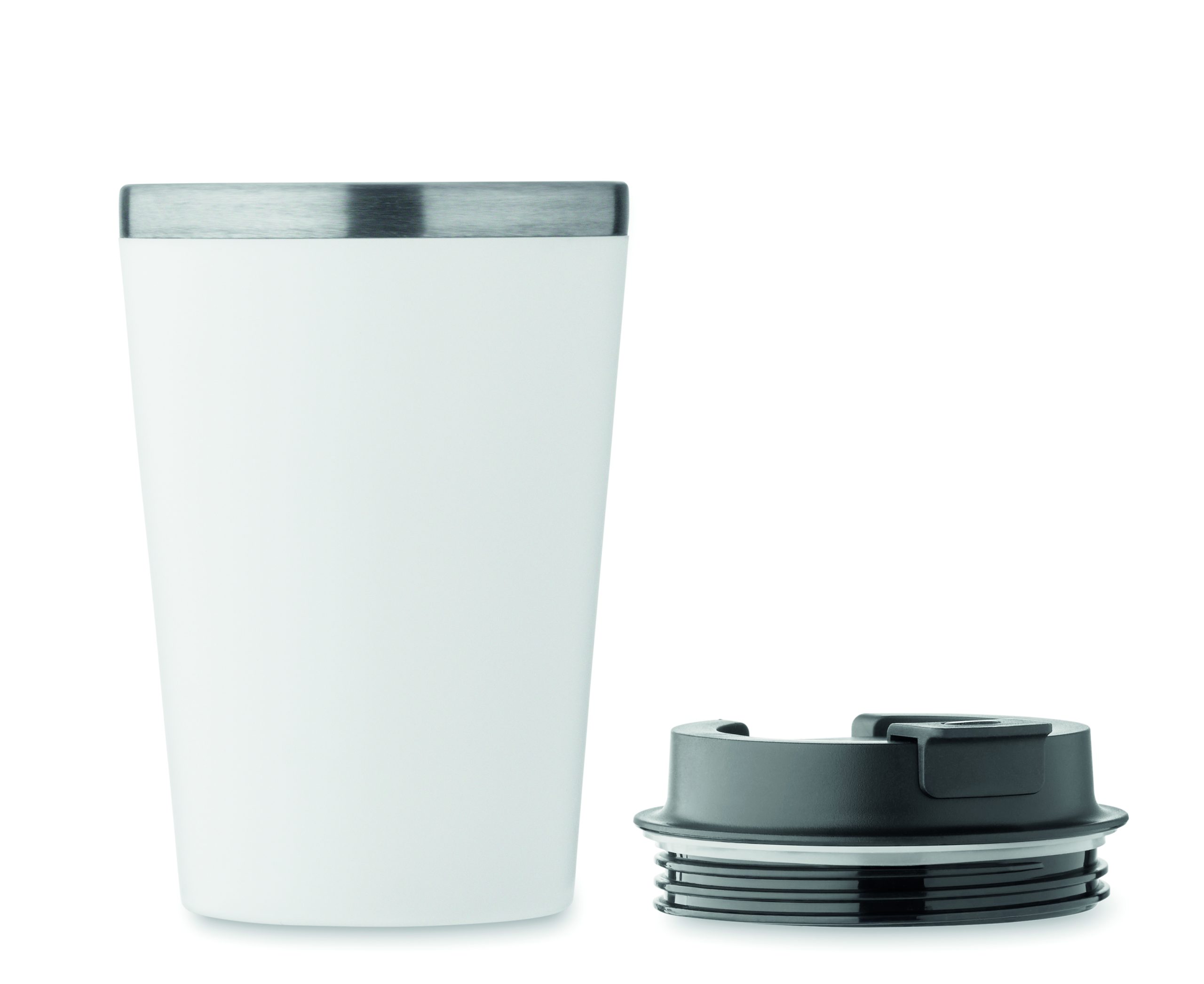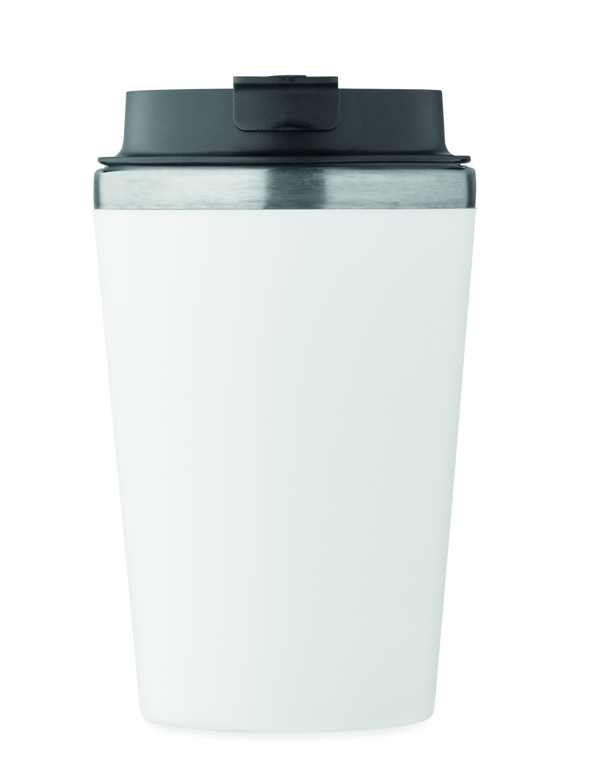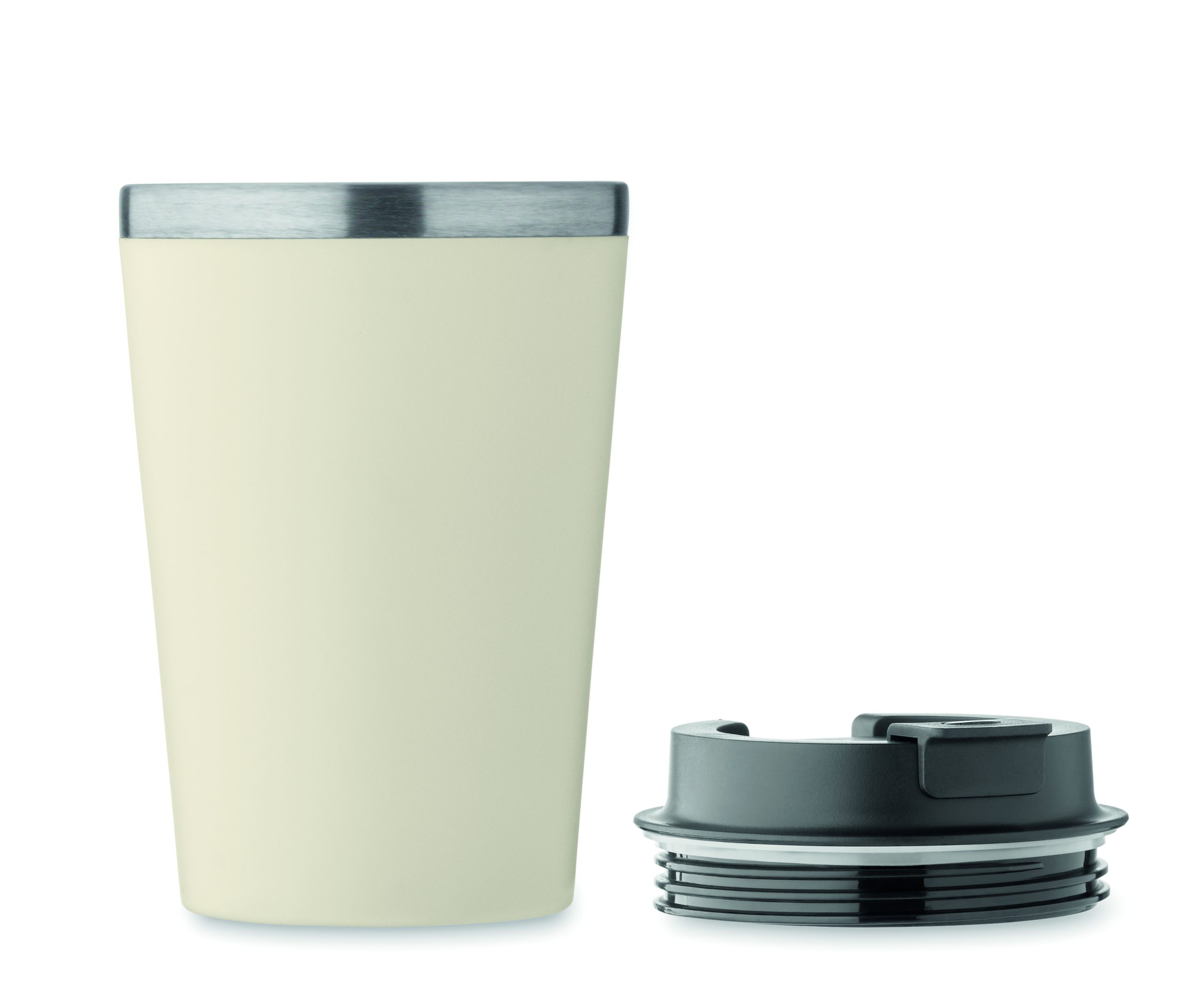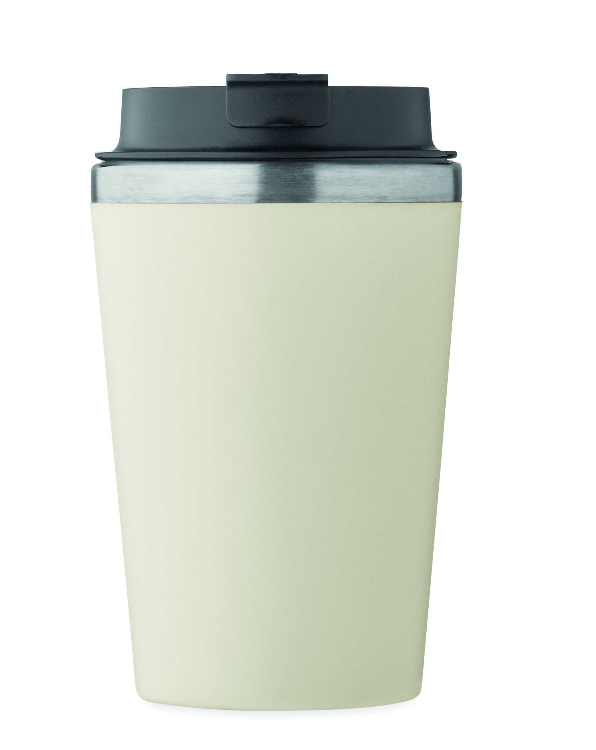 Kubek z podwójną ścianką. Zewnętrzna z PP i wewnętrzna ze stali nierdzewnej z recyklingu (90% stali nierdzewnej z recyklingu i 10% stali nierdzewnej) z ceramiczną powłoką wewnętrzną. Nie przecieka. Pojemność: 350 ml.