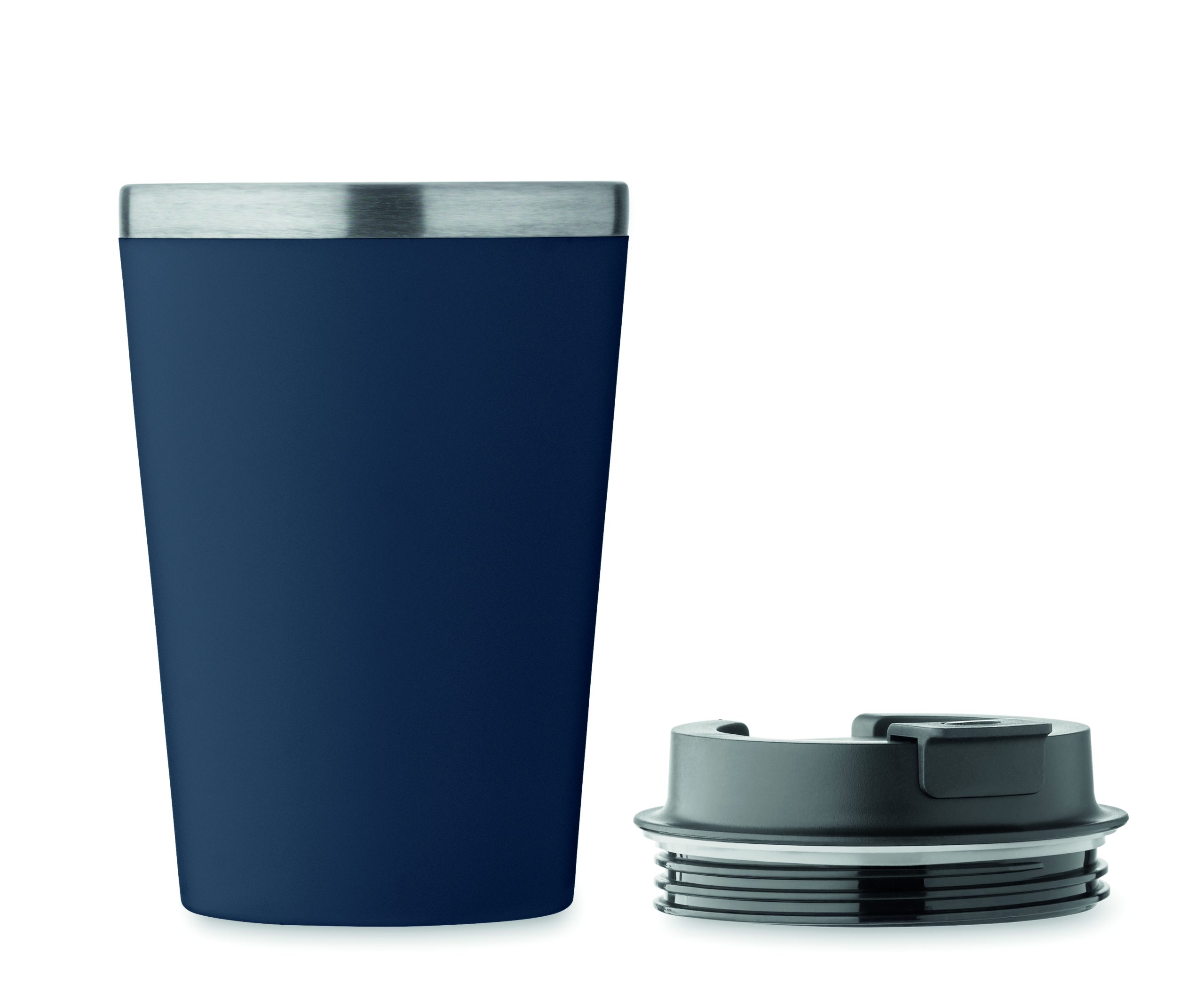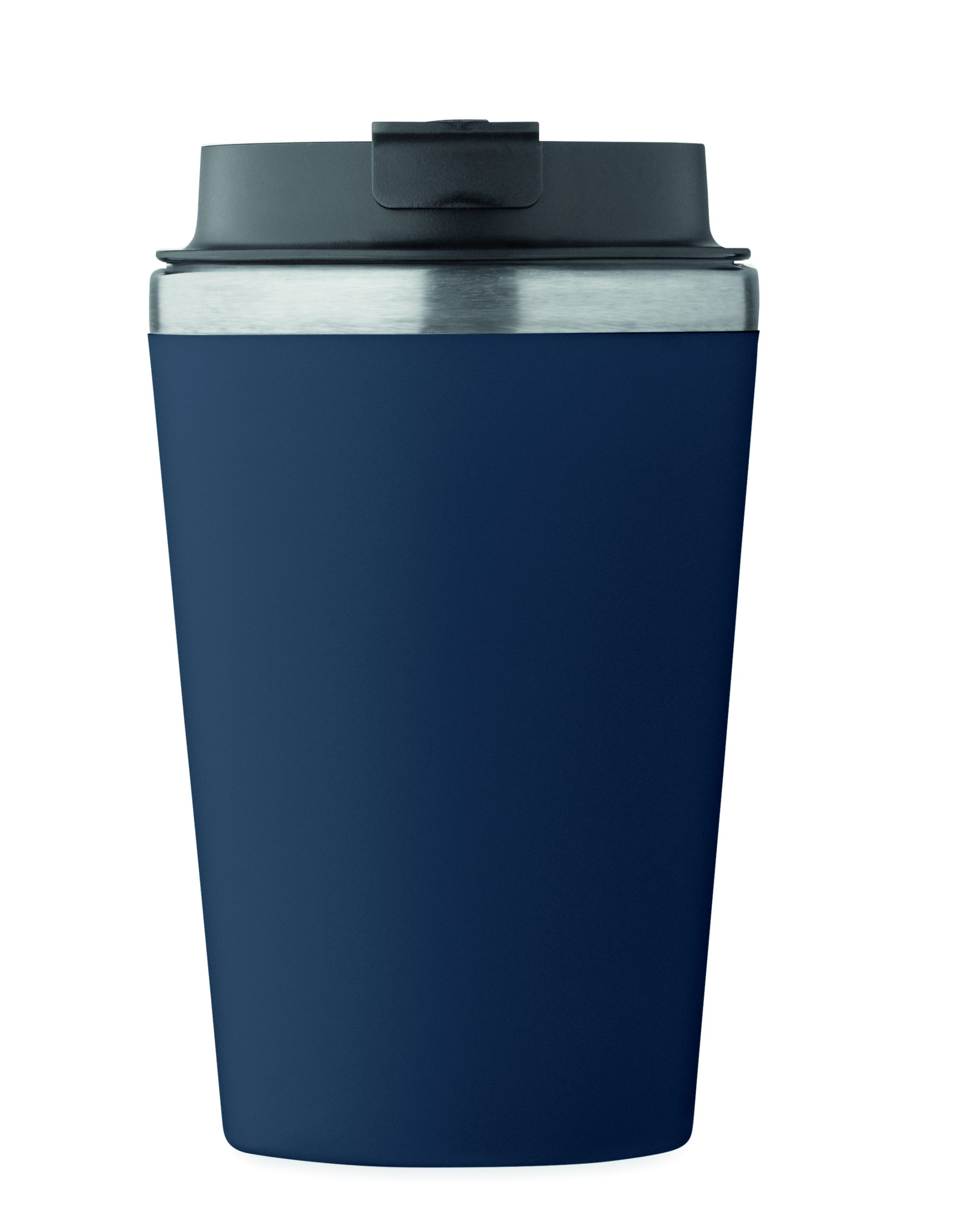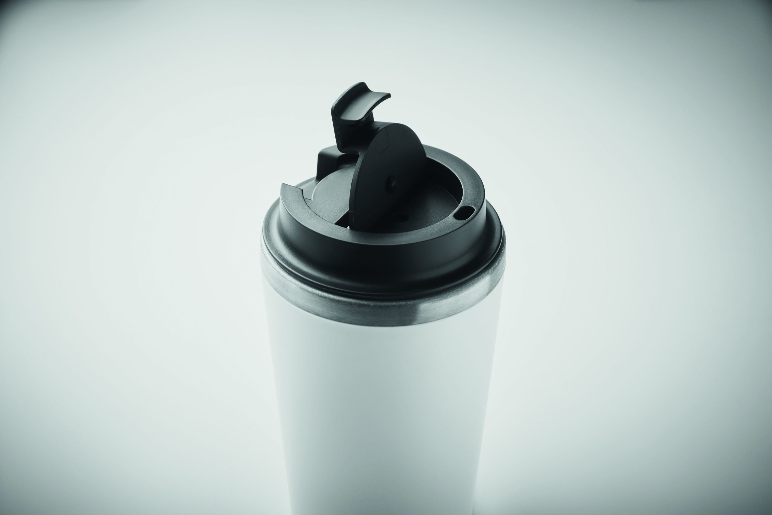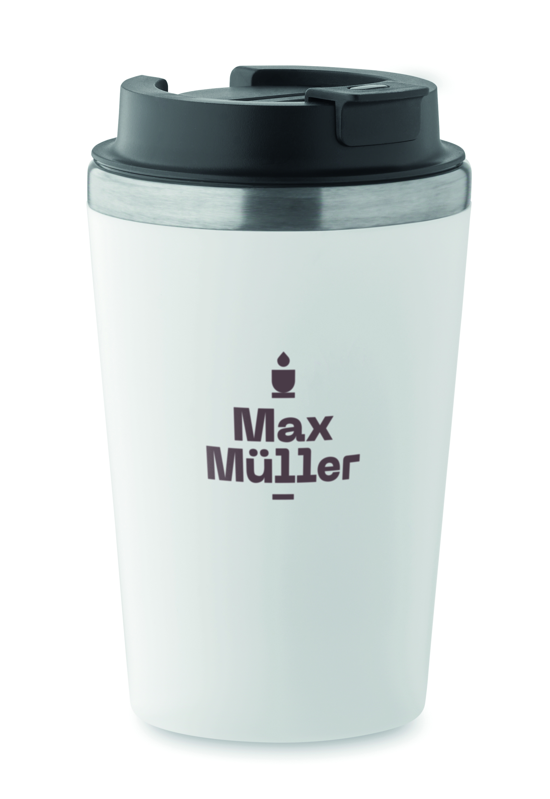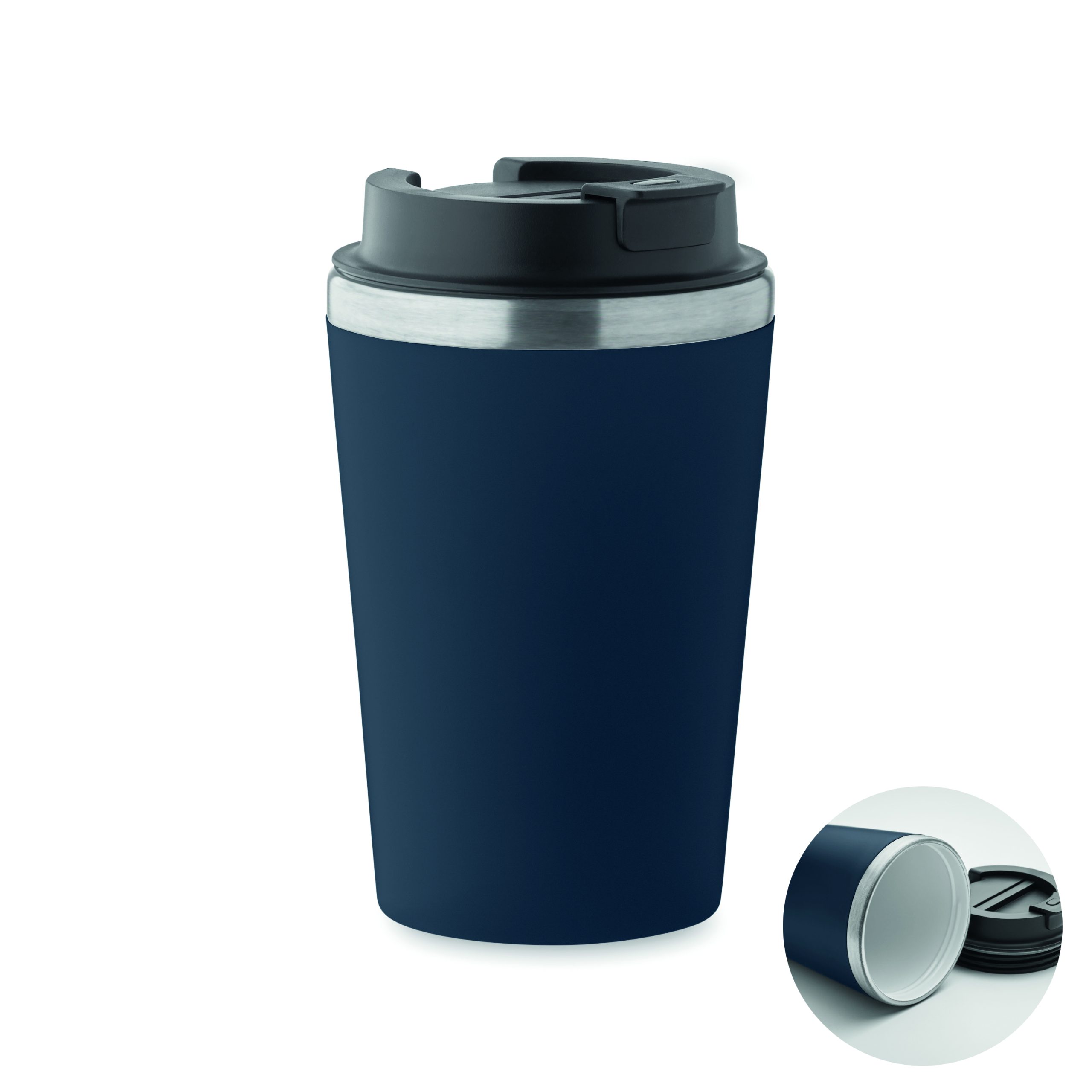 Kubek z podwójną ścianką. Zewnętrzna z PP i wewnętrzna ze stali nierdzewnej z recyklingu (90% stali nierdzewnej z recyklingu i 10% stali nierdzewnej) z ceramiczną powłoką wewnętrzną. Nie przecieka. Pojemność: 350 ml.