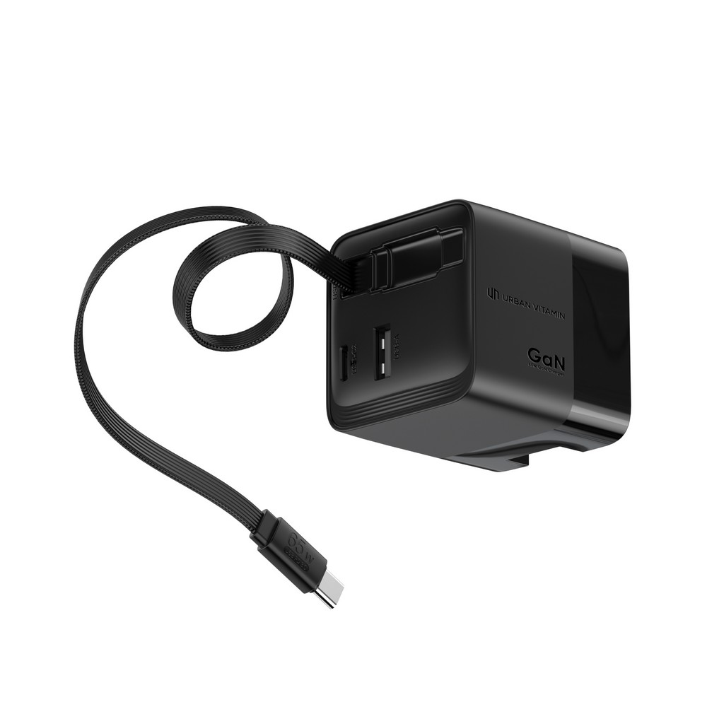 Ładowarka ścienna 65W, adapter podróżny, dzięki dużej mocy ładowania do 65W ładowarka nadaje się do ładowania laptopów, zintegrowany, zwijany kabel USB-C o długości 80 cm, wyjścia USB-C i USB A, całkowita zawartość materiałów z recyklingu obliczona na podstawie wagi całkowitej przedmiotu: 18%, kabel w komplecie
