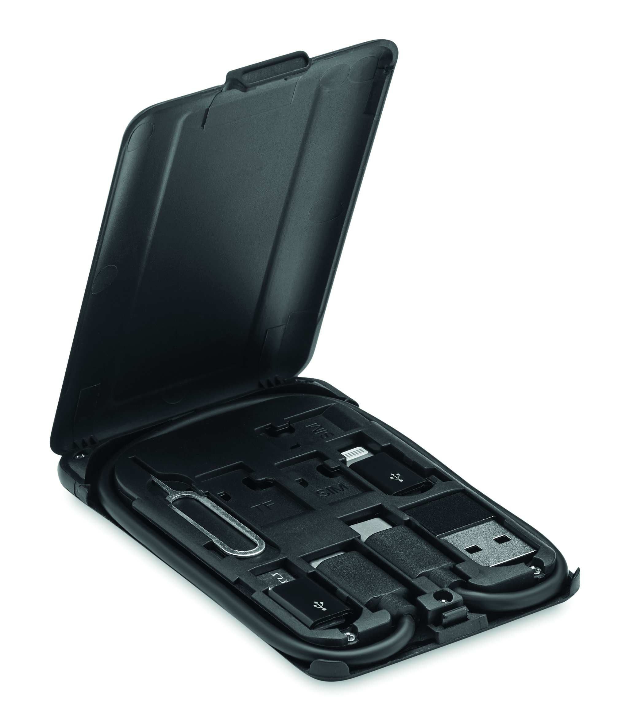 Karta do przechowywania kabli z bezprzewodową ładowarką 15W i funkcją podstawki pod telefon. Typ C do C z konwersją do microB, typ C do AC, przyrząd do wyjmowania SIM, miejsce na 2 Nano i 1 kartę TF.