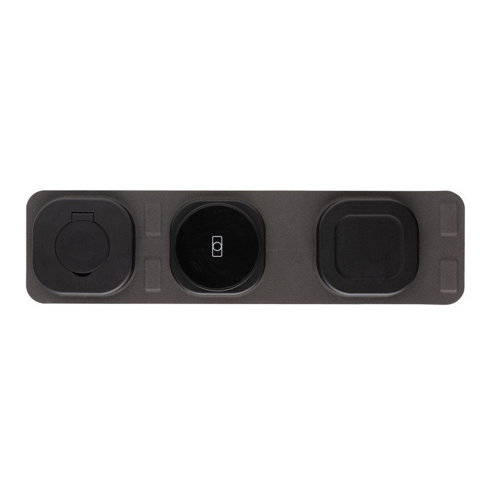 Ładowarka bezprzewodowa 3 w 1, magnetyczna ładowarka bezprzewodowa do telefonu 15W, ładowarka bezprzewodowa 5W do słuchawek i innej drobnej elektroniki, ładowarka bezprzewodowa 2,5W do smartwatcha (działa tylko z urządzeniami iOS), składana, działa z telefonami posiadającymi możliwość ładowania indukcyjnego, wykonana z ABS z recyklingu z certyfikatem RCS, całkowita zawartość materiałów z recyklingu obliczona w oparciu o wagę całkowitą przedmiotu: 38%, wejście 9V/1.1A, wyjścia: 9V/1.1A, 5V/1A, 5V/0.5A, w pudełku z papieru kraftowego z certyfikatem FSC®, ślad węglowy produktu: 1,95 kg CO2
