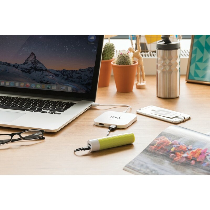 Ładowarka bezprzewodowa 5W, wykonana z ABS, dwa wyjścia USB do ładowania telefonów starszej generacji za pomocą kabla, bezprzewodowe ładowanie jest kompatybilne ze wszystkimi urządzeniami posiadającymi możliwość ładowania indukcyjnego, wejście 1A, wyjście USB 5V/1A, wyjście bezprzewodowe 5W, ślad węglowy produktu: 1,06 kg CO2
