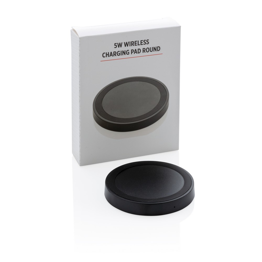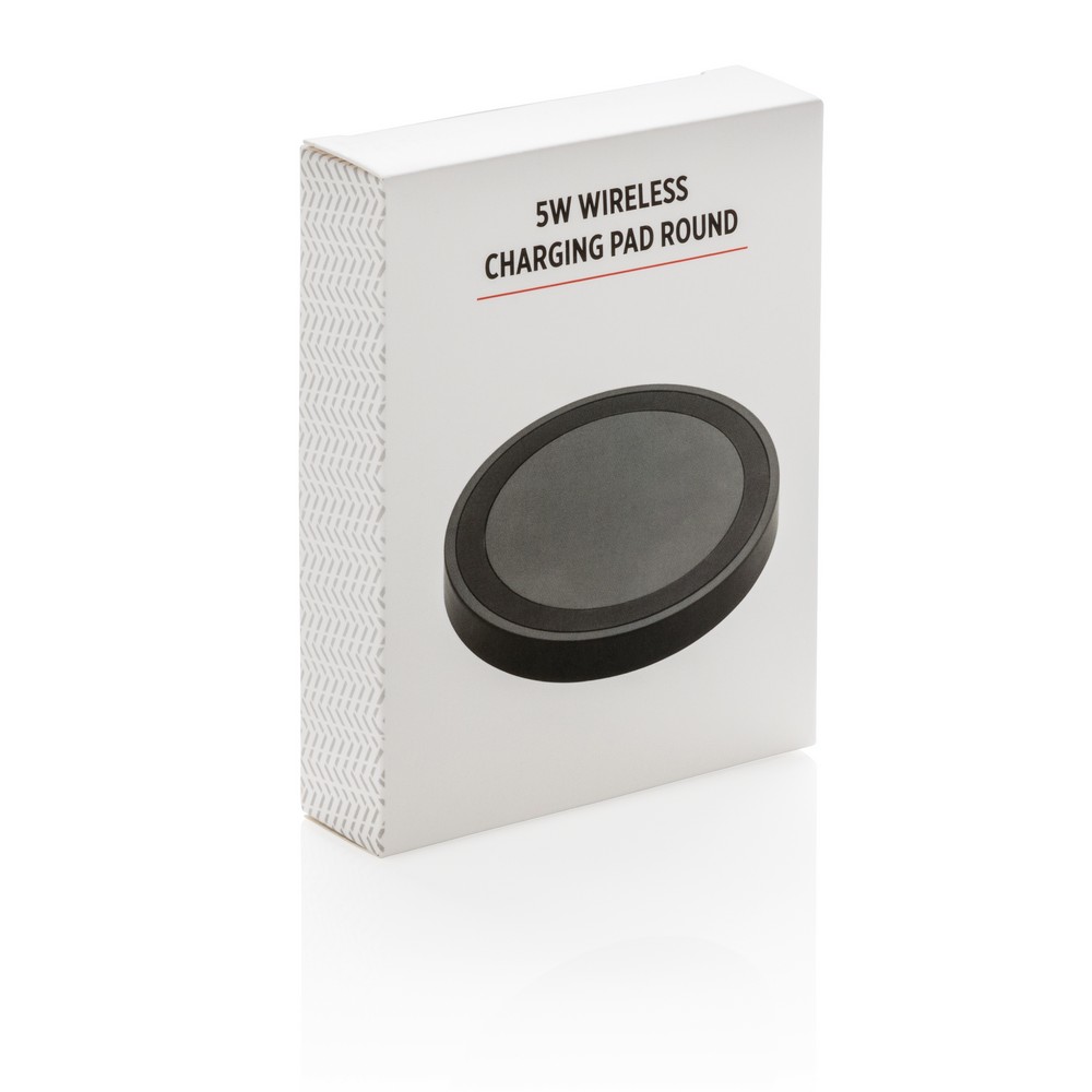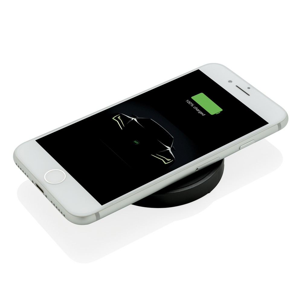 Ładowarka bezprzewodowa 5W z diodą zapalającą się podczas ładowania, silikonowy pierścień zapobiega zsuwaniu się telefonu, bezprzewodowe ładowanie jest kompatybilne ze wszystkimi urządzeniami posiadającymi możliwość ładowania indukcyjnego, wejście 5V/1.5A, wyjście bezprzewodowe 5V/1A 5W, ślad węglowy produktu: 0,78 kg CO2