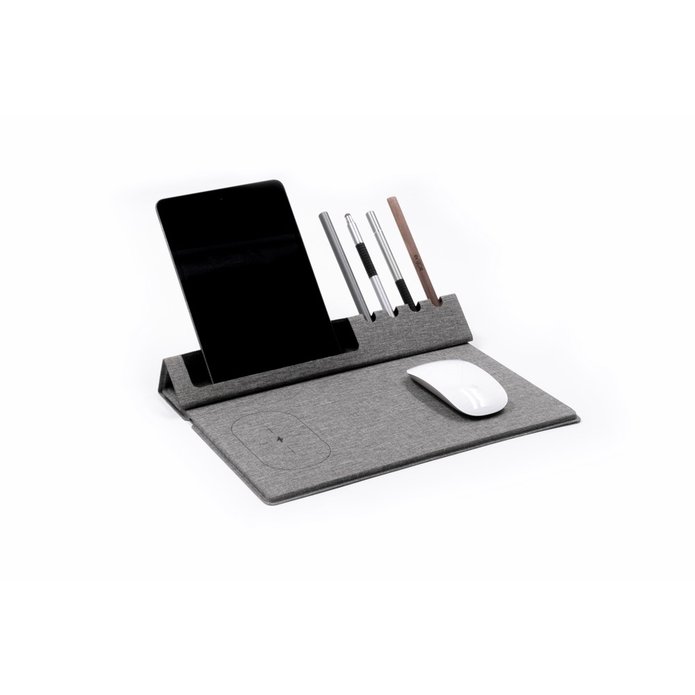 Ładowarka bezprzewodowa BrandCharger Evopad Charge, wykonana z przetworzonych powtórnie butelek PET, bezprzewodowa ładowarka, podkładka pod mysz, uchwyt na telefon i uchwyt na długopis w jednej kompaktowej obudowie, produkt wykonany z poliestru, kartonu i RPET
